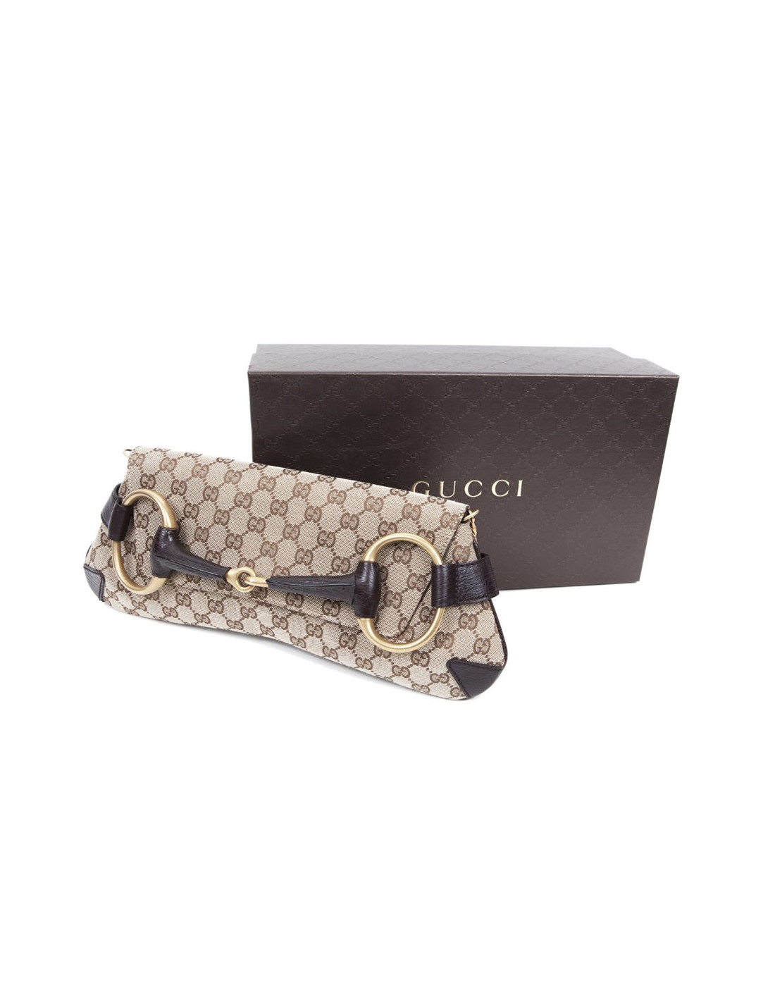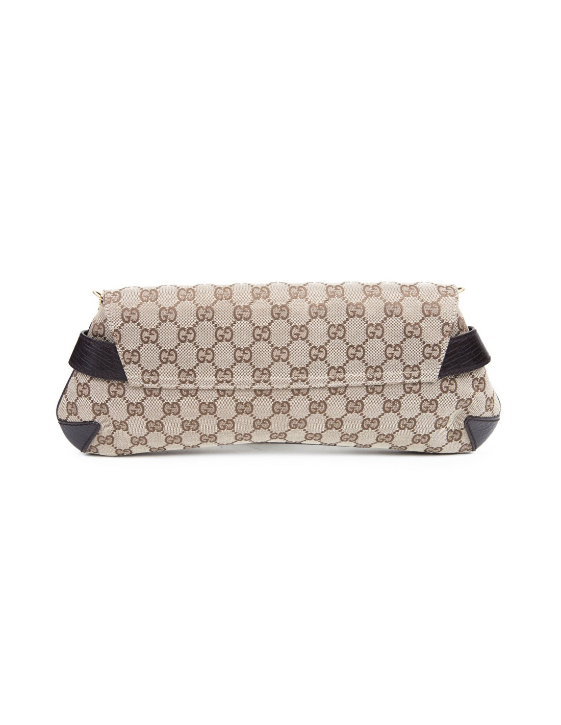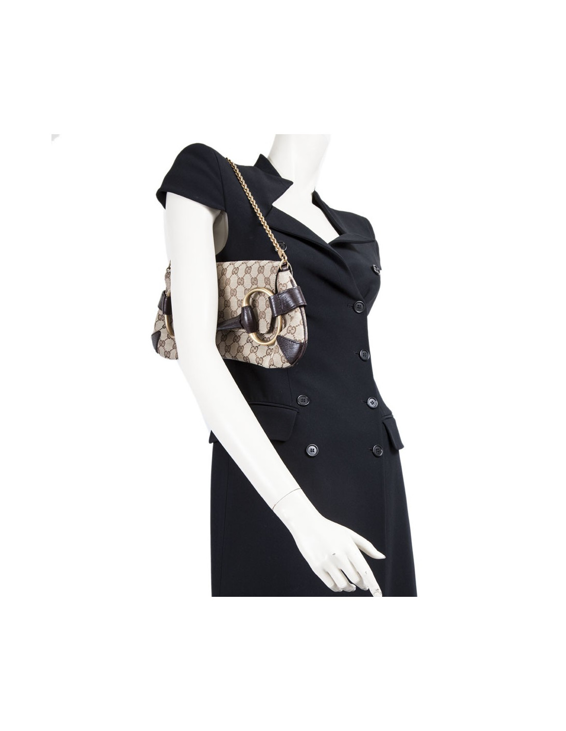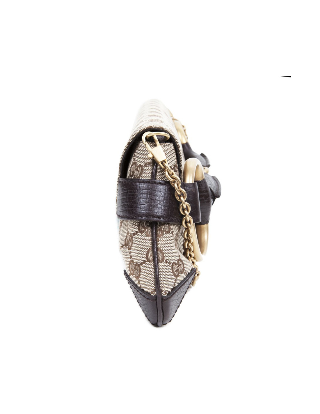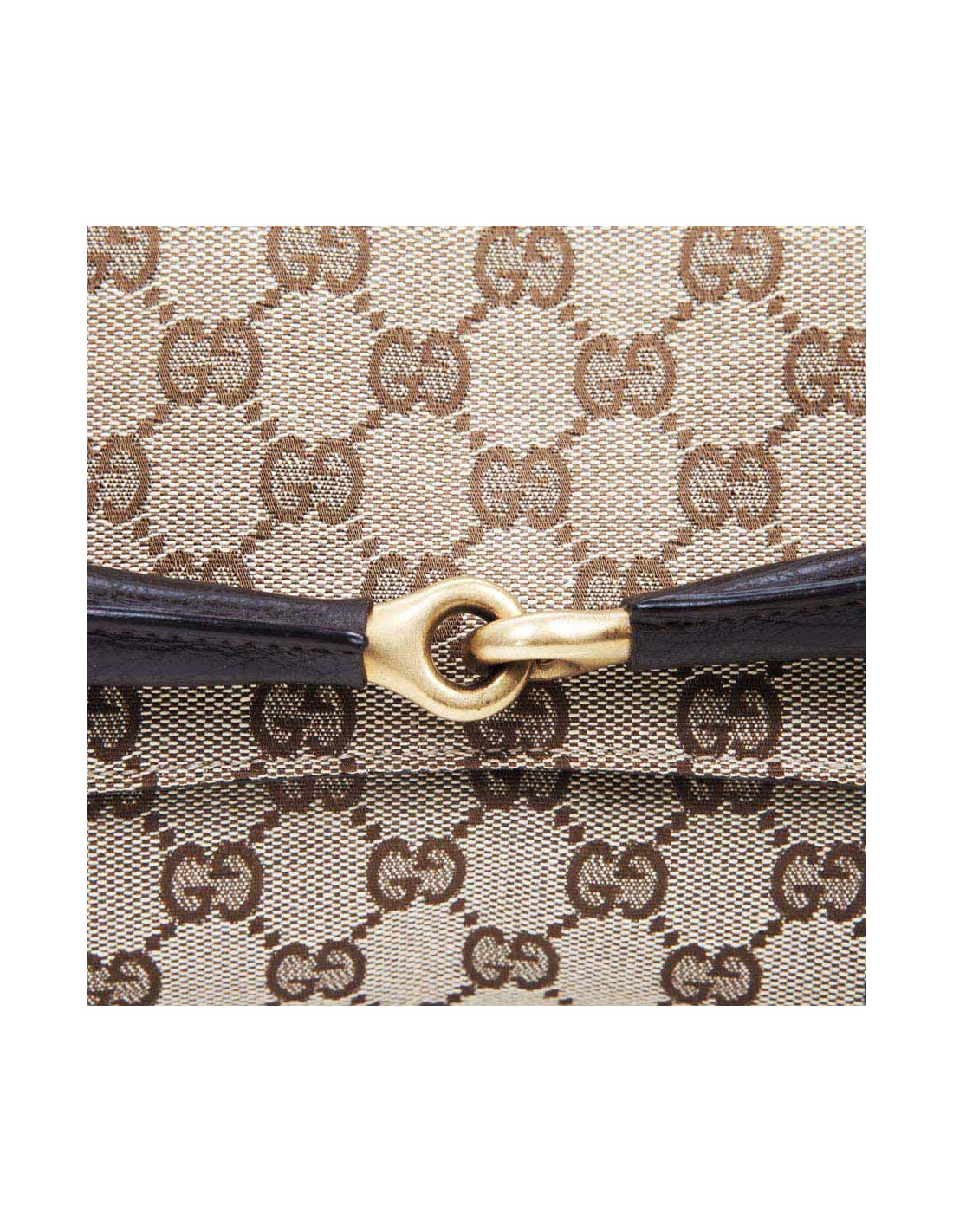 "JAWS" GUCCI bag in monogram canvas. Coppery gold jewelry. Inside doubled Brown textile with a pocket. Under l "brand label: serial number 120135 - 001013;