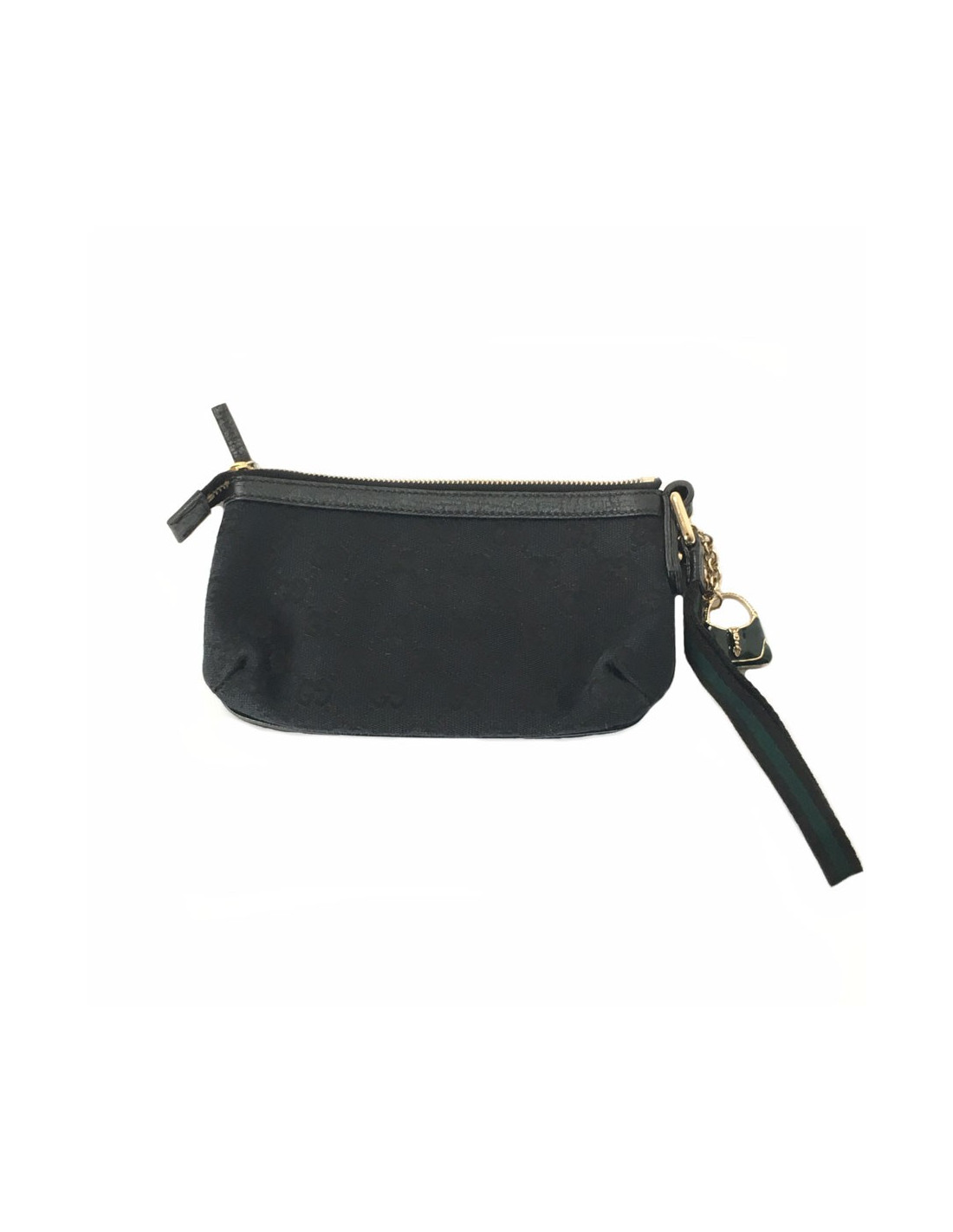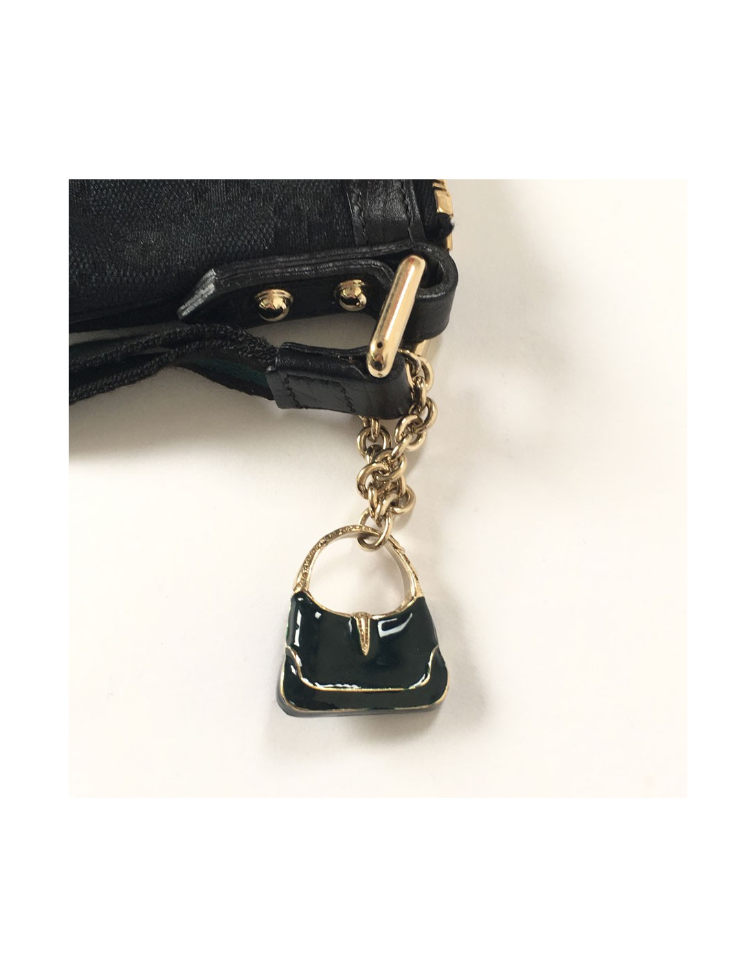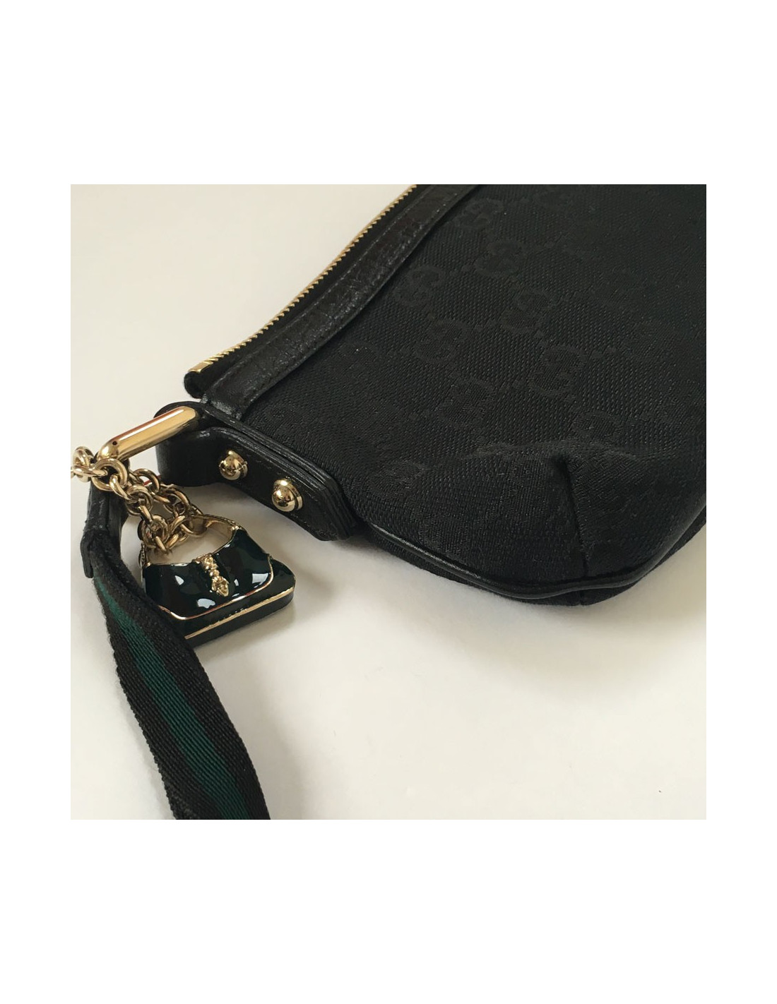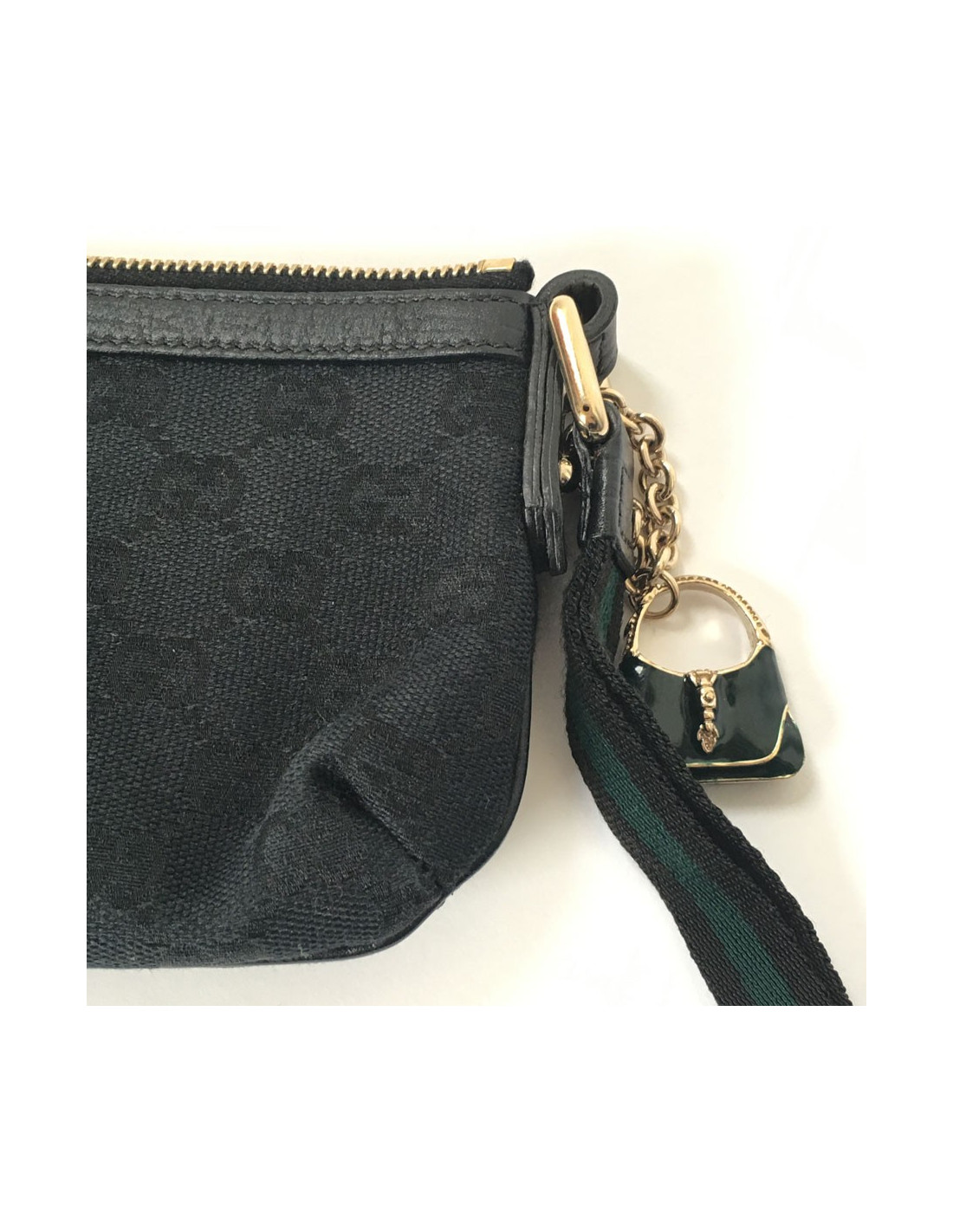 GUCCI wallet zip black monogram fabric. A charm "bag" metal color pale gold is attached to the zipper. Inside, black fabric, lies a small pocket. Small Cove for the wrist.