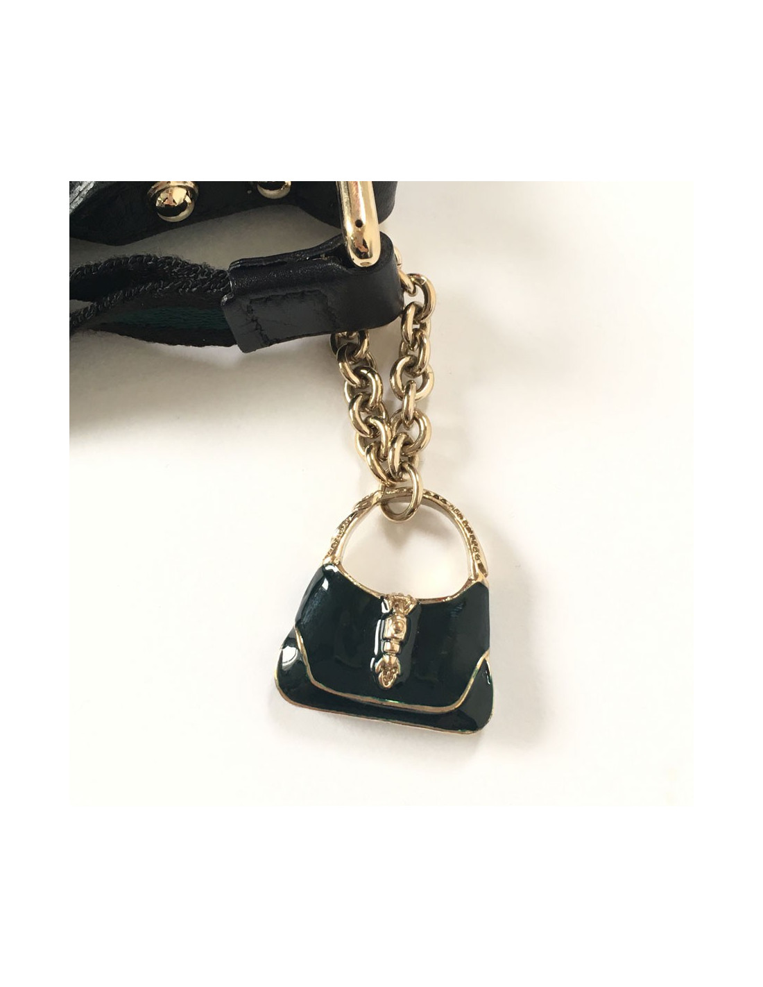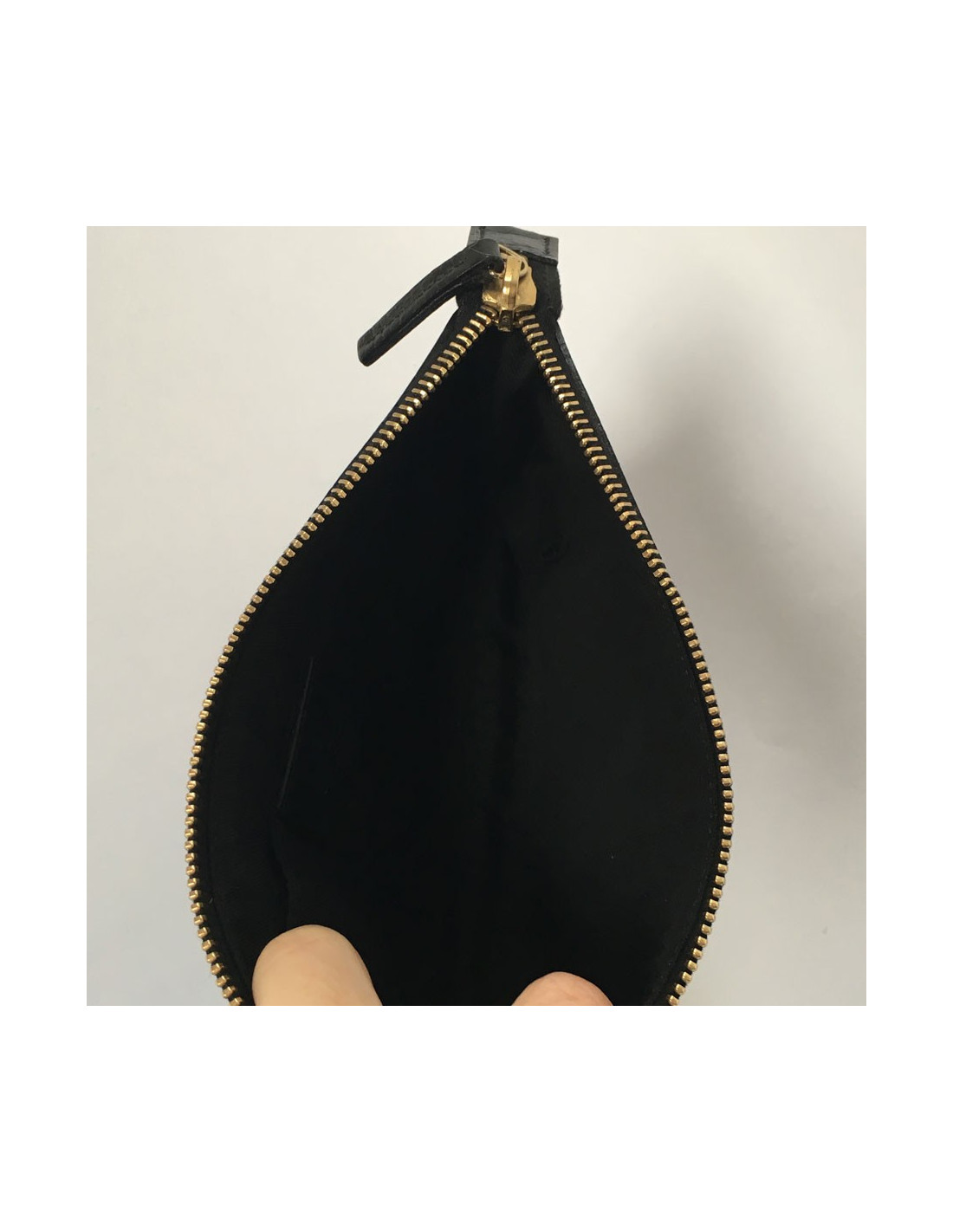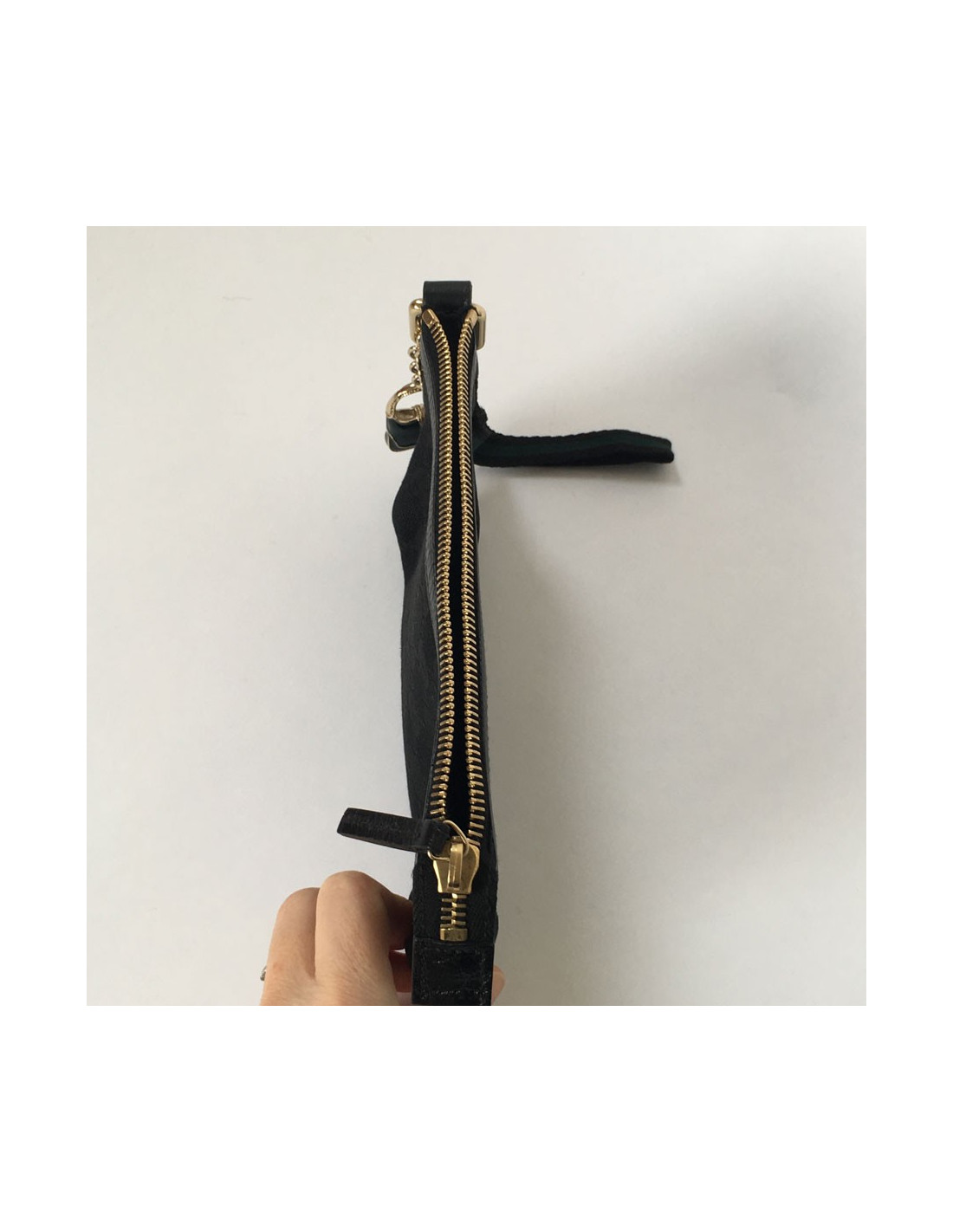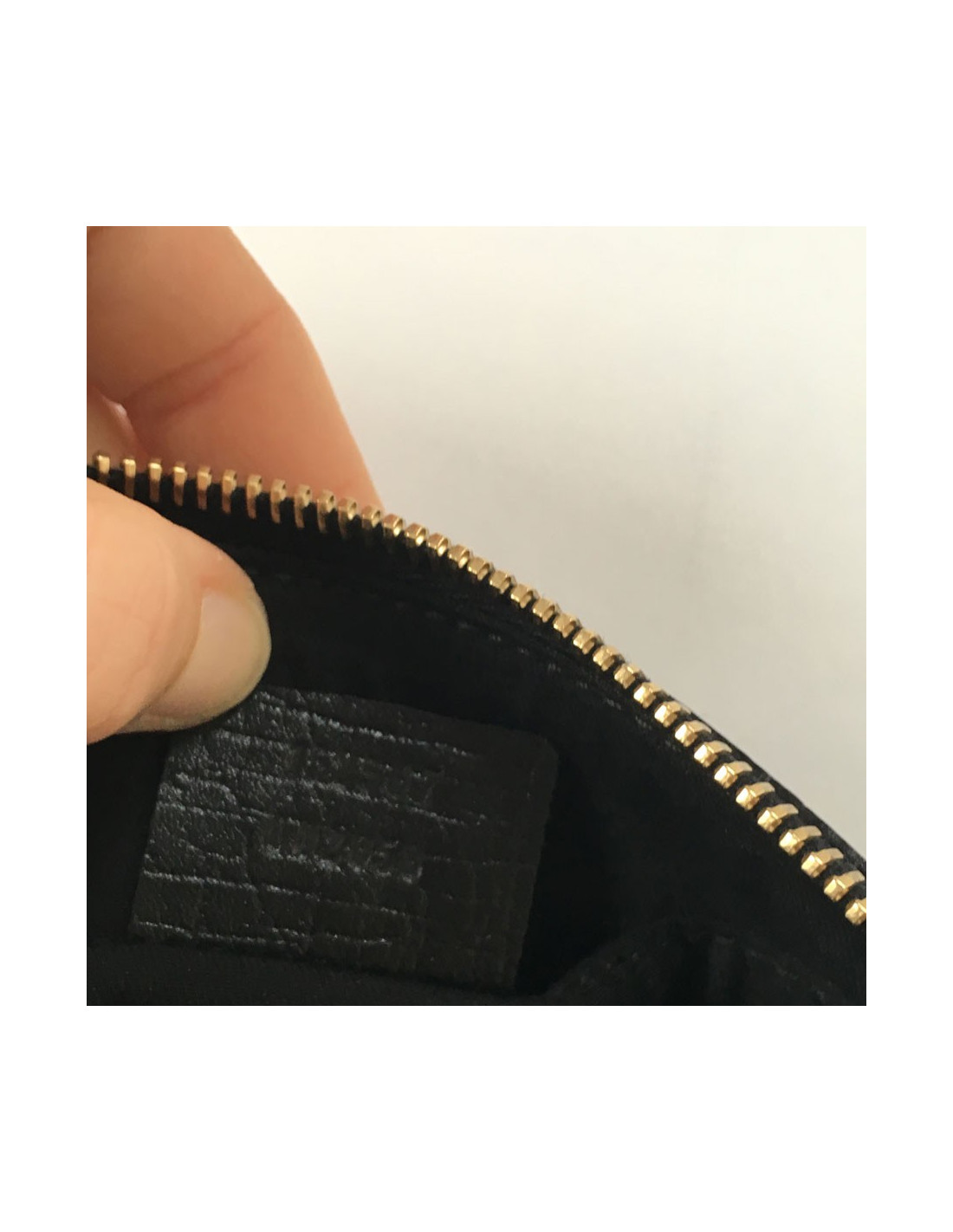 GUCCI wallet zip black monogram fabric. A charm "bag" metal color pale gold is attached to the zipper. Inside, black fabric, lies a small pocket. Small Cove for the wrist.