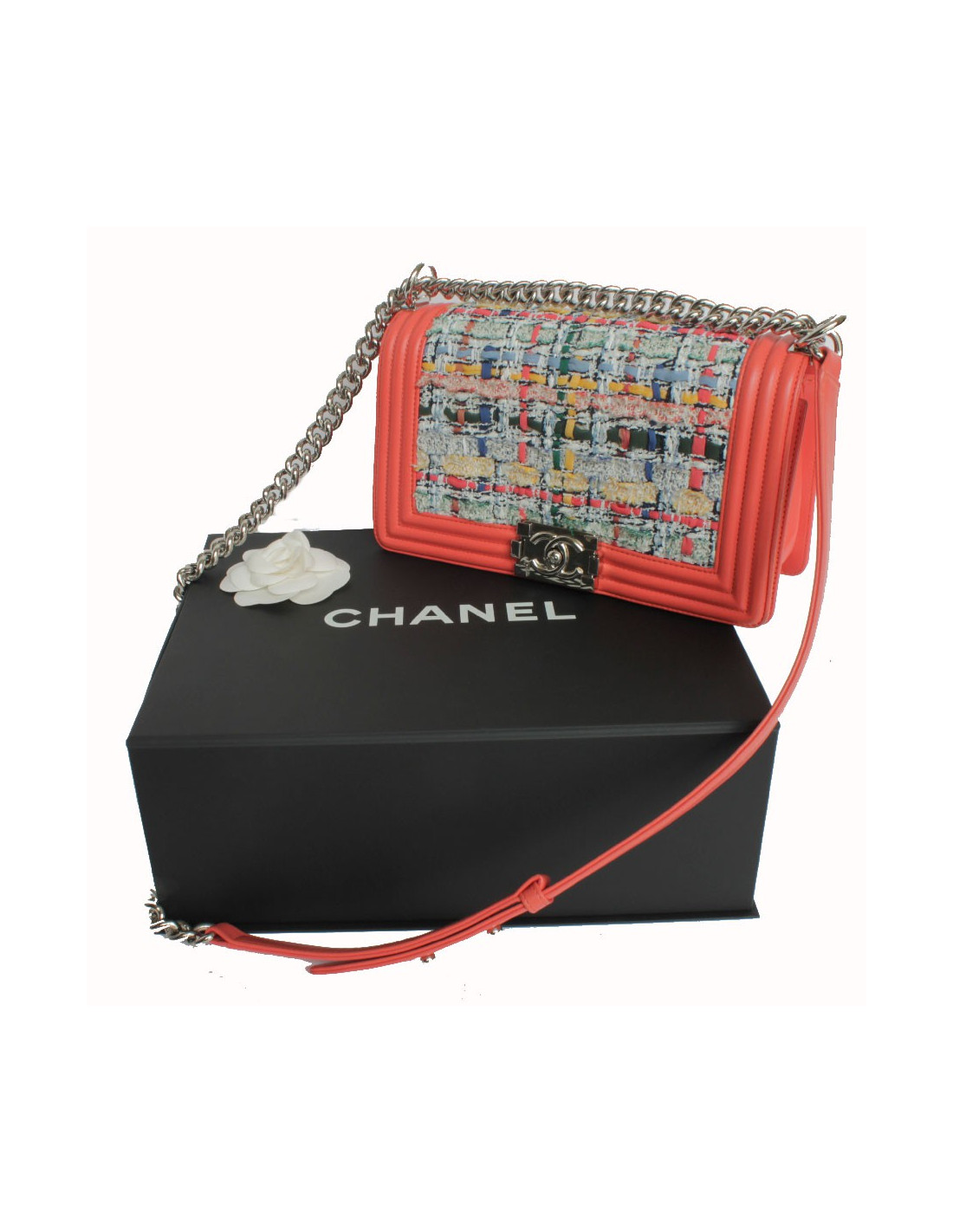 Limited series. Bag 'Boy' in the House of Chanel multicolor tweed. Borders coral smooth leather. Silver jewelry. Door shoulder or crossover. Hologram: 2089... No authenticity card. The Interior is in coral fabric with a patch pocket. In very good condition. Very light wear to the back and corners. See Photos.