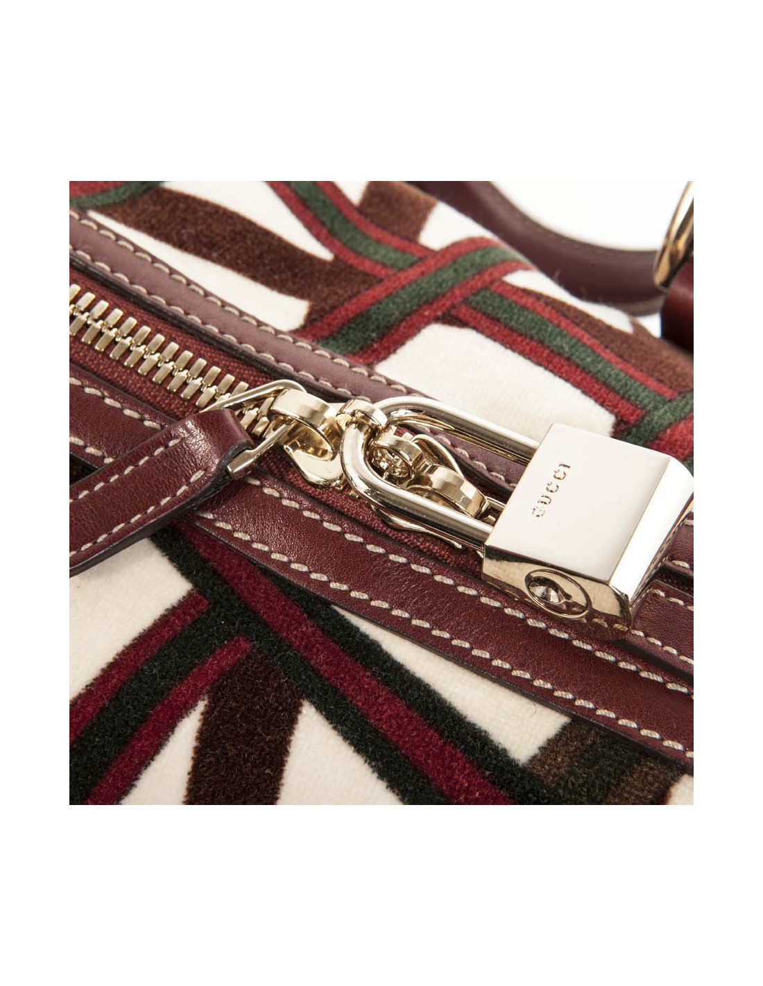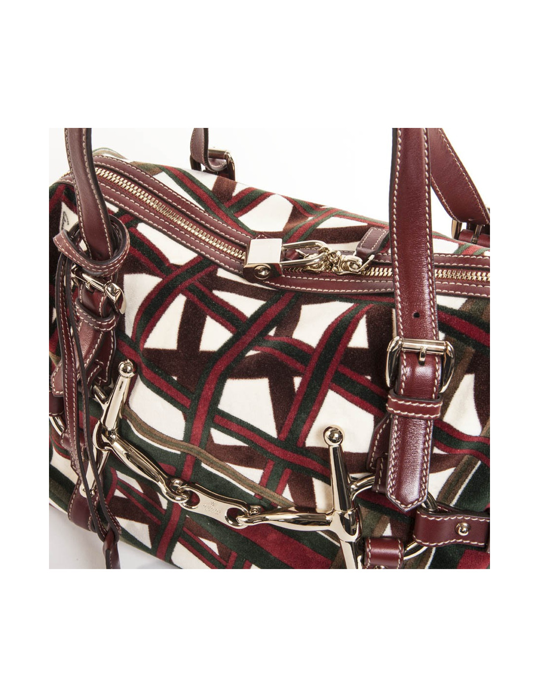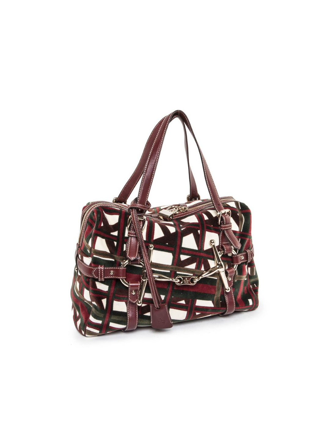 Bag shopping bag in Velvet reasons bolduc and the Gucci Burgundy leather. Pale golden jewelry. At the front, the "JAWS" emblem of the House of Gucci. Zipped. The Interior is in Brown fabric with a large zipped pocket and a pocket for smartphone. In very good condition.