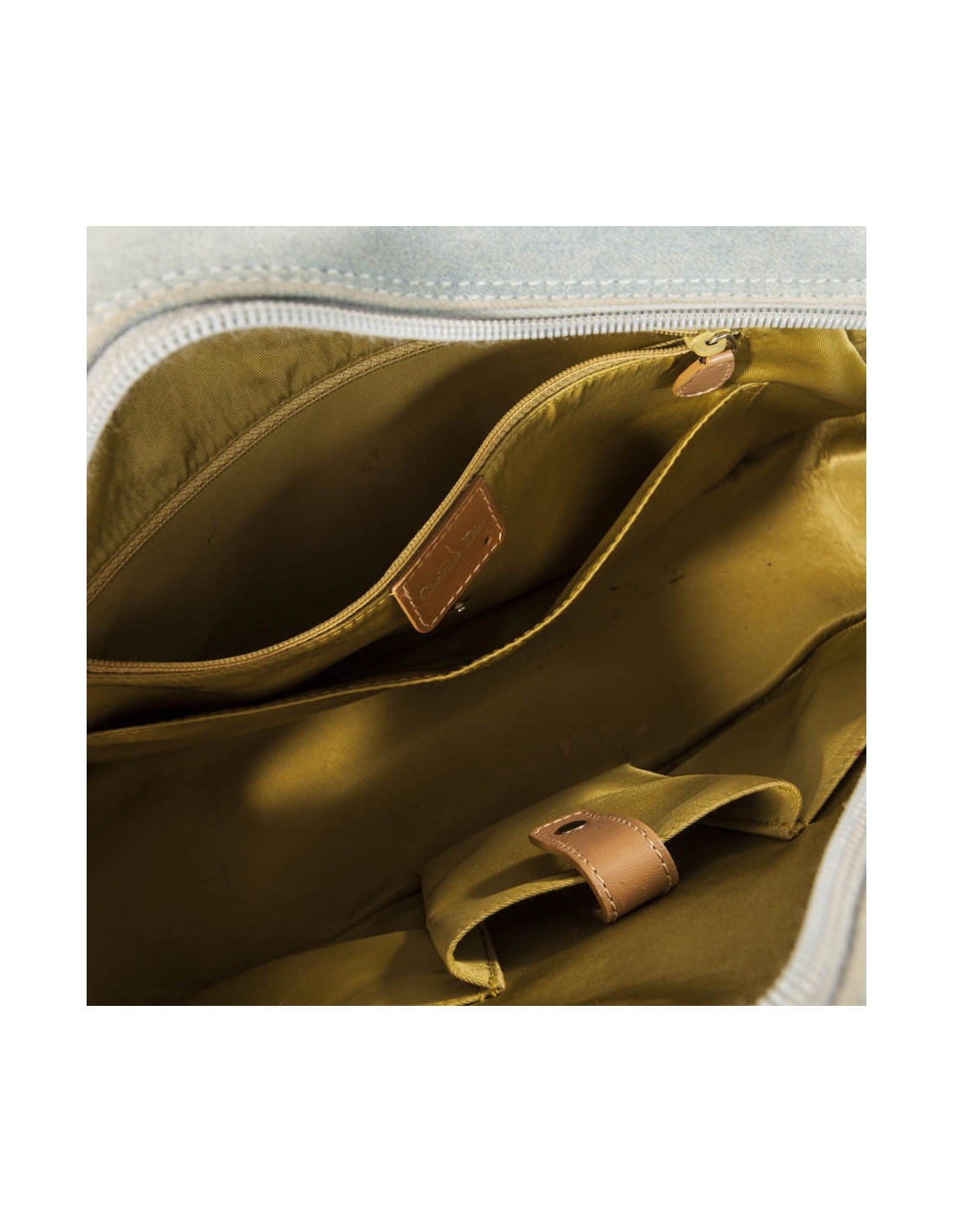 Bag Christian Dior model saddle bowling, canvas light blue jeans, Cove and stitching in beige leather and silver jewelry. It closes with a large zipper, one of the two zip is fixed because hooked by the lock (the key is lost) but it can be closed using the other zip. The two front pockets close by Velcro strips. Inside is green anise Satin Canvas, there are 4 small pockets, a zippered pocket and a large central. (Comes from the balances).p > Serial number on the label inside: MA-0071 His general condition is good, it has a few slight use marks (see pictures). Dimensions: 40 x 25 x 13 cm Delivered in a dustbag Valois Vintage Paris