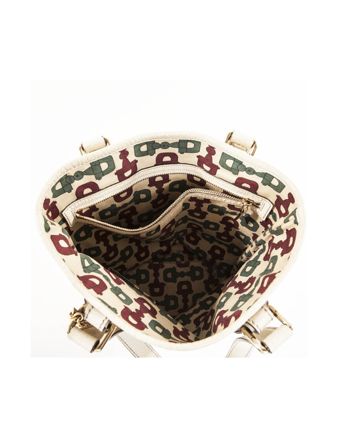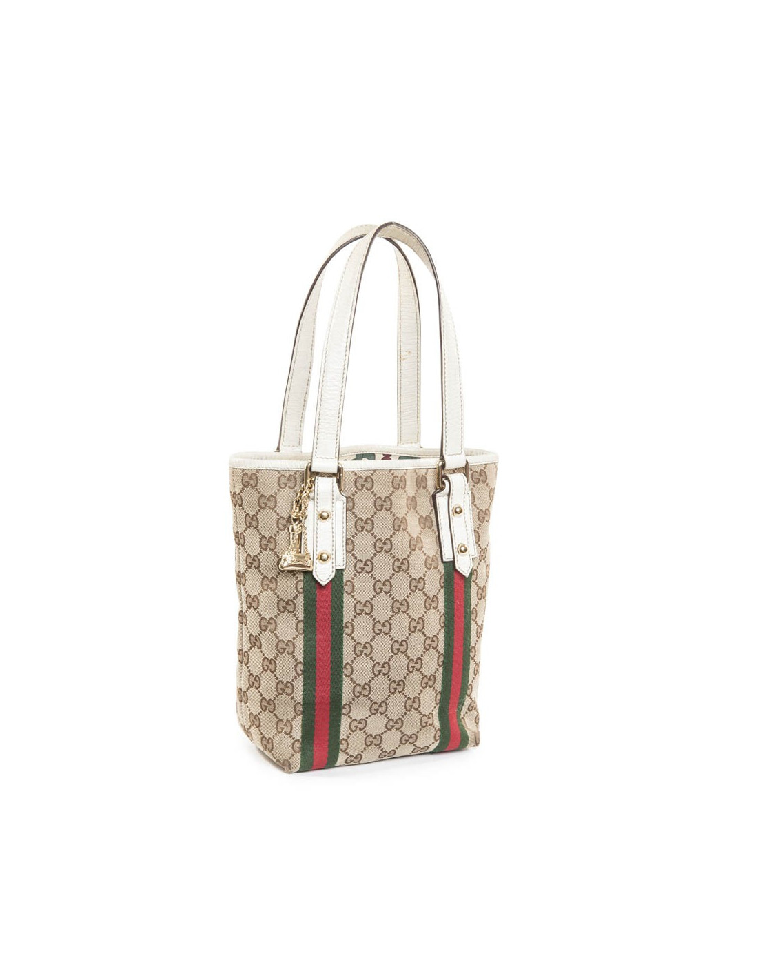 Gucci canvas monogram and ivory leather vintage bag. Charms hanging from the bag Gucci representing a "JAWS" bag and a cavalier boot gold metal.