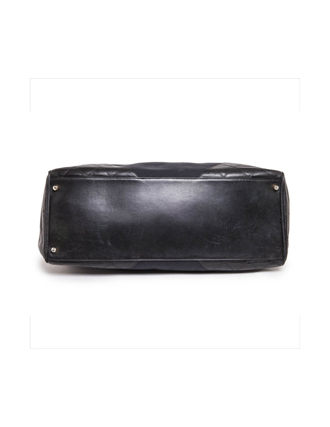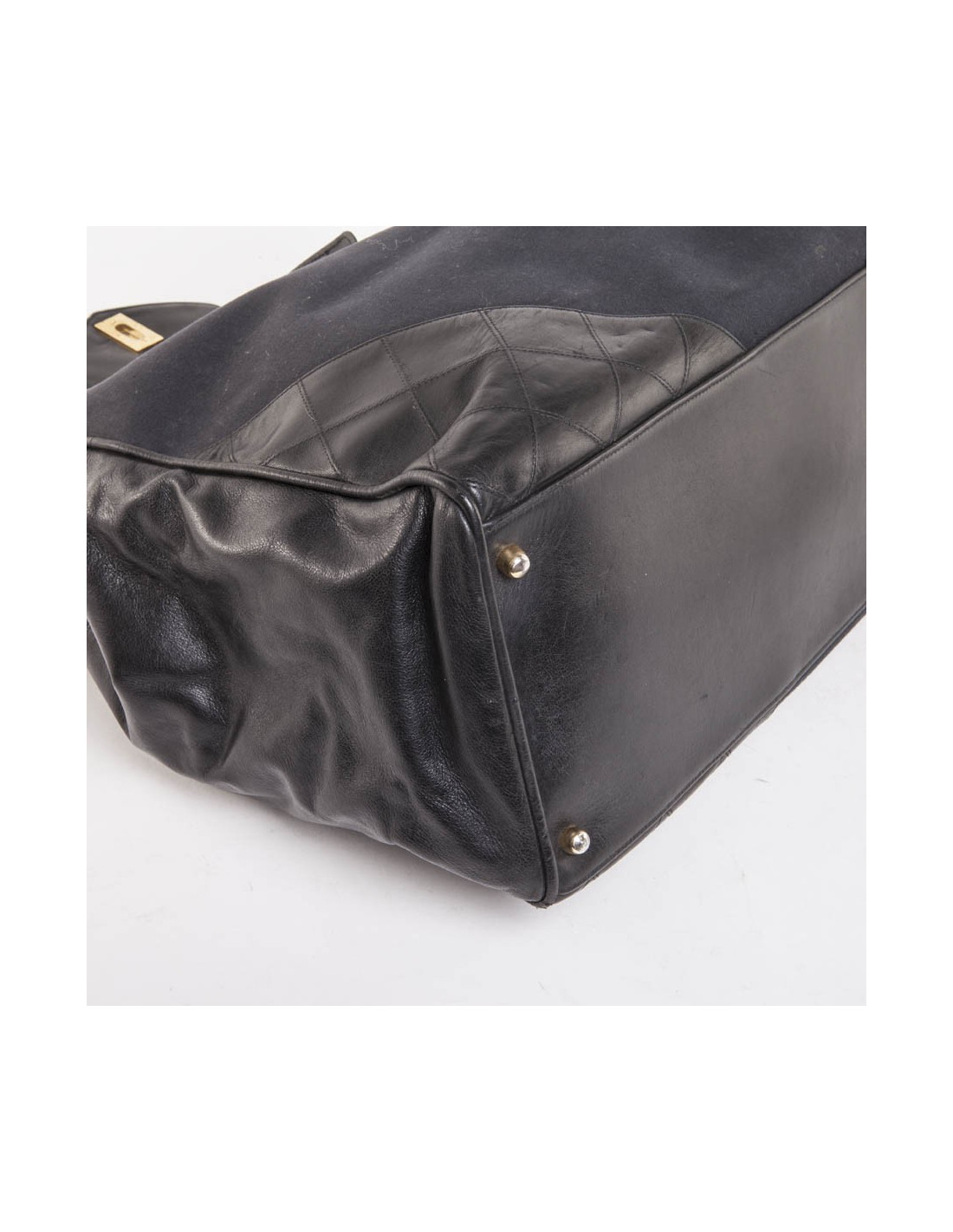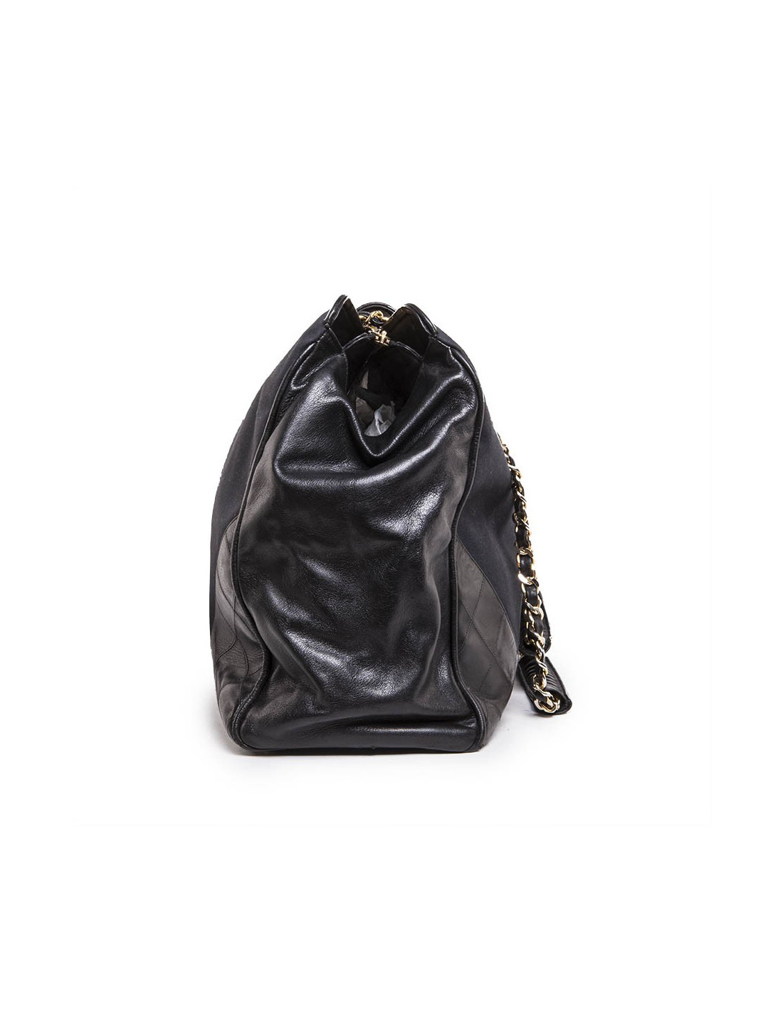 Vintage canvas and black leather Chanel tote bag. Golden jewelry. Zipped. Clasp CC. Inside, leather, 3 bellows. A lot of storage space. No hologram because article vintage. In very good condition. Slight wear to corners under the bag. Micro scratches on jewellery.