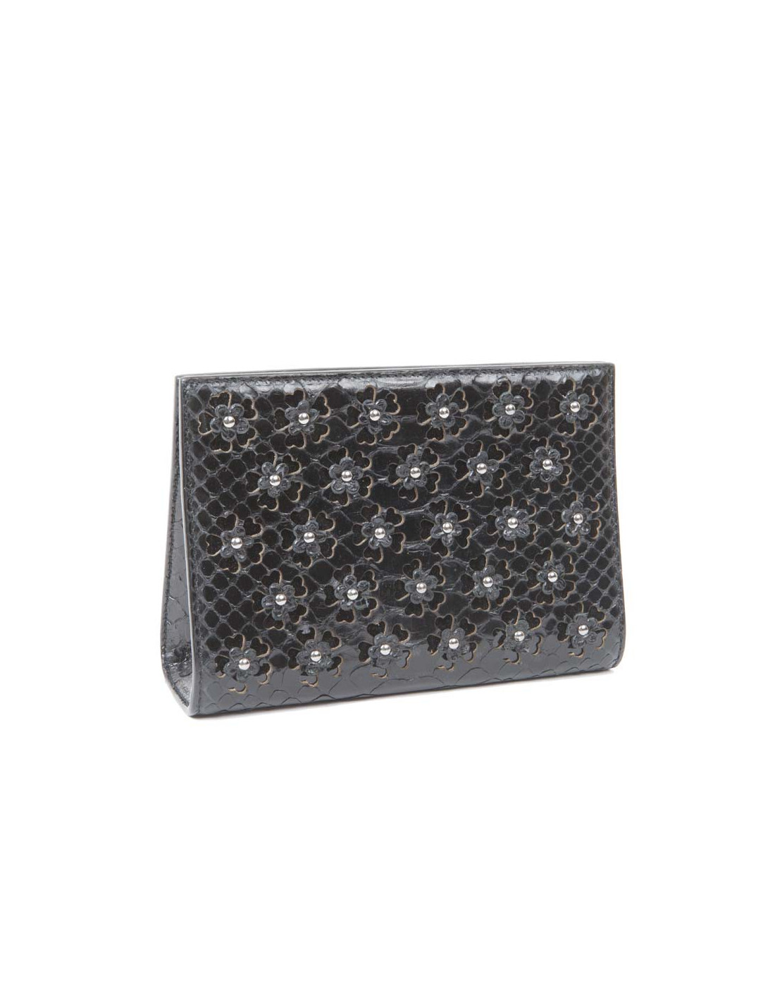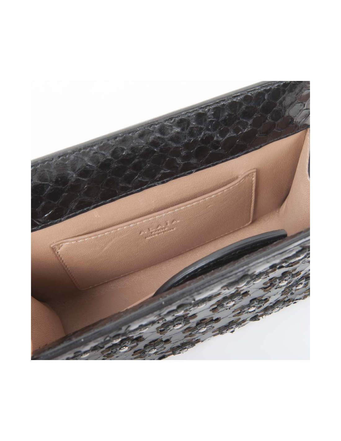 Cover in the House of Alaia black python. Magnetic closure. The Interior is beige leather with 2 small plated pockets and a mirror. In very good condition.