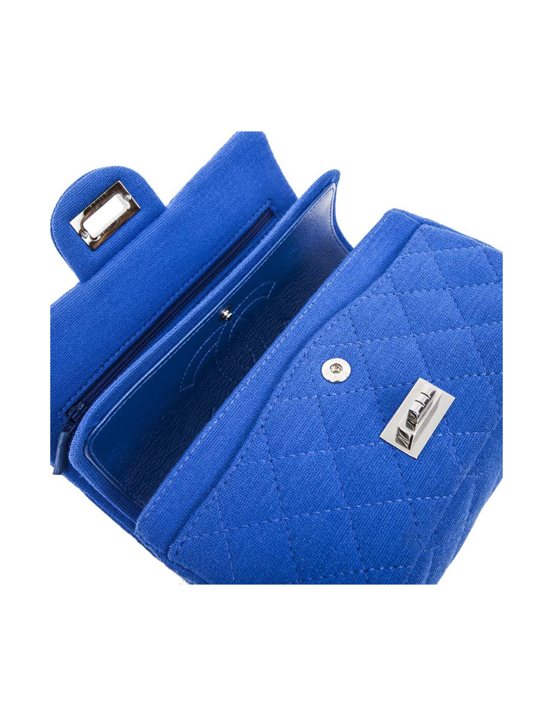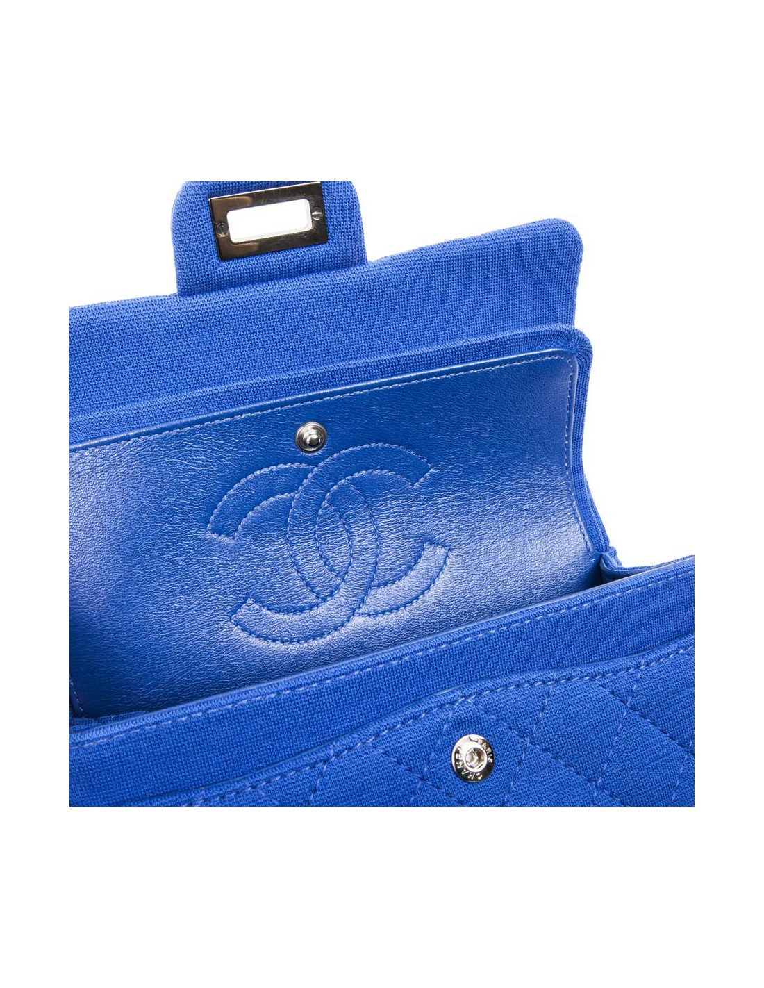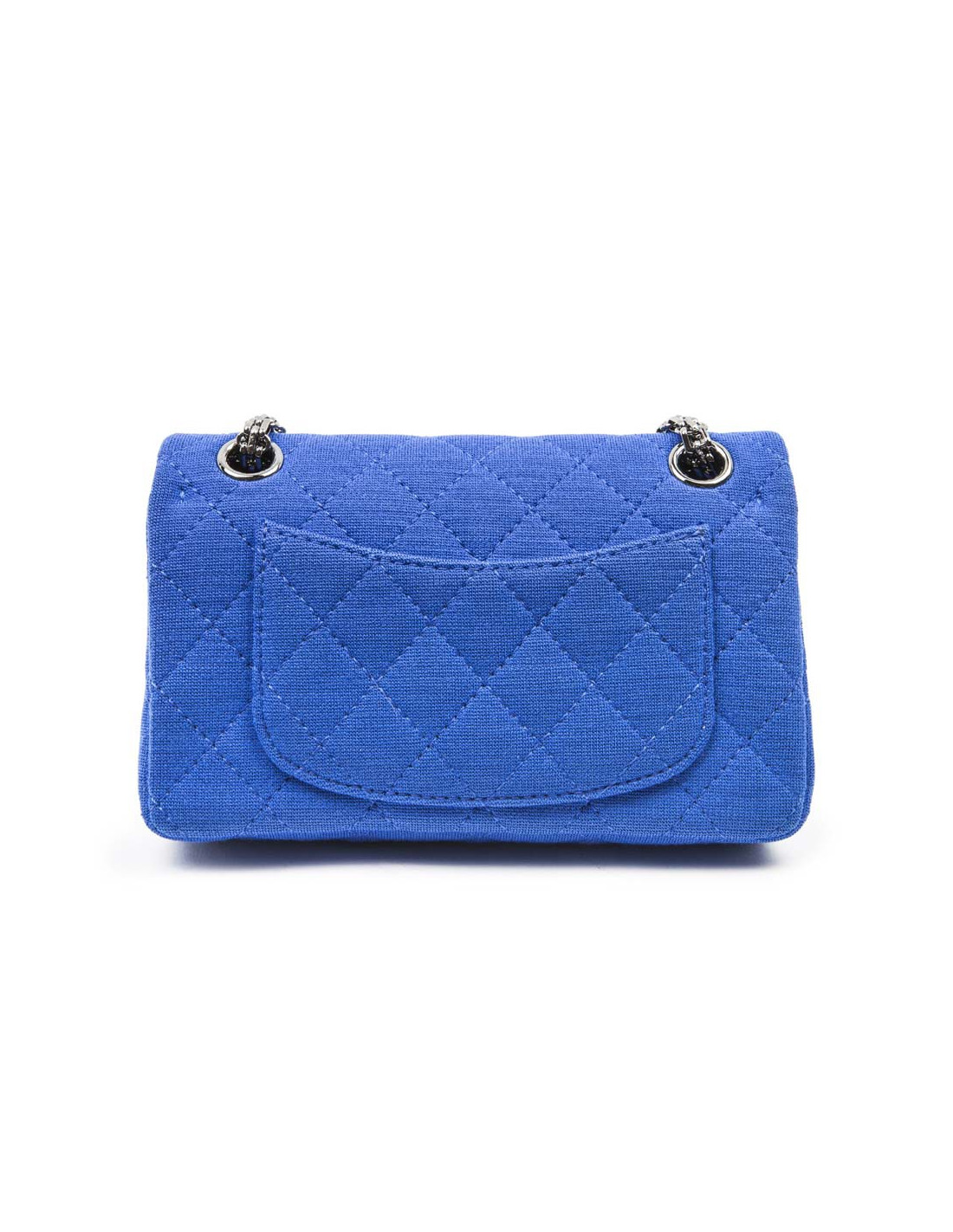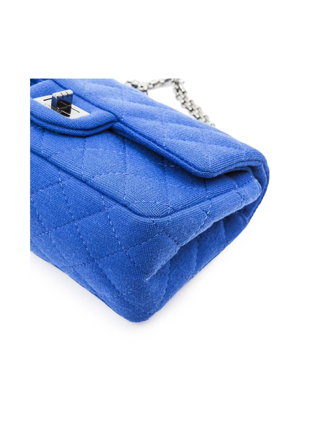 Chanel Mini double flap bag 2.55 in electric blue jersey. The hardware is made of silver-plated ruthenium.