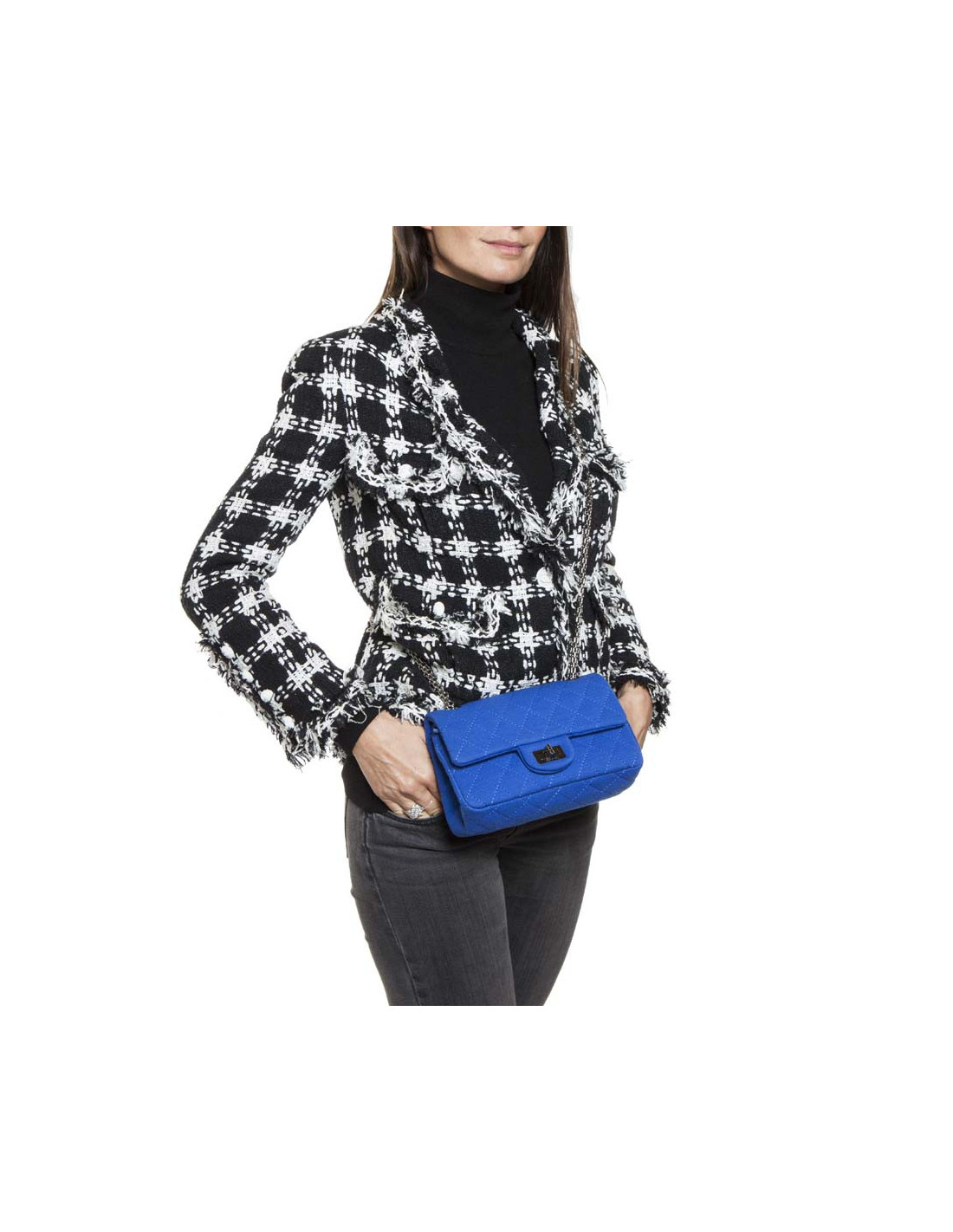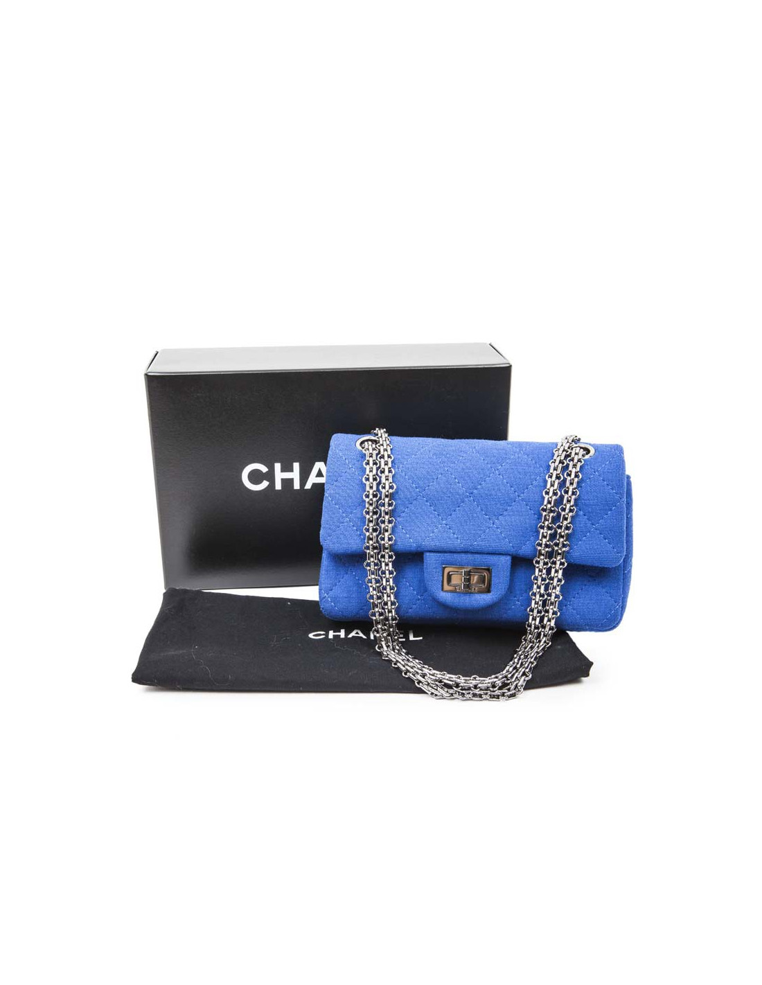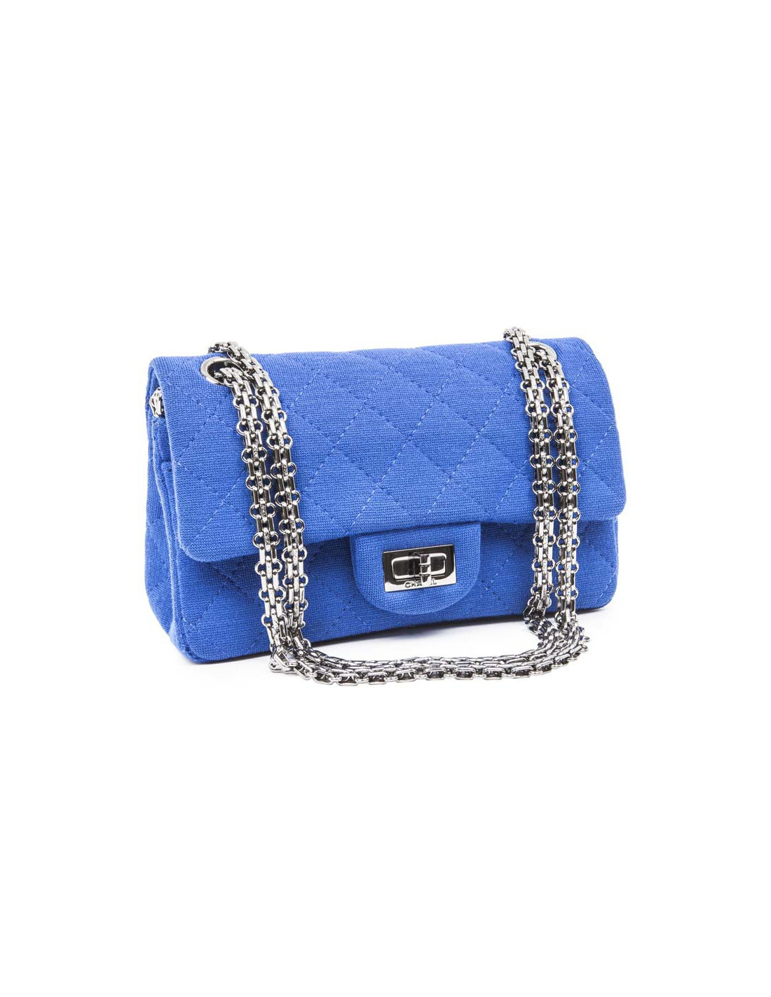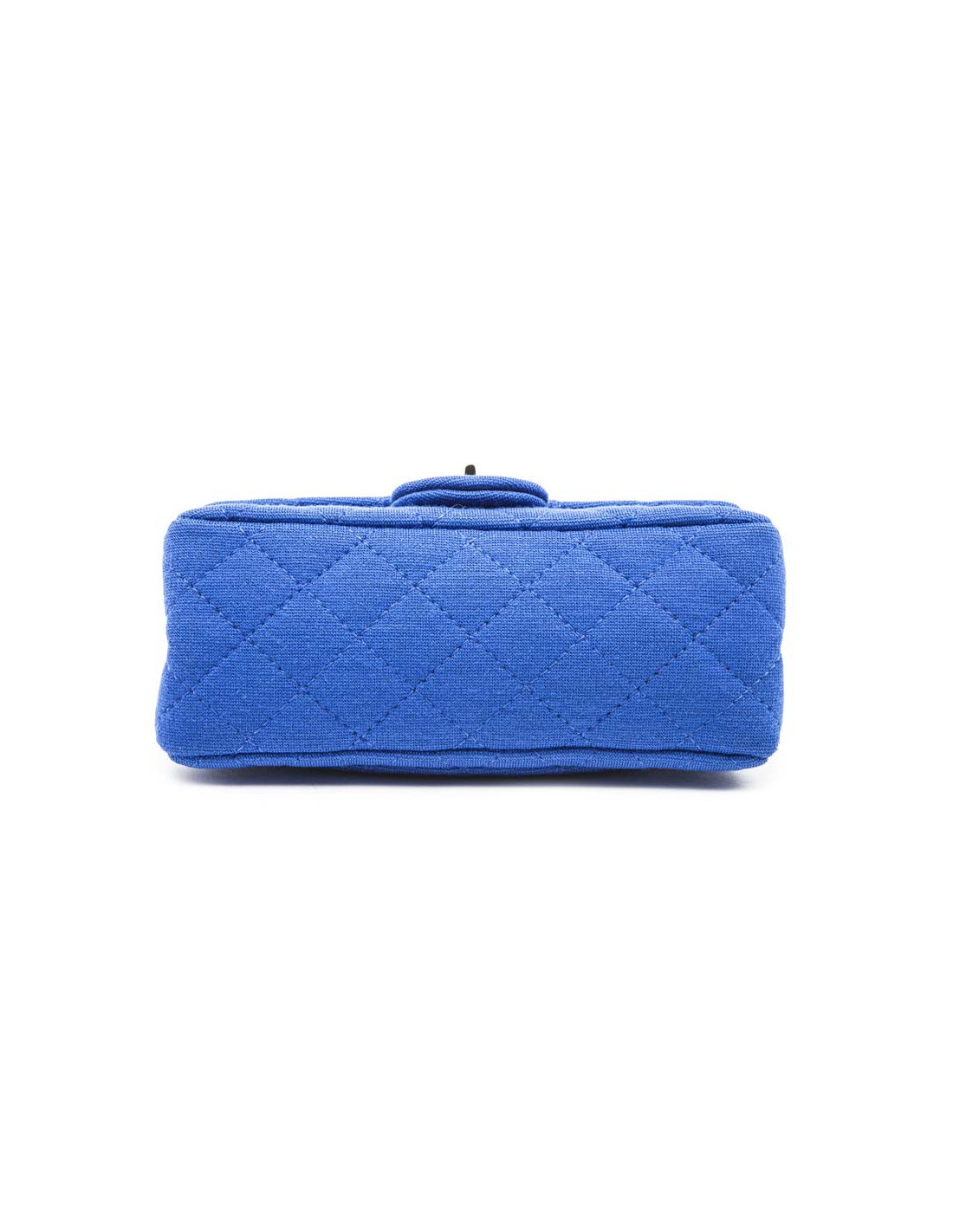 Chanel Mini double flap bag 2.55 in electric blue jersey. The hardware is made of silver-plated ruthenium.