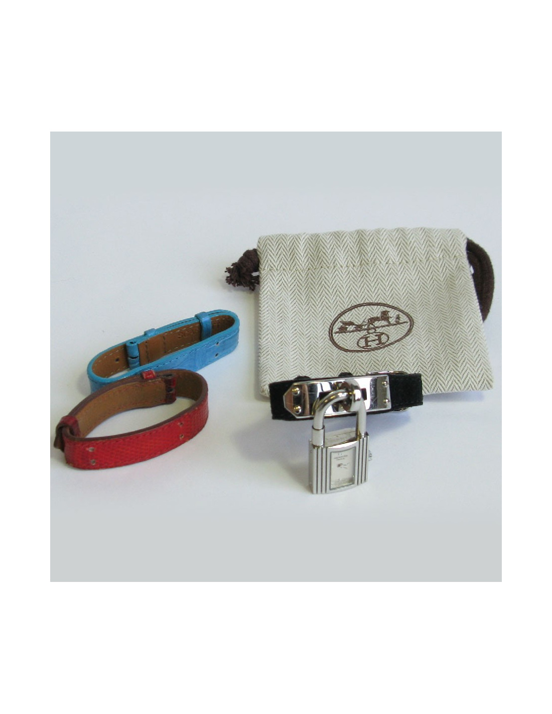 Supplied with three straps: black suede, blue metallic leather and red lizard leather in good condition. The lizard strap is Hermès leather, the other 2 straps have been replaced.