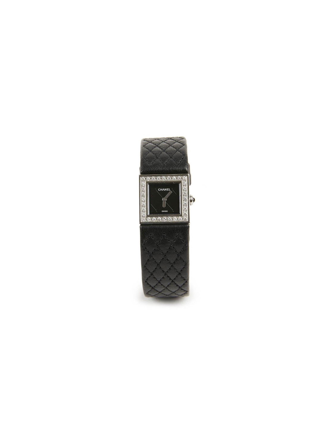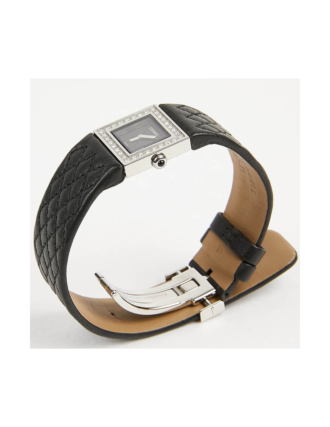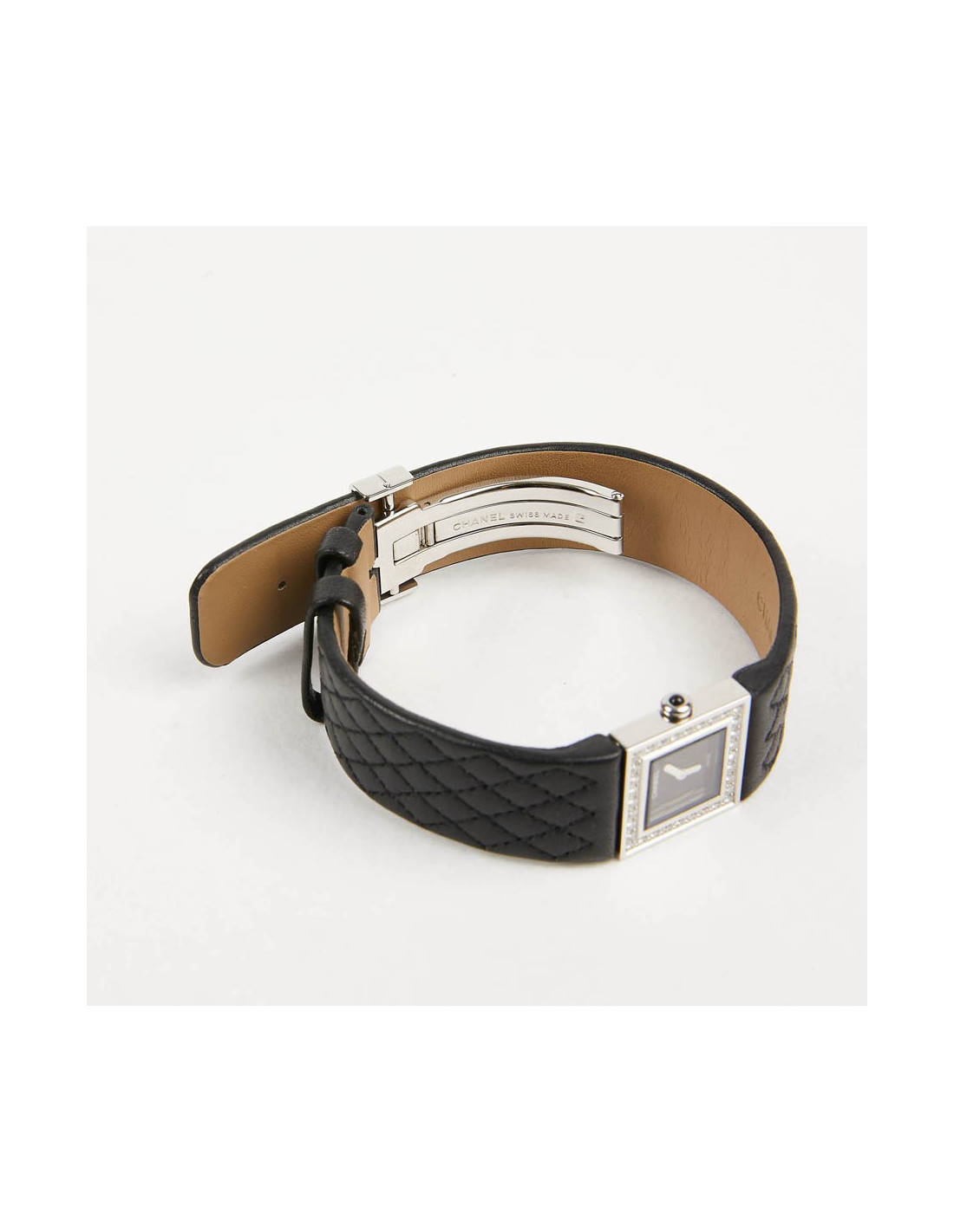 Charming Chanel watch, square diamond-set with black caseback, black cabochon-set crown, black quilted leather strap. Case, face and movement are signed CHANEL. It opens with a folding clasp. It is in very good used condition: has been completely serviced, the bracelet has been changed at CHANEL (invoice).