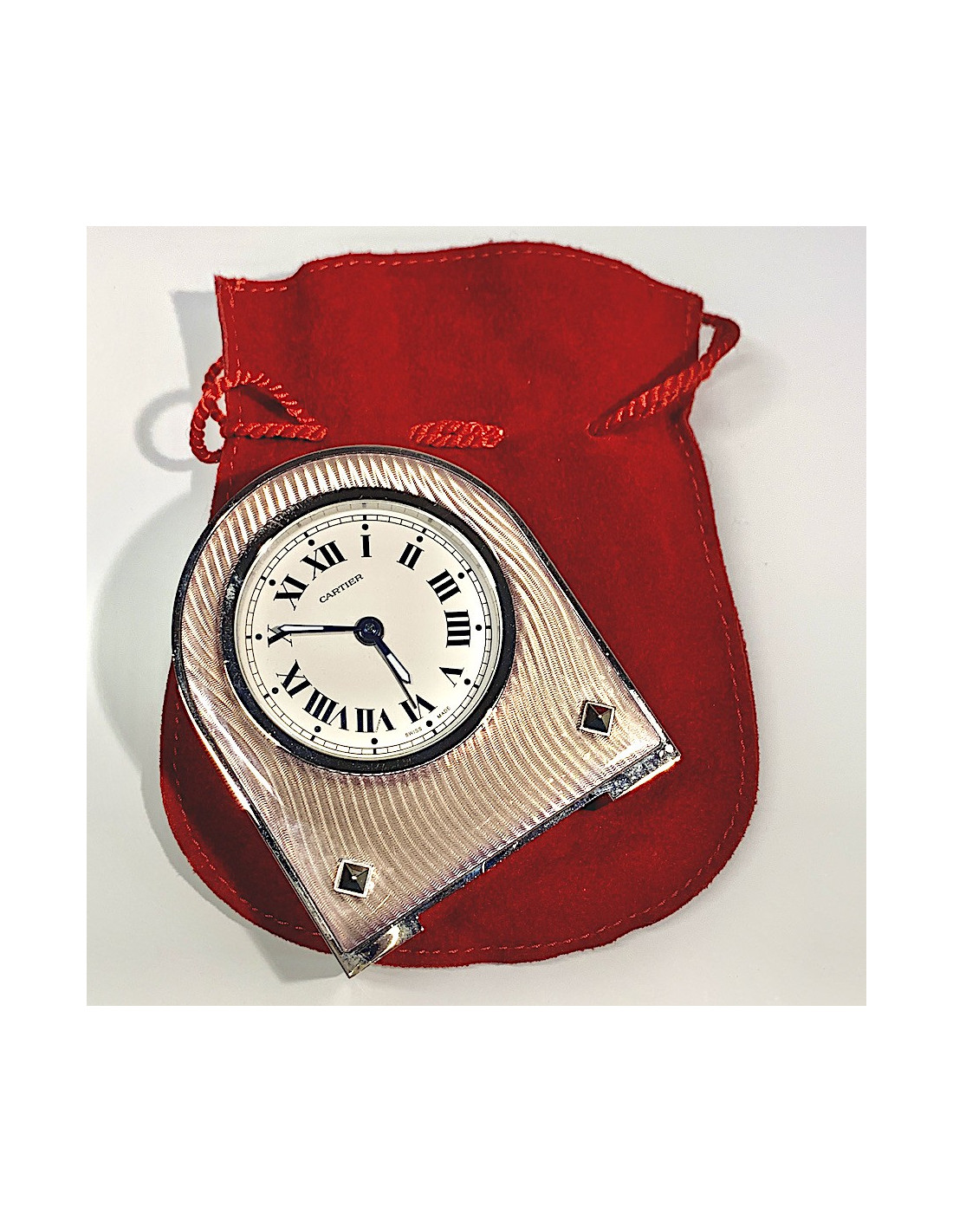 Very nice item. CARTIER travel clock. Its white dial features blue-painted Roman numerals. The movement is mechanical with manual winding.