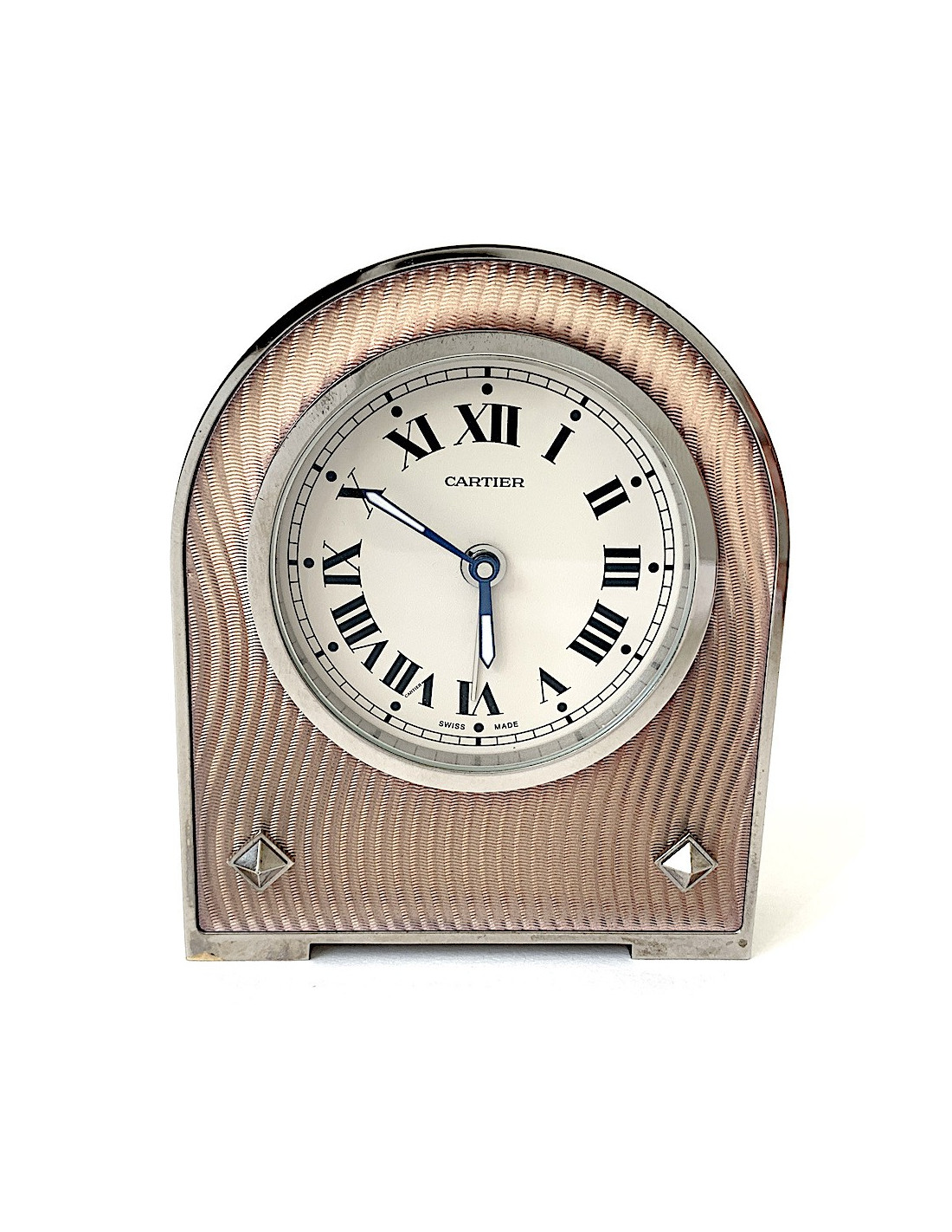 The body is in translucent pink enamel with a guilloché pattern adorned with silver cabochons, one of the 4 enamel colors dear to CARTIER. The 4 colors are blue, green, violet and pink. Stainless steel frame.