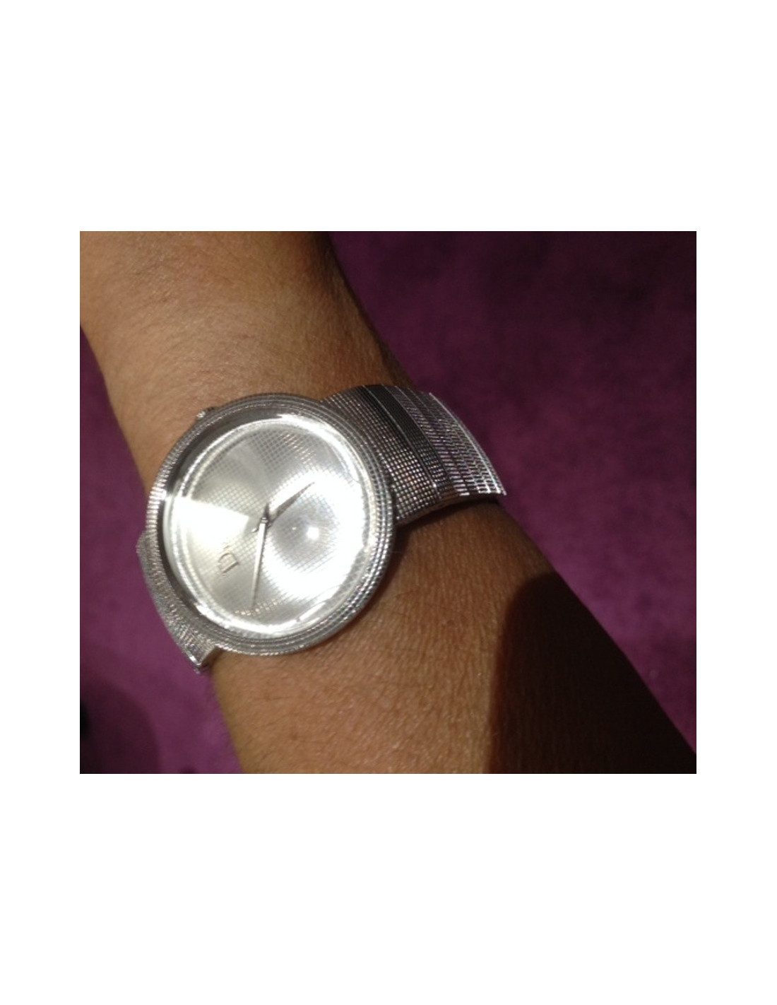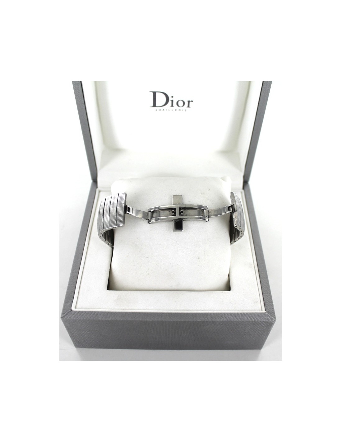 DIOR H/F stainless steel watch, model D, large, light grey background. Domed Sapphire Crystal. In perfect condition. This model can also be worn by a woman. Recognized for his creativity and his sense of detail, the House then chose to imagine his models in his workshop in Paris, avenue Montaigne, and produce them in the pool of watchmaking, Switzerland, La Chaux-de-Fonds. Clasp double clip. Sold with its box and its setting of origin, as well as its maintenance manual and its authenticity card. Date of 2004. Water resistant and Swiss Made. Wrist length: 18 cm, Bracelet width: 2.2 cm Diameter dial: 4.8 cm, Case thickness: 0.5 cm