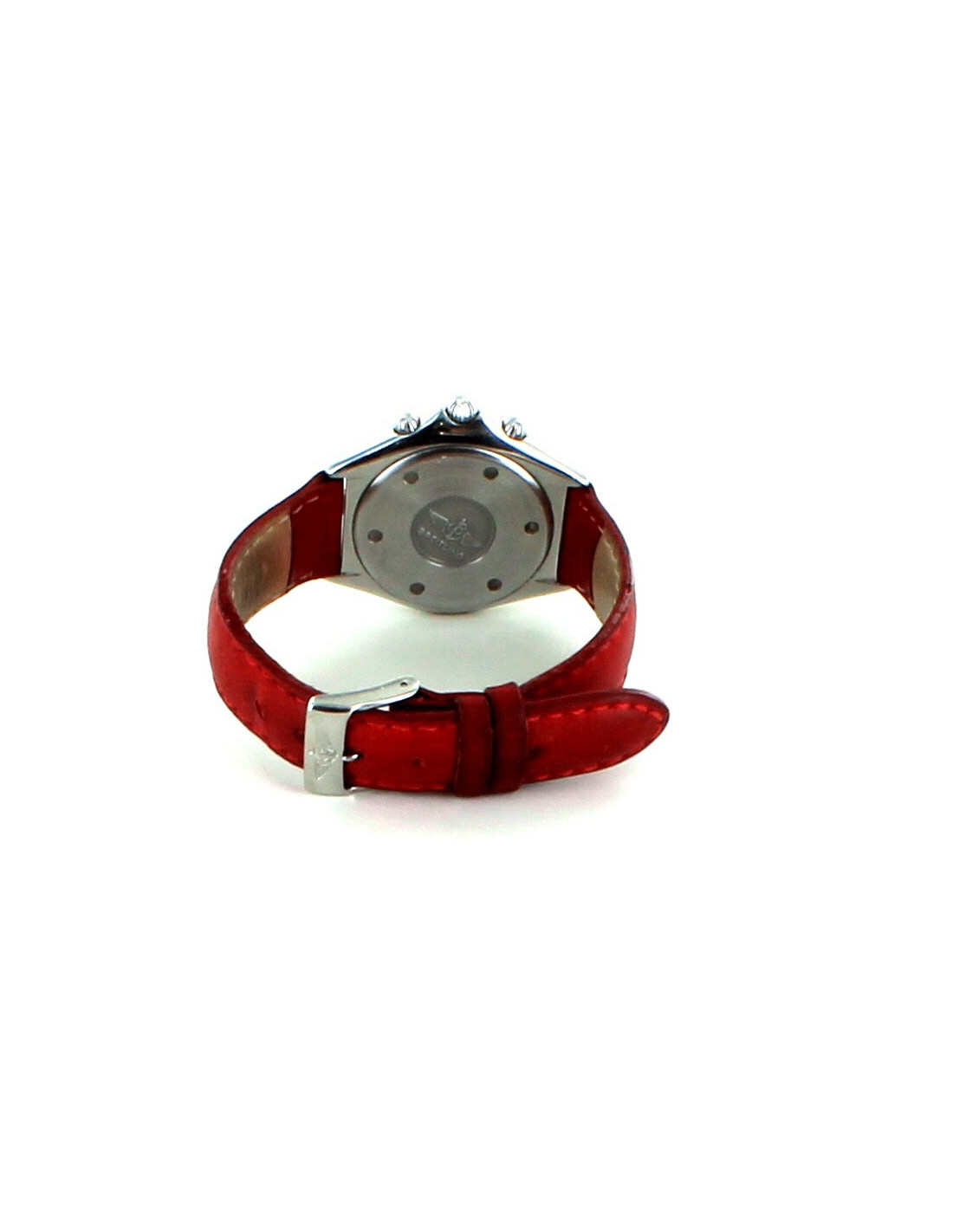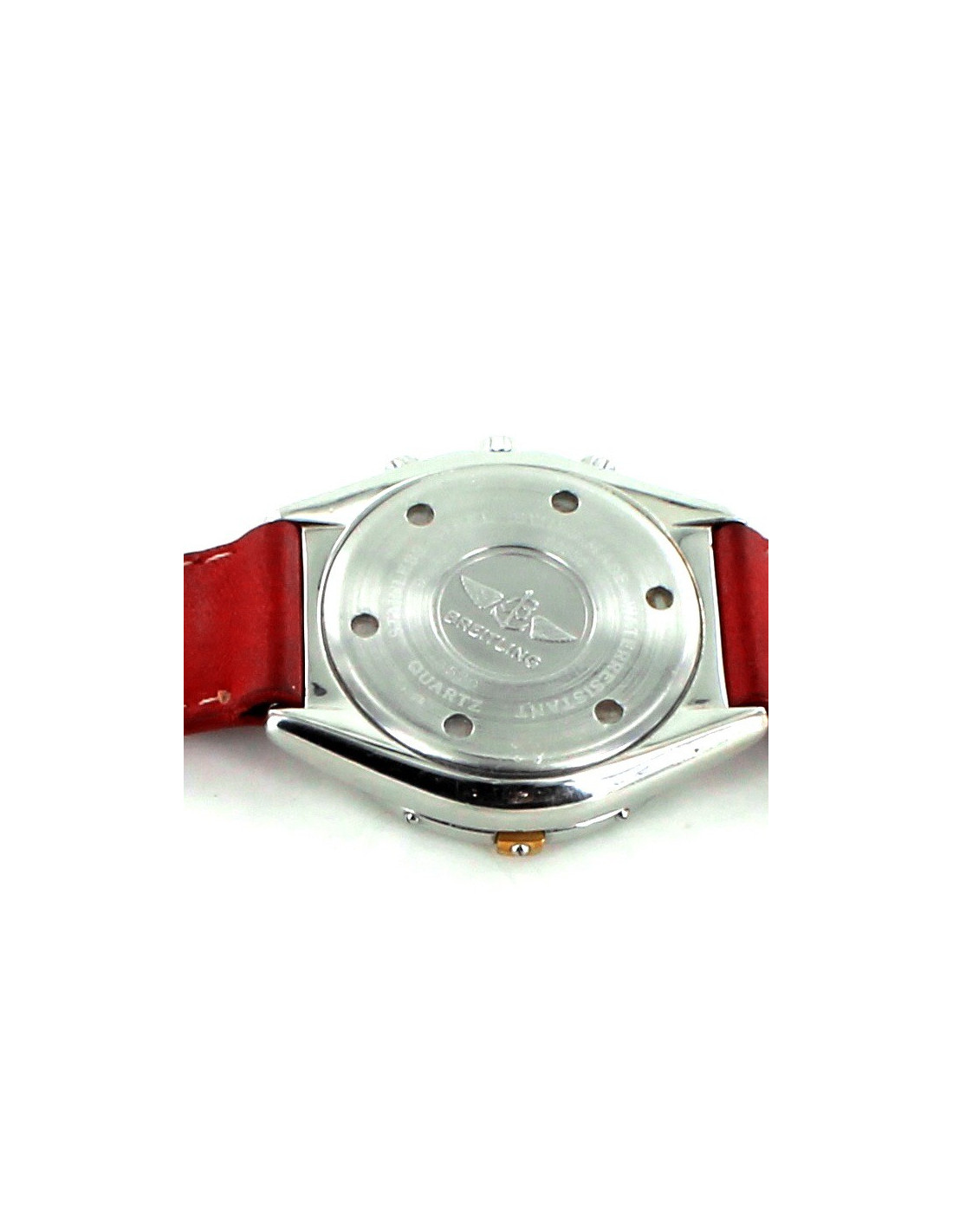 Chronograph in gold and steel Breitling. The bottom is 2 shades of blue, 3 counters Arabic numerals and luminescent, the rotating bezel is graduated, quartz movement. The bracelet is slightly used red.