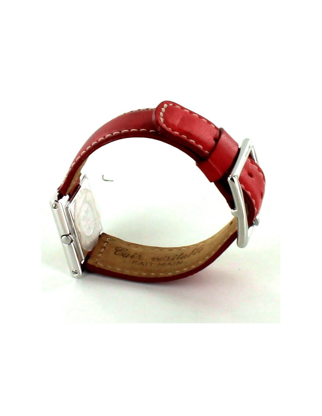 silver metal, with a leather strap in red (a few light marks on the leather)