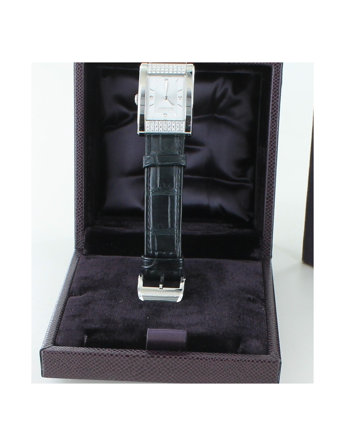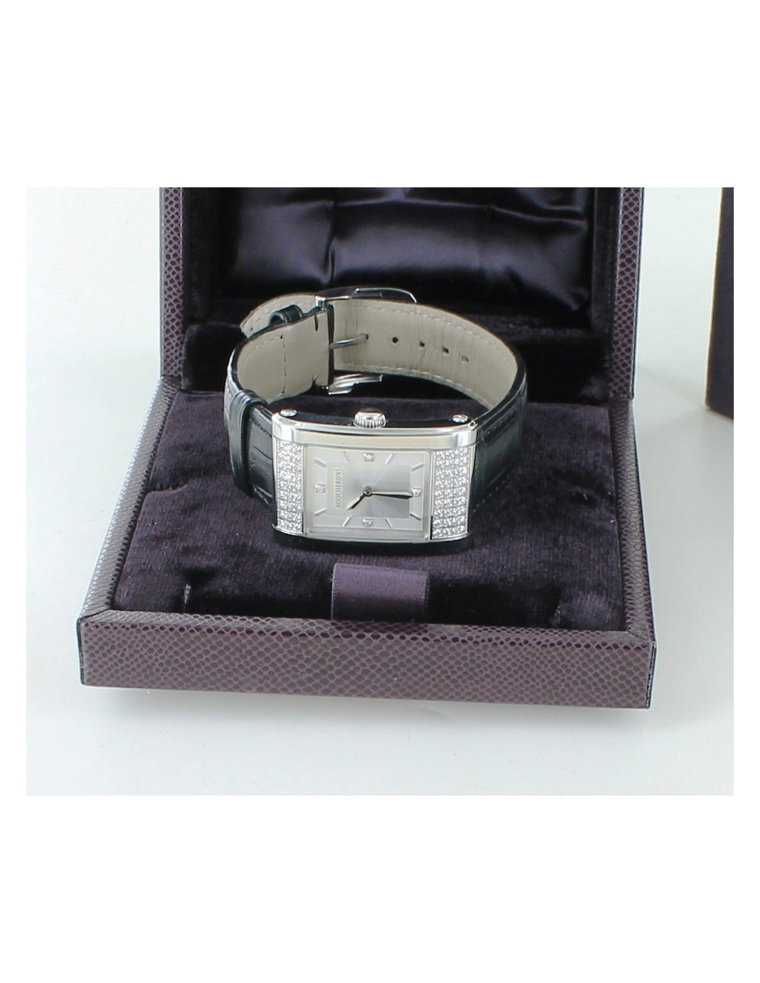 Shows "reflection of the House Boucheron, steel and diamonds. 54 diamonds make up this watch, quartz movement, functions: hour and minute, stainless steel set with diamonds, case Bracelet of origin (very good condition) in black crocodile and buckle in steel