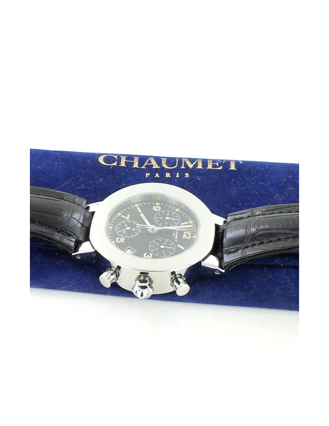 Watch "style of Chaumet", of the House of Chaumet, steel and quartz movement... Lady Chronograph Watch. The dial is black. There are 3 meters with Arabic numerals and applied indexes, displays date by window at 4 o'clock. Strap in crocodile with steel adjustable buckle.She signed and numbered.