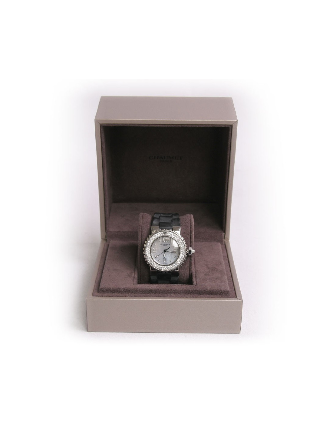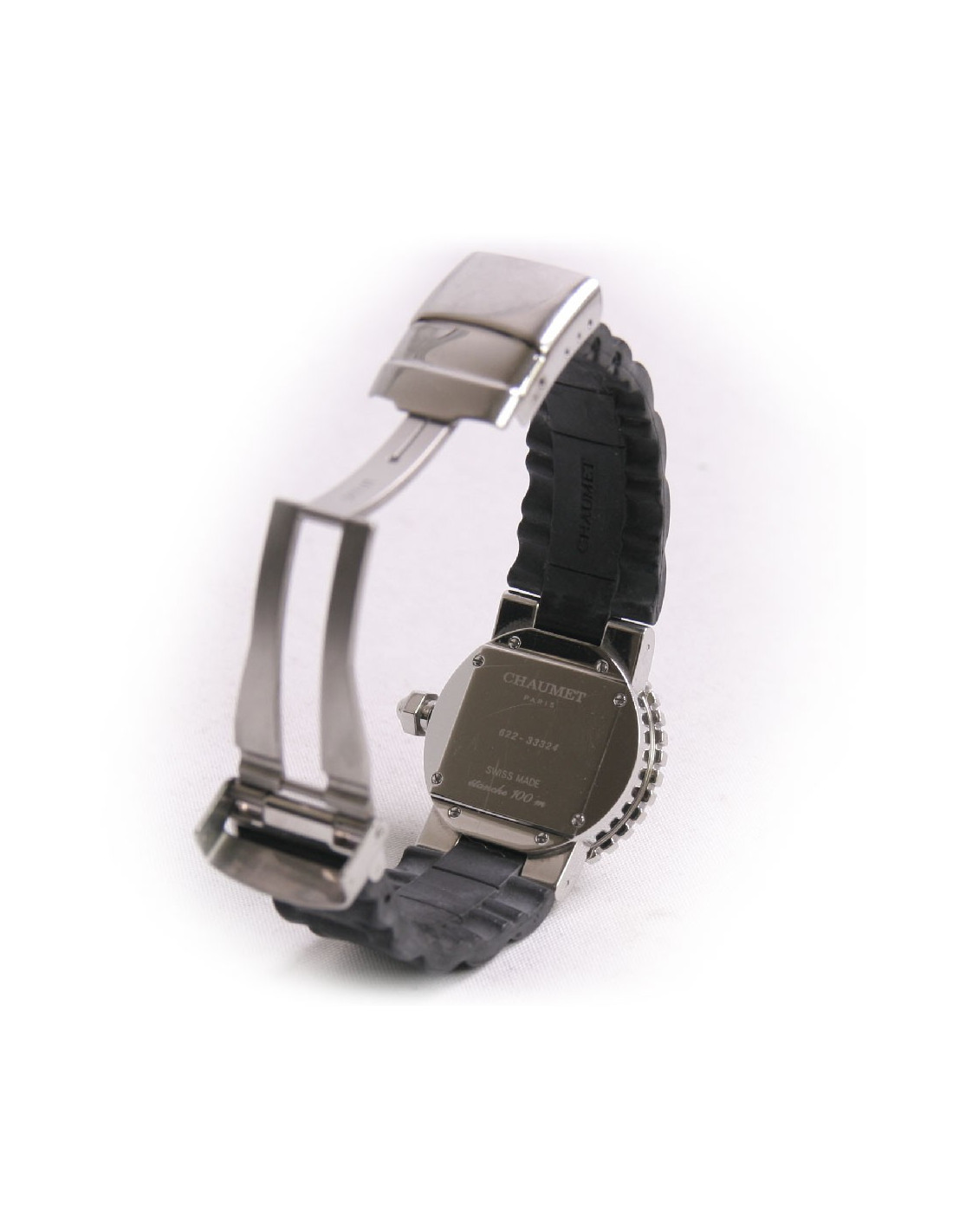Chaumet Class One diamonds, and steel watch. She is quartz with a diameter 33 mm and 100-meter water-resistance. The glass is Sapphire. The dial is Pearly bluish. Arabic numerals are steel. There is also the calendar. She went (in good condition); the bracelet is slightly bleached.