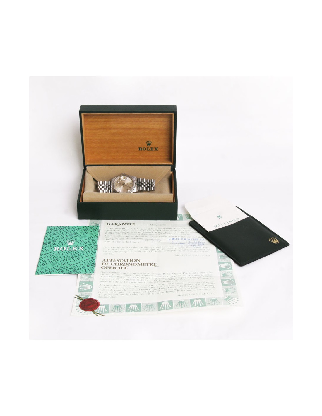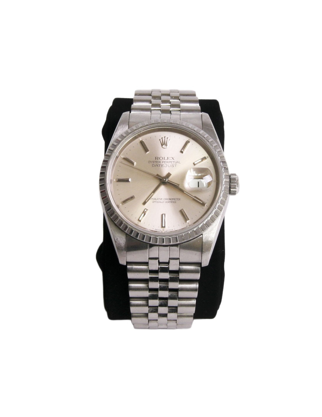 Rolex "Oyster perpetual datejust" watch. Deploying the loop bracelet is in steel and measures 16 cm, official chronometer certified self-winding mechanical movement and the glass is made of Sapphire Cyclops. Bezel: fluted, diameter 36 mm, round shaped case is steel, the bottom and the Crown are screwed, watertight, it is possible to be worn by a man or a woman. < span style = "do -"family:Arial; do - size:12px; do-style: normal;" >It is waterproof to the water: 100 metres. functions: hours, minutes, Center seconds. Guarantee certificate: purchase September 1991. (for the record price of the nine 5500 euros.)