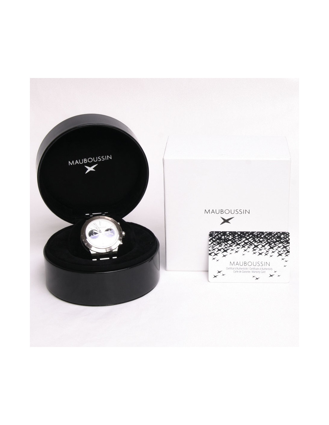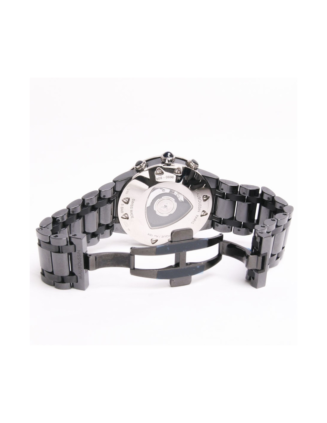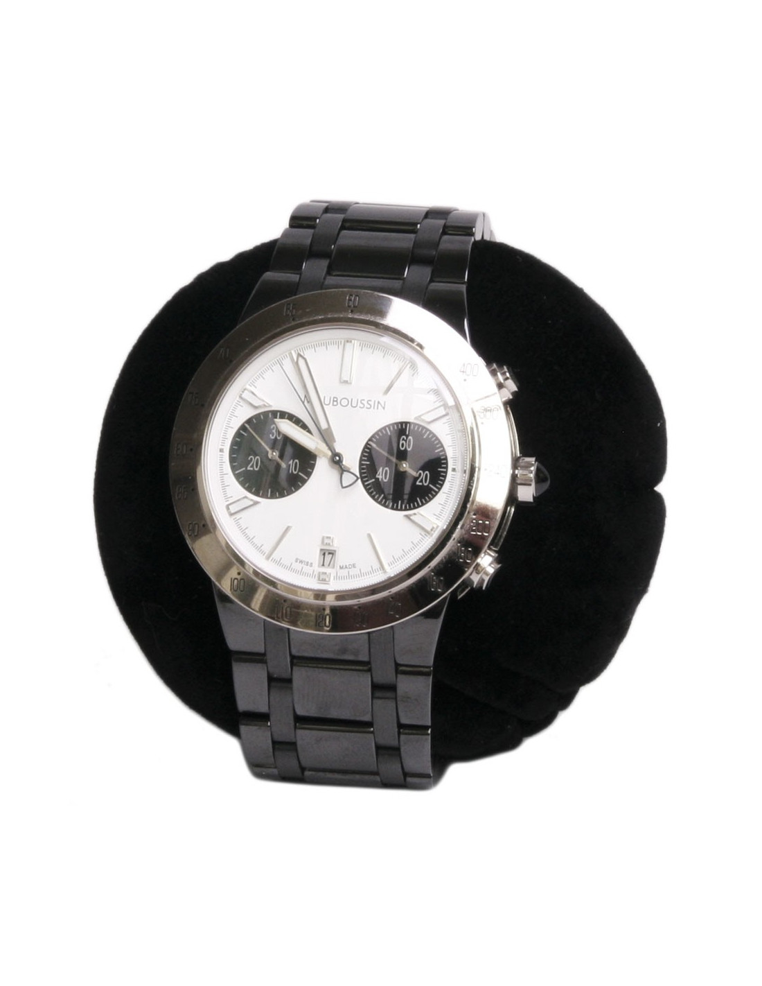 Mauboussin "Time for Ever" watch for men, in white gold and black ceramic bracelet. It was purchased on February 17, 2014 from Mauboussin in Paris, see authenticity card. It is an automatic chronograph watch with complications. It is in white gold. Its diameter is: 42 mm, with a white face.