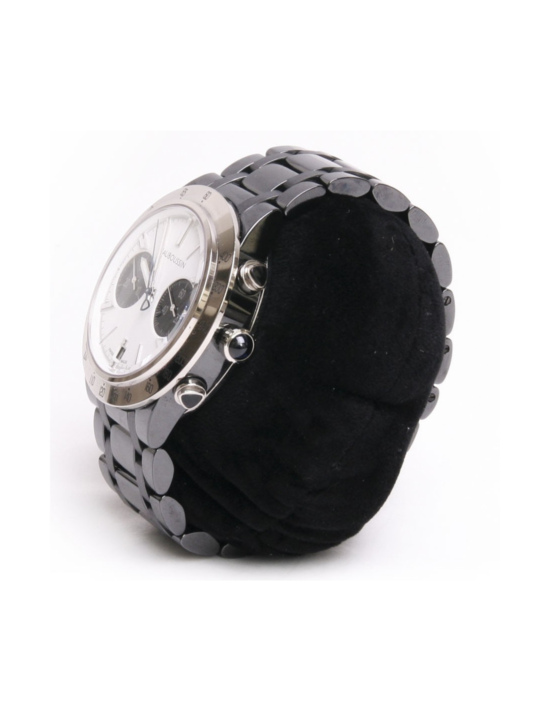 Details : Automatic chronograph watch with complications, in white gold, diameter 42 mm, with a white face, the counter is in black mother-of-pearl, the crown is set with a cabochon sapphire and the bracelet is in ceramic with a folding clasp that opens with 2 snaps on the sides.