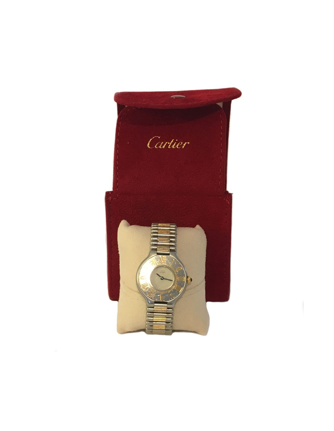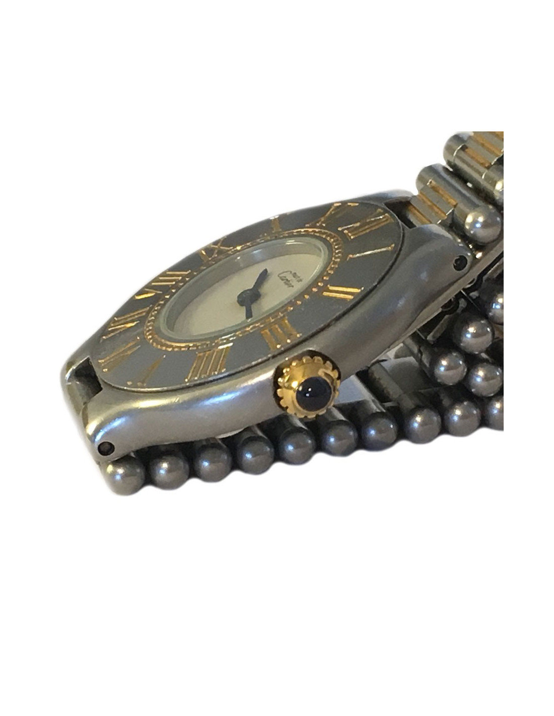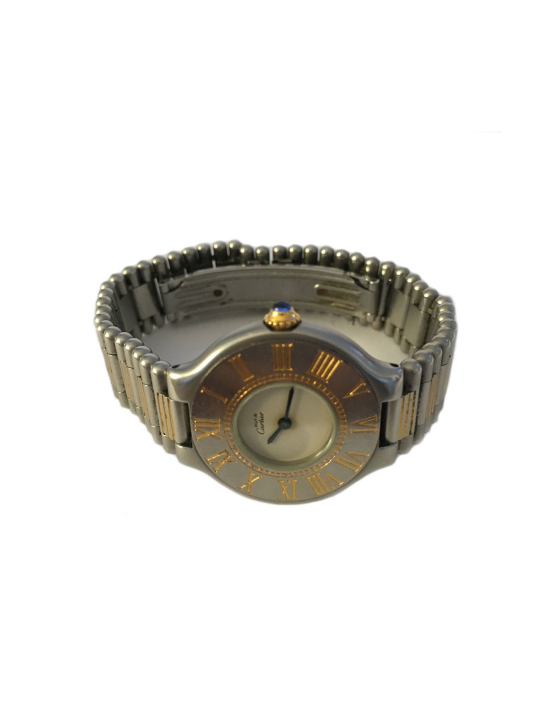 Model known from the CARTIER House, "Must 21" watch in gold and steel vintage. Round case, figures in letters Roman gold and set with a Sapphire cabochon Crown. Quartz watch. Bracelet deploying on 2 sides. Blue needles in a White Dial.