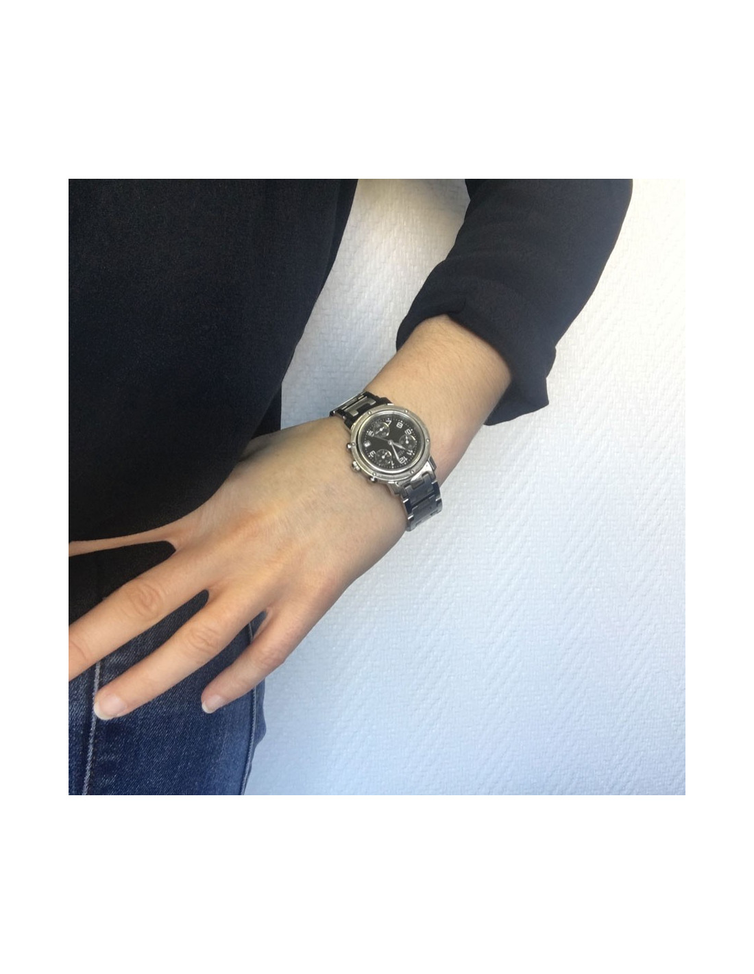 HERMES women's Clipper chrono watch in steel. Ref CL 1.310. Round case, black face, 3 counters, signed. Quartz movement, sapphire crystal. Folding clasp, steel and brushed steel bracelet featuring the letter H.