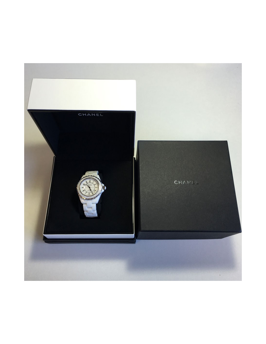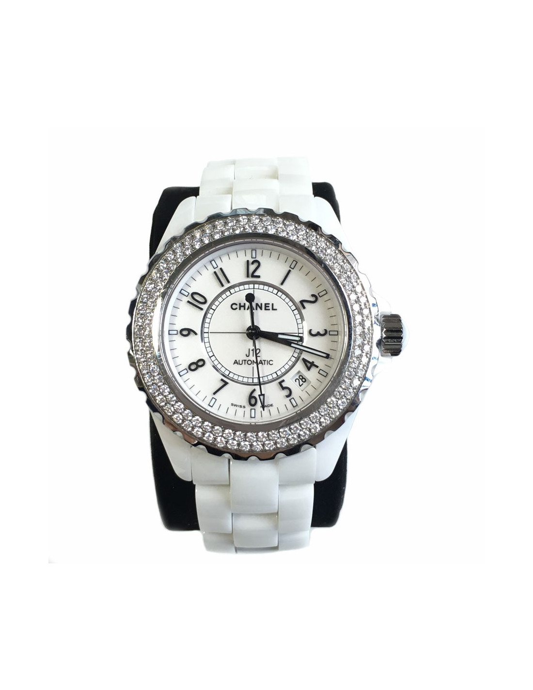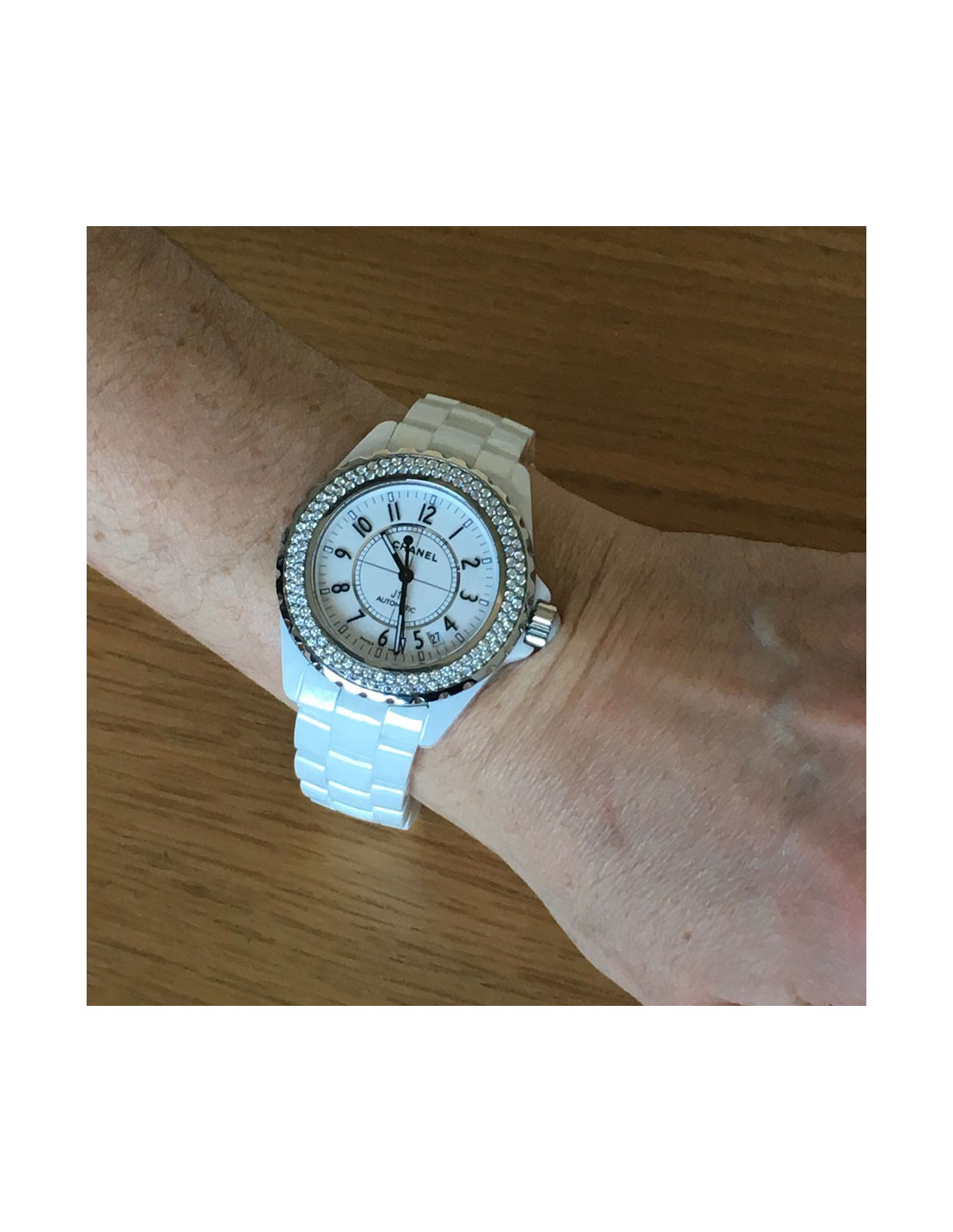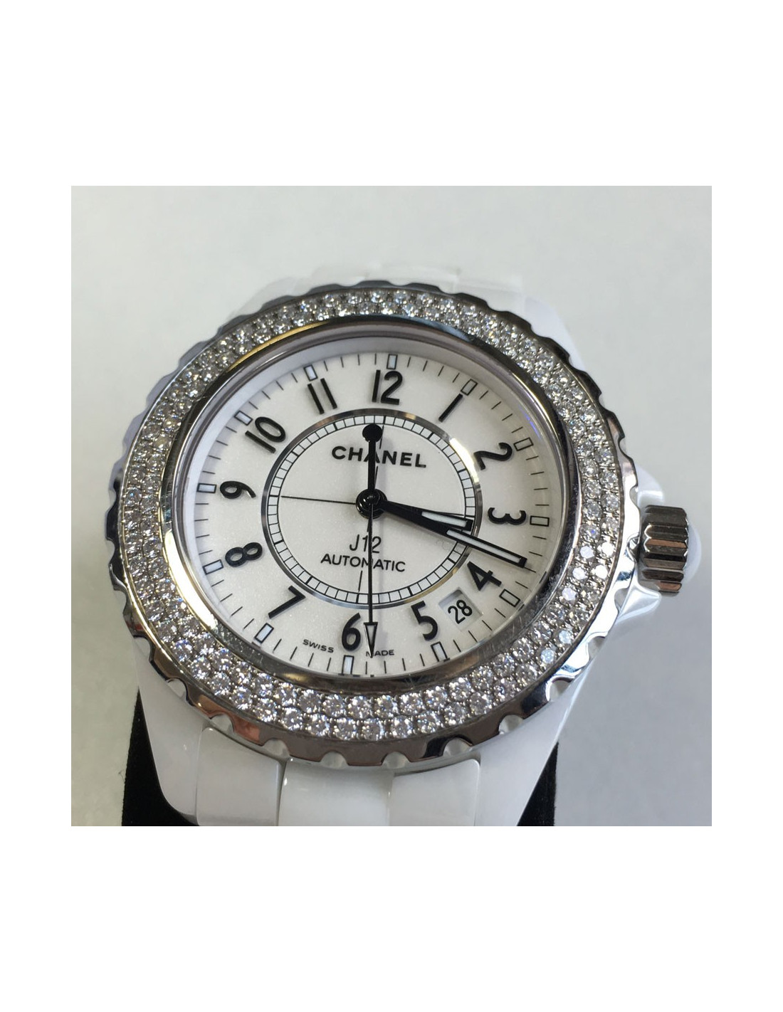 Watch CHANEL J12 white ceramic and diamonds. Set with 2 rows of diamonds bezel size brilliant (1.6 cents). The dial is round on white background; Black Arabic numerals, date at 4:30 mechanical self-winding movement. REF H0969. Serial number: ZH20... Diameter: 38 mm