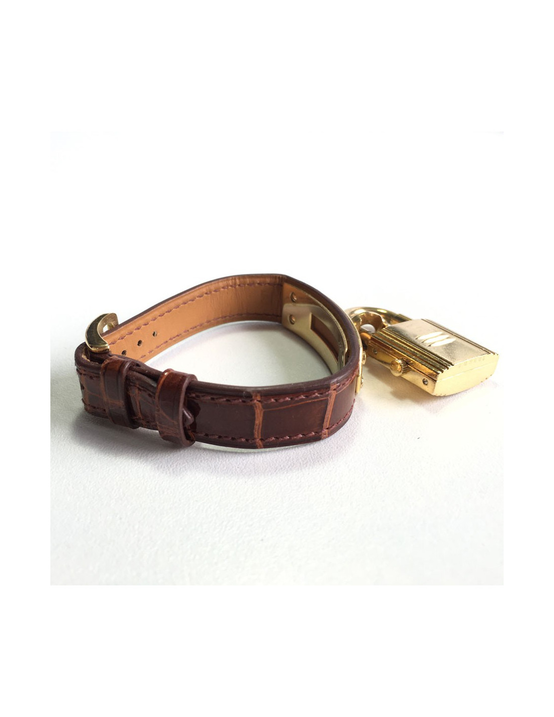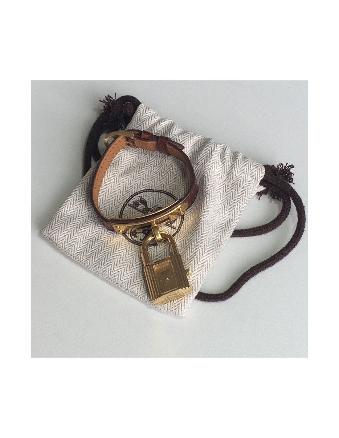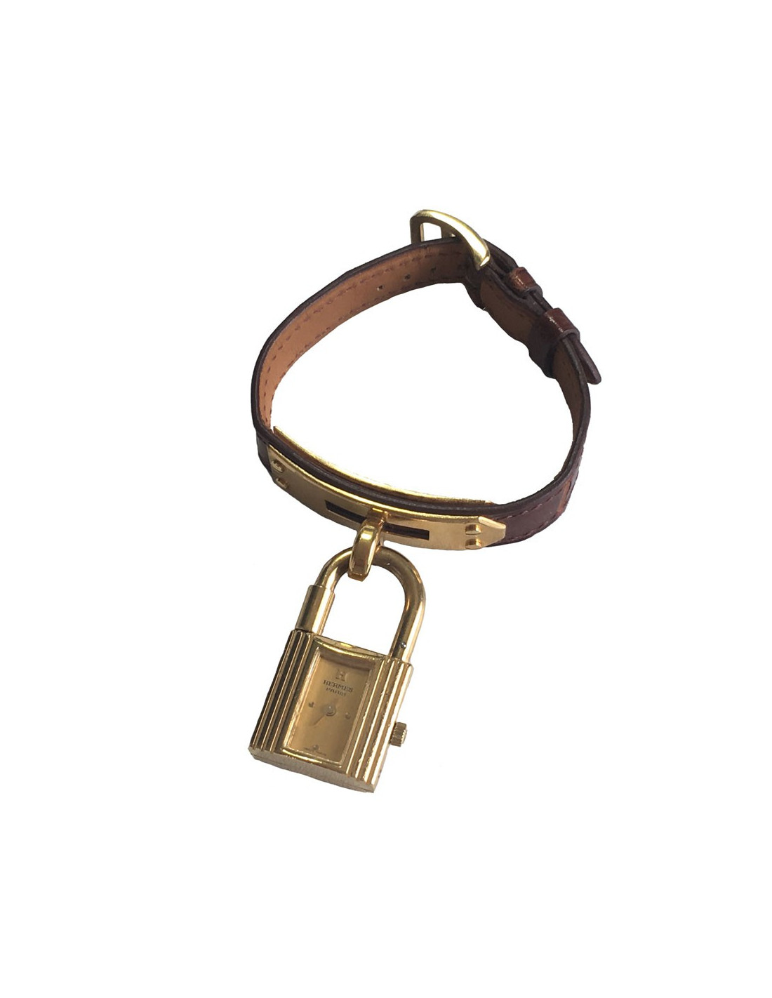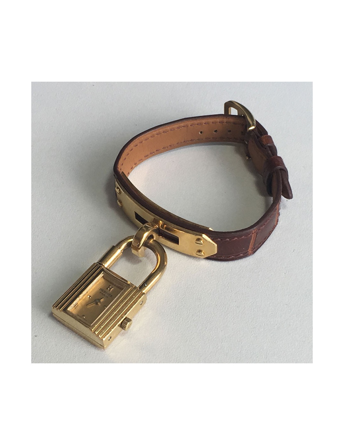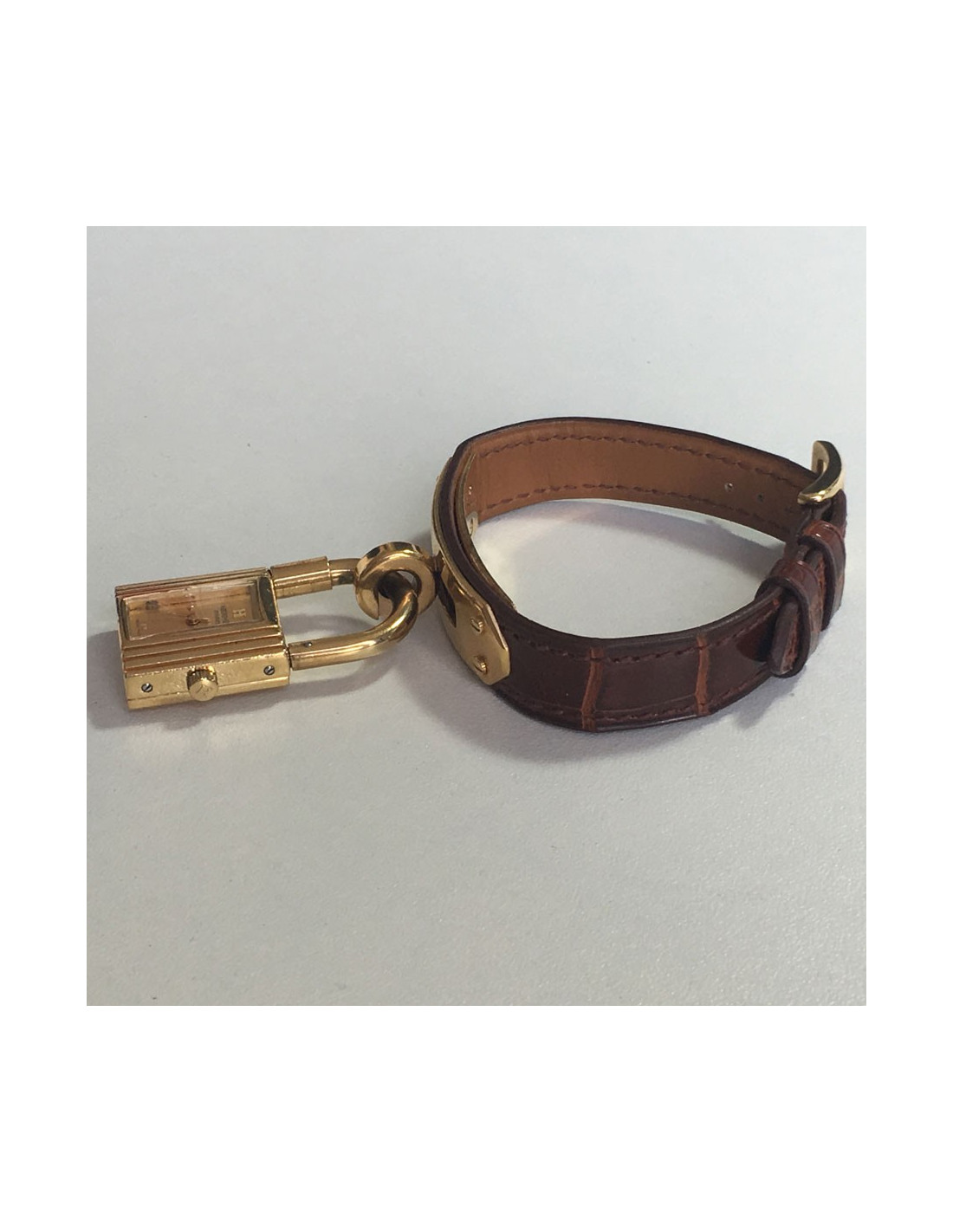 HERMES Kelly watch in brown alligator and gold-plated hardware. The bracelet is in very good condition. Micro-scratches all over the dial. A small chip on the front (see photo).