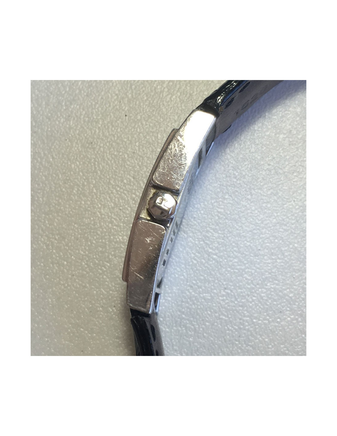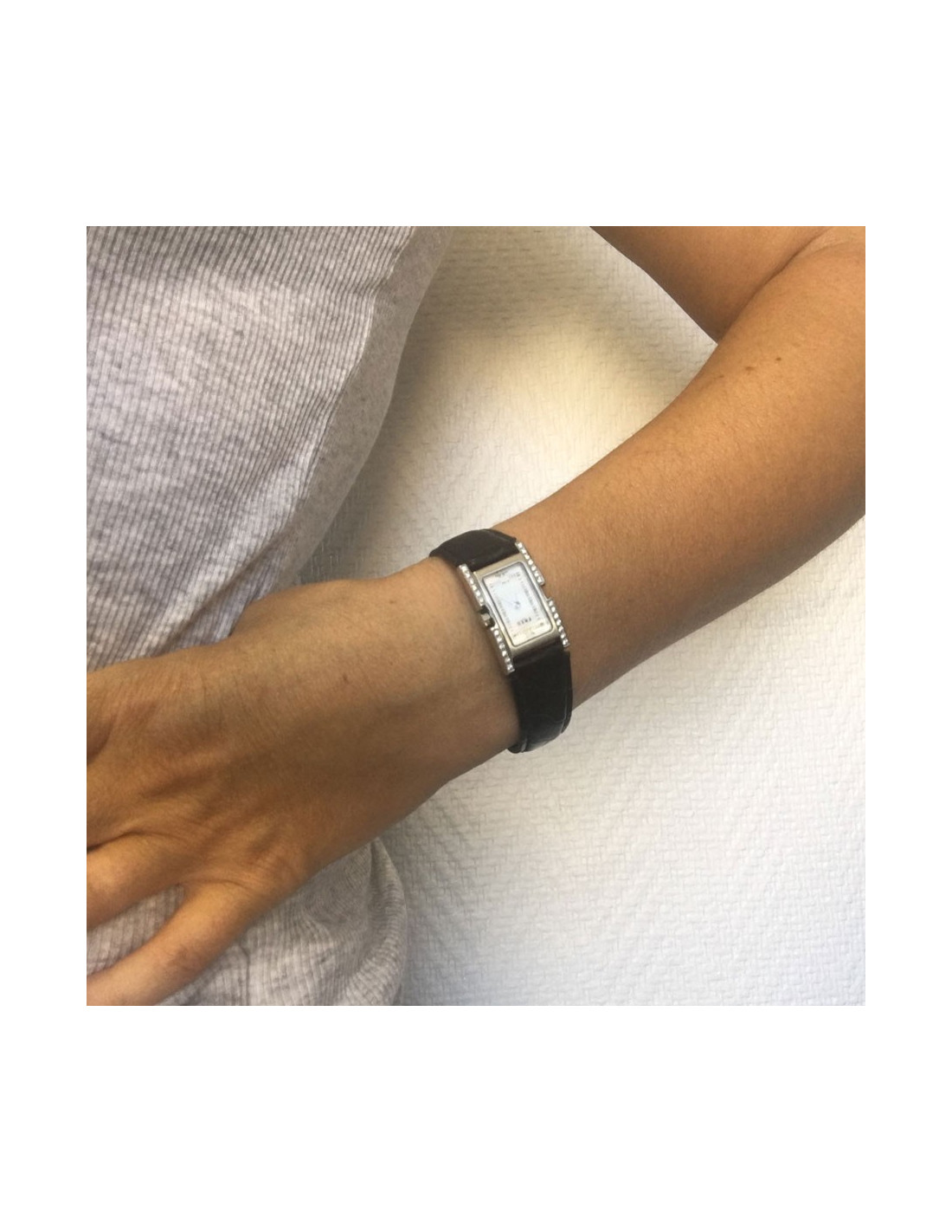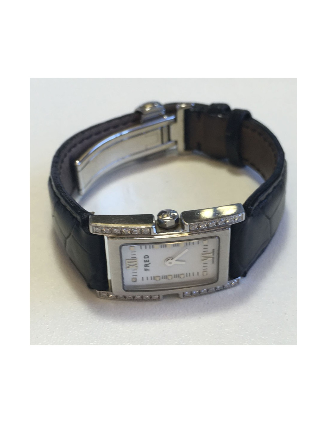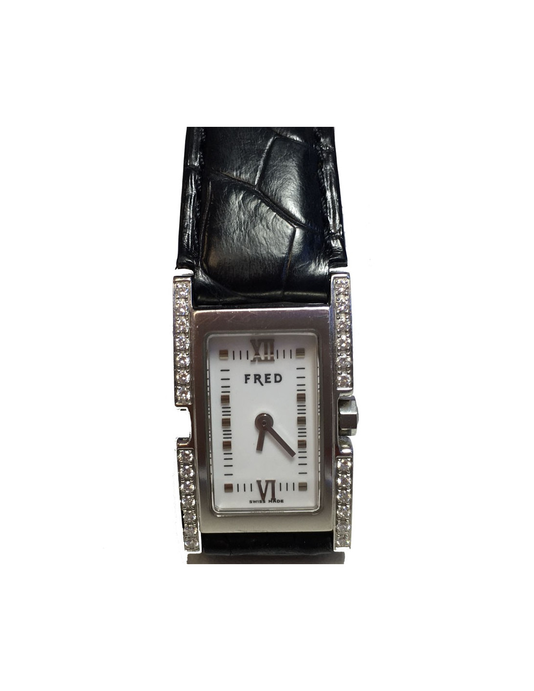 Watch FRED model 36, in steel, White Dial, Roman numbers, bezel set with diamonds, black alligator with steel folding clasp strap. Quartz movement.