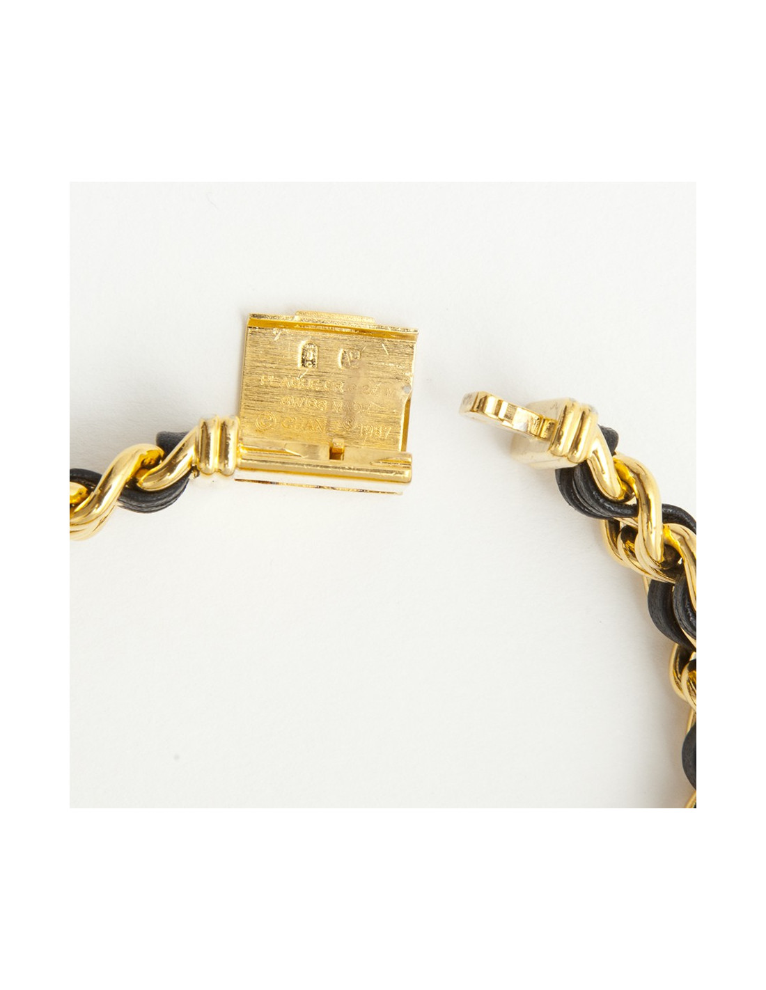The bracelet is a gilded metal chain interlaced with black leather.