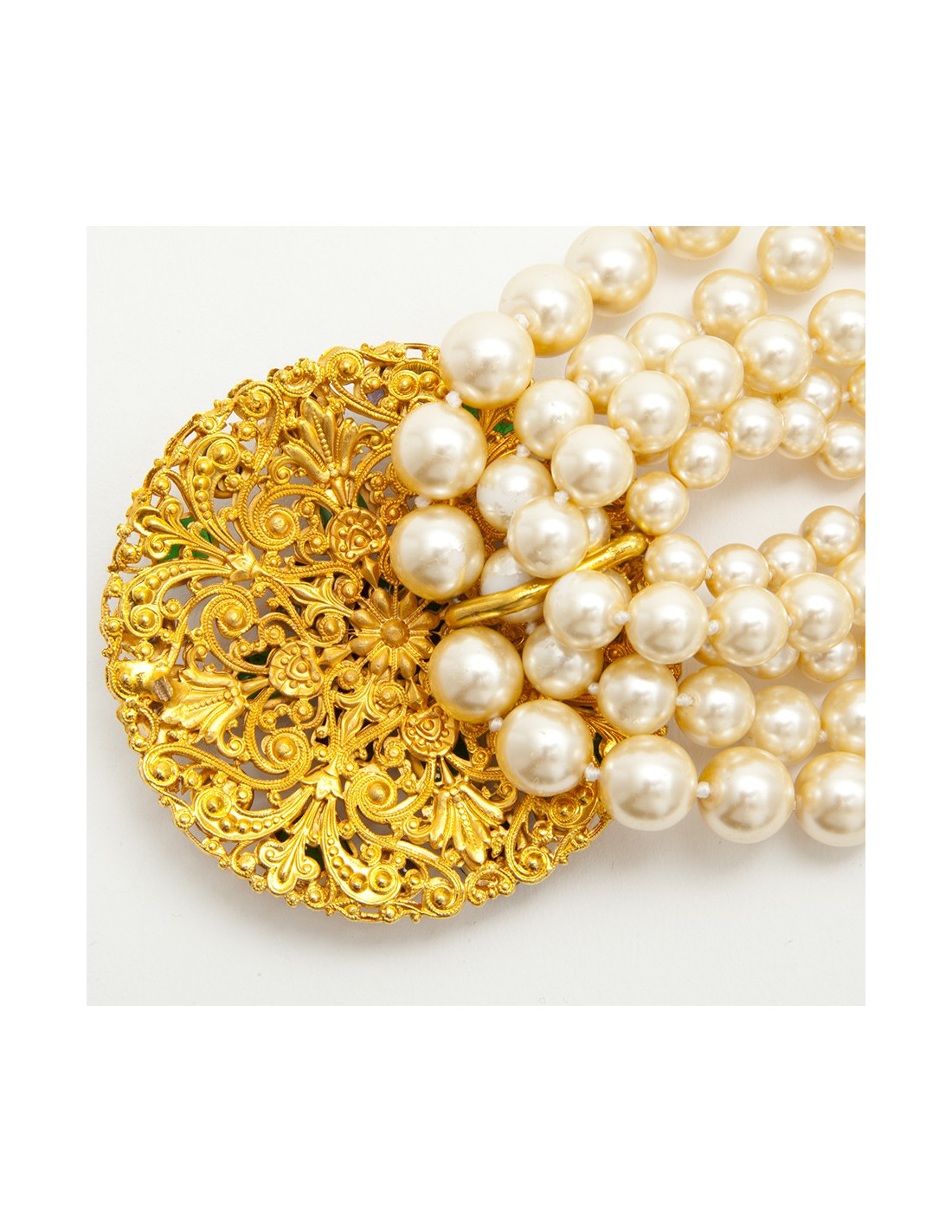 Couture !! Marguerite de Valois necklace 5 rows, in pearl beads, embellished with an imposing medallion in filigree set with cabochons in molten paste color : emerald and amethyst.