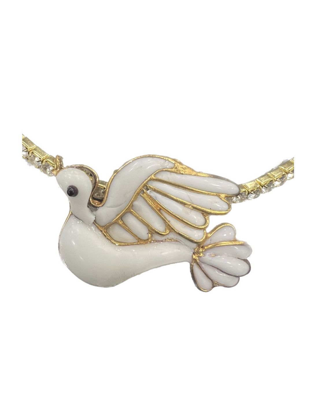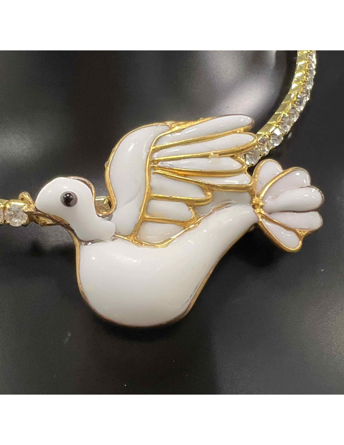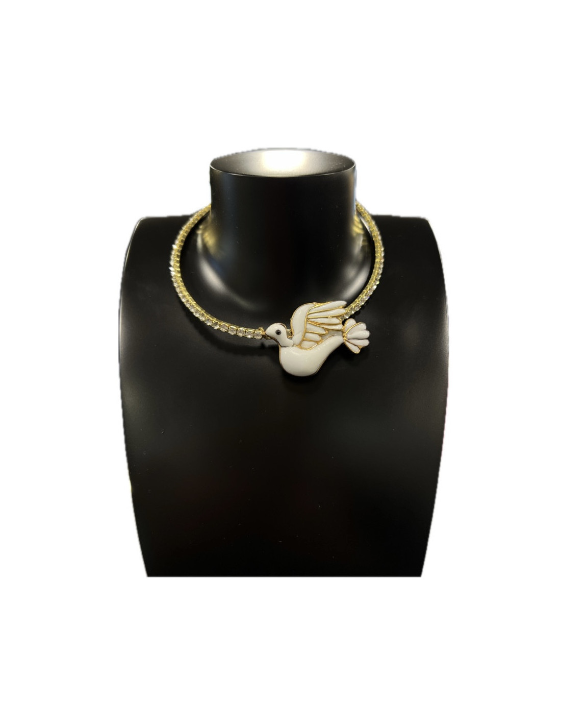 Vintage. Loulou de La Falaise choker necklace in golden metal and brilliant Swarovski. It was manufactured at the time by the House Gripoix. The pendant represents a dove made of white molten glass. In very good condition.