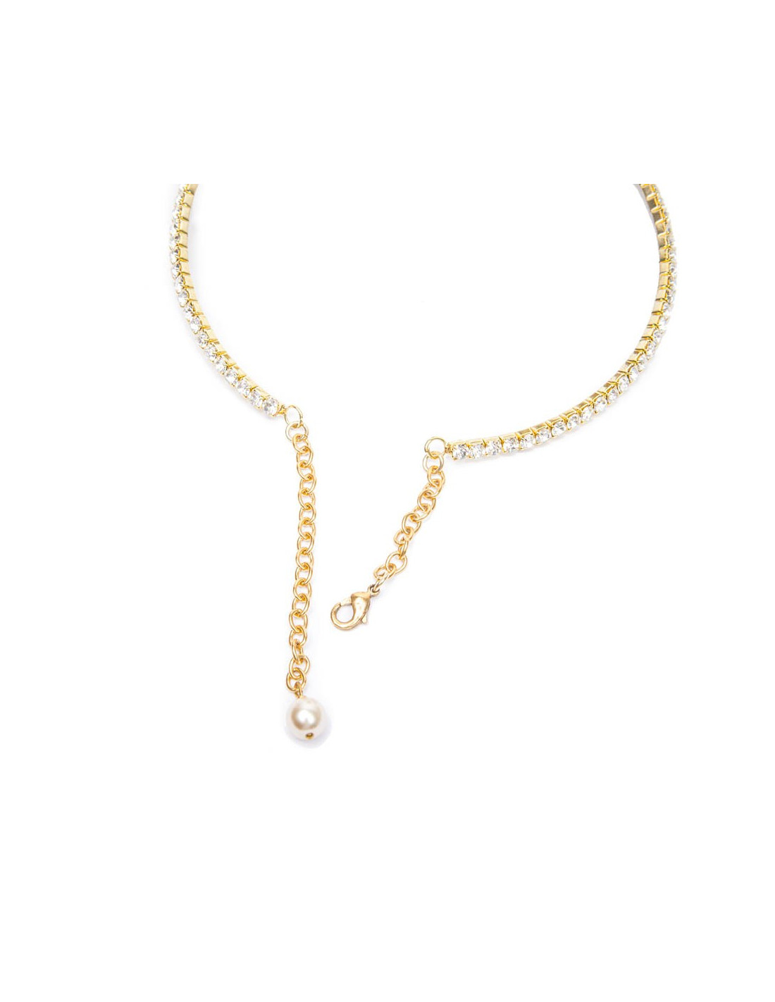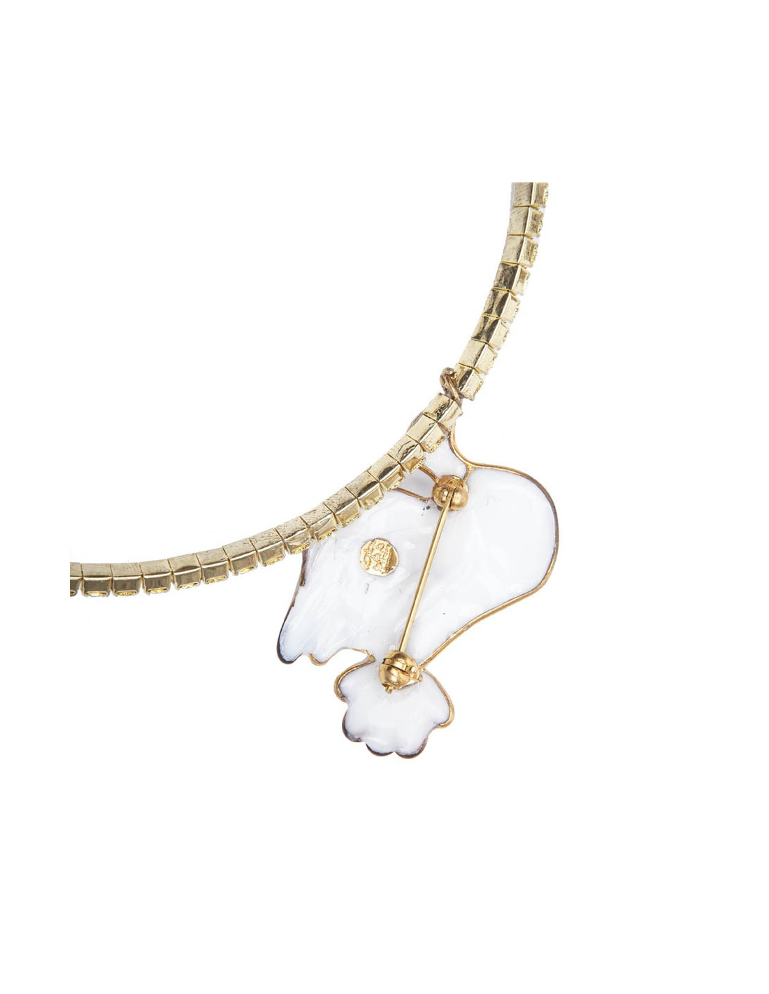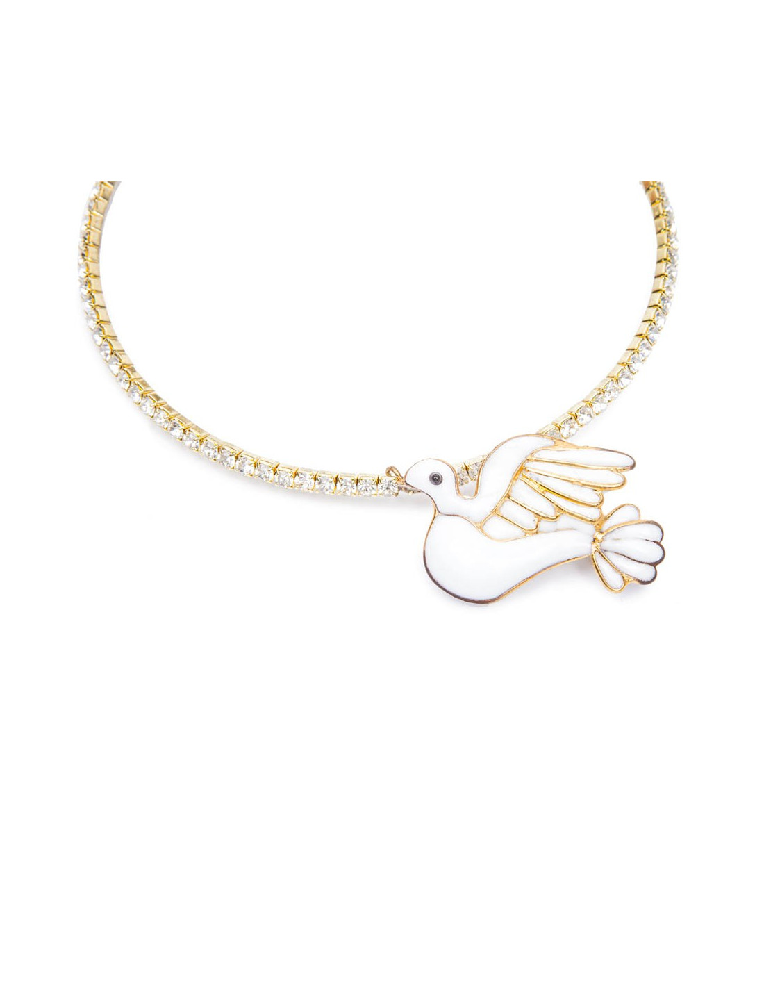 Vintage. Loulou de La Falaise choker necklace in golden metal and brilliant Swarovski. It was manufactured at the time by the House Gripoix. The pendant represents a dove made of white molten glass. In very good condition.