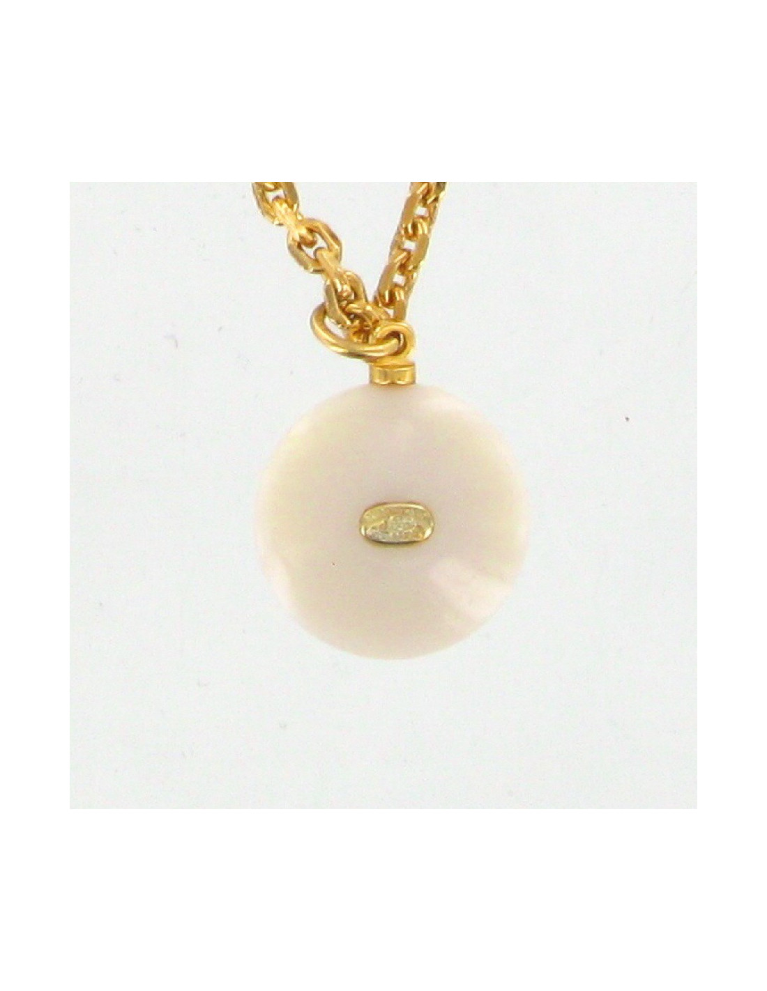 Pretty pendant CHANEL pearls and CC and its chain. The chain is gold metal, it is completed by a CC in gold metal and measures 48 cm. The pendant is set with light pink beige resin beads and CC pale gold.