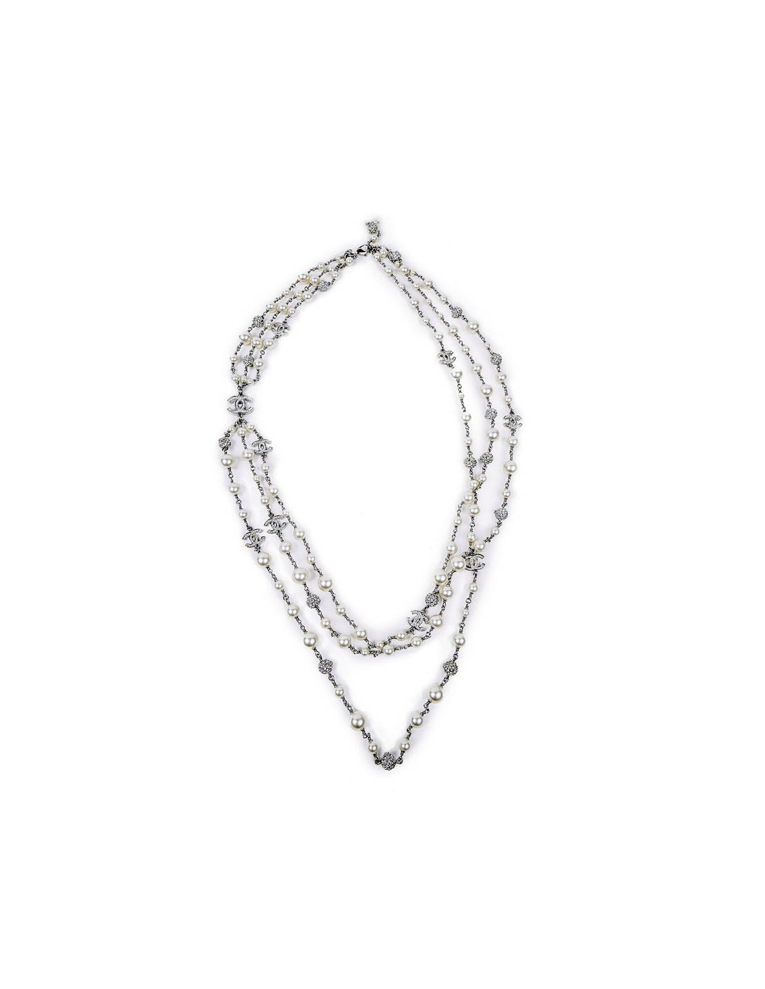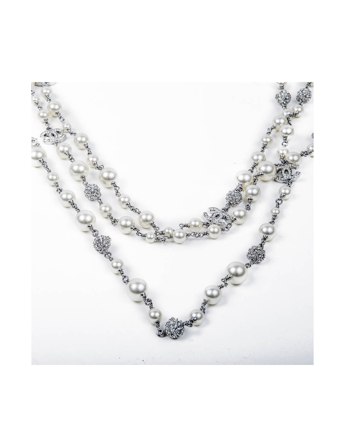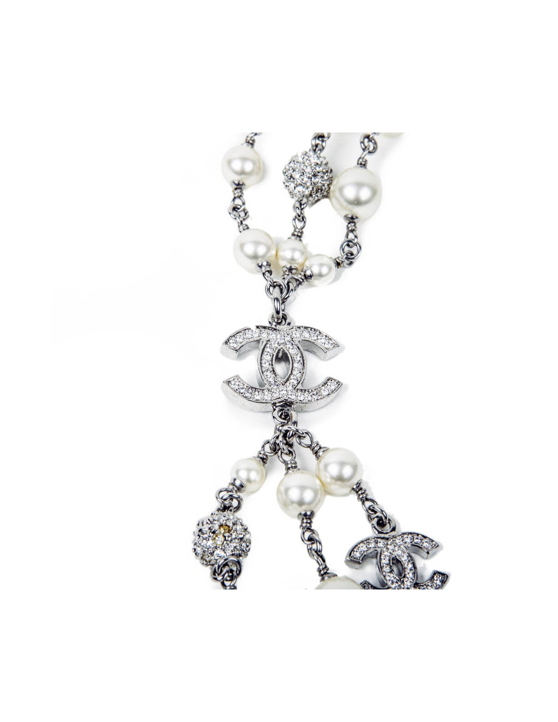 Chanel triple row necklace beads in paste of glass, CC and balls in rhinestones and silver metal.