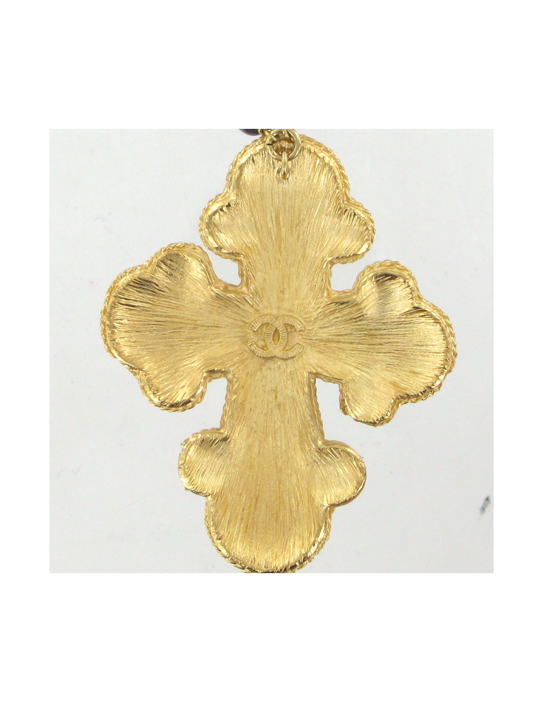 Beautiful cross CHANEL necklace set with multicolored beads. Metal chain pale gold set with white pearls, pearly, green, purple, yellow and CC pale gold. The pendant is a metal cross set with purple, green and transparent cabochons pale gold. the cabochon in the middle is set with a CC pale gold.