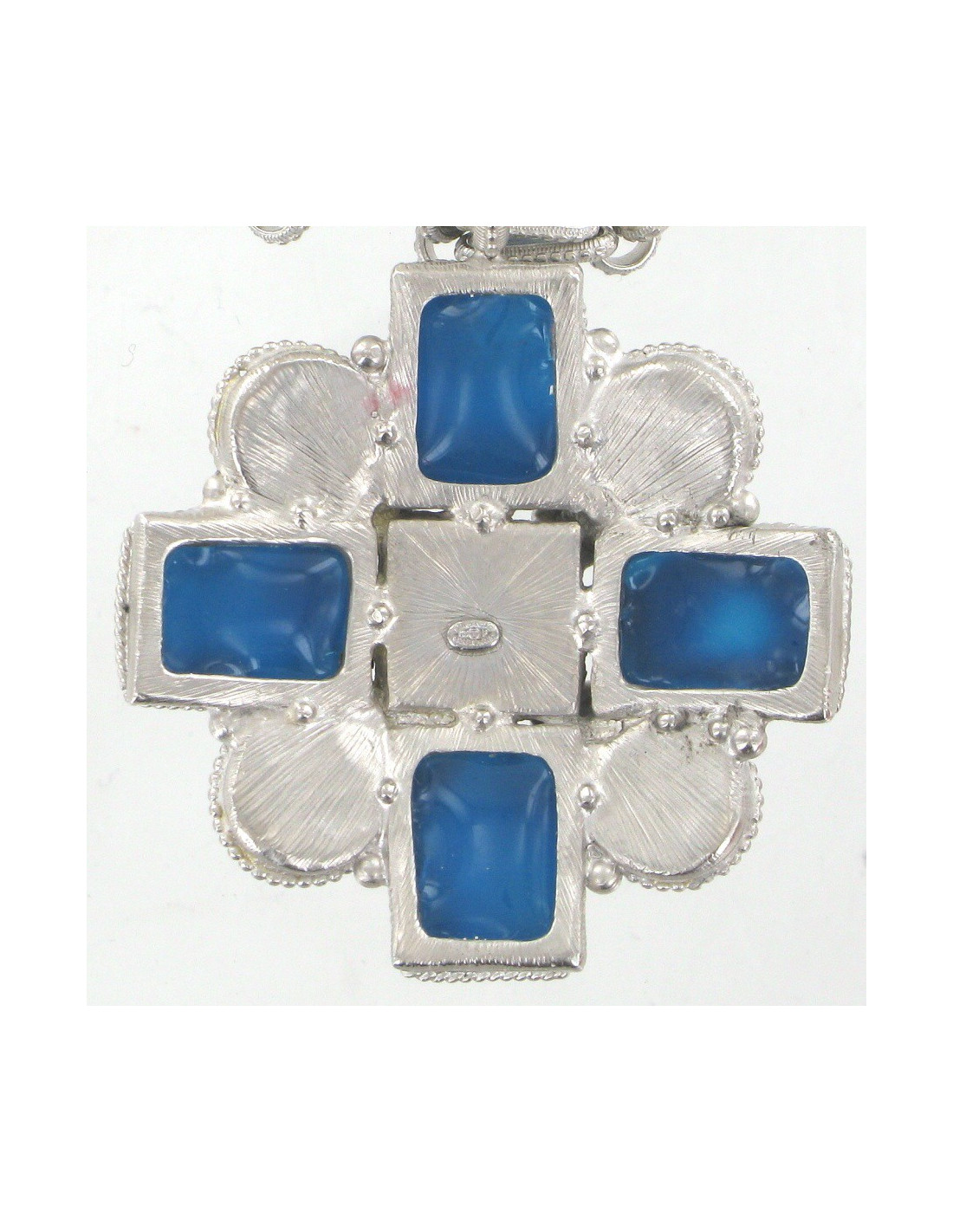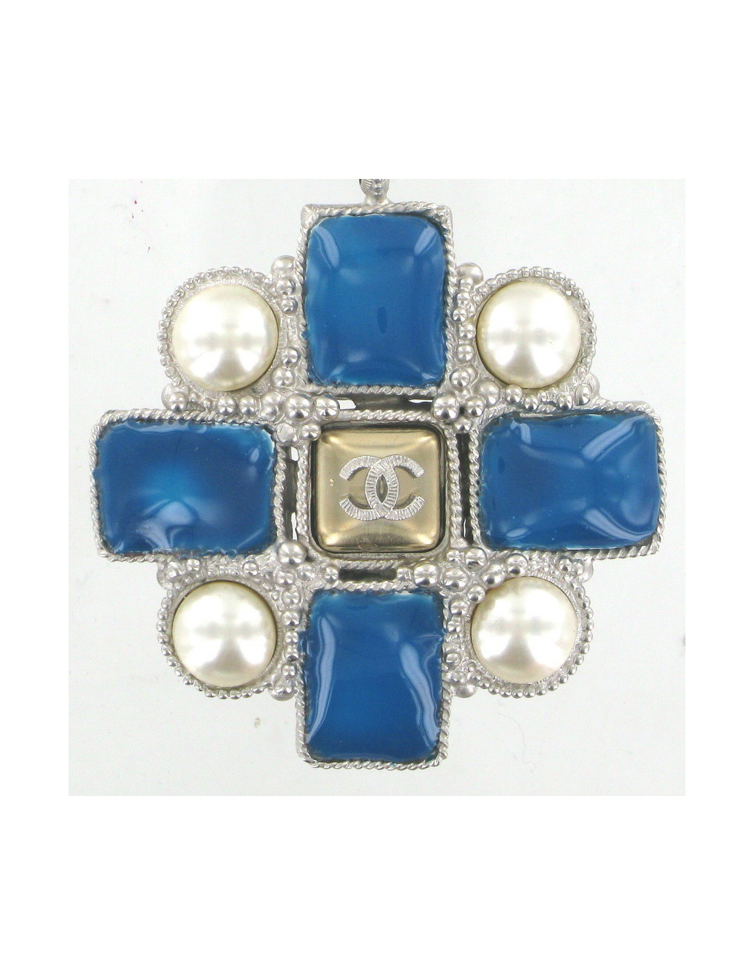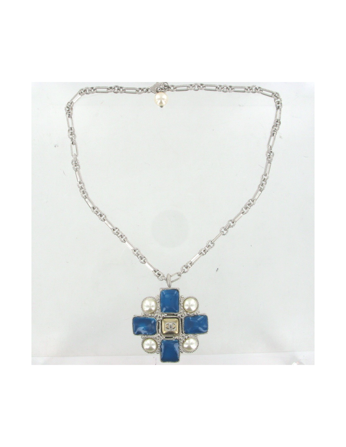 Sublime CHANEL pearls and paste glass cross necklace. The chiseled links chain is Matt silver metal. The pendant is a Matt silver metal cross, set of pearly beads and blue glass paste overseas. Beautiful jewel Couture.