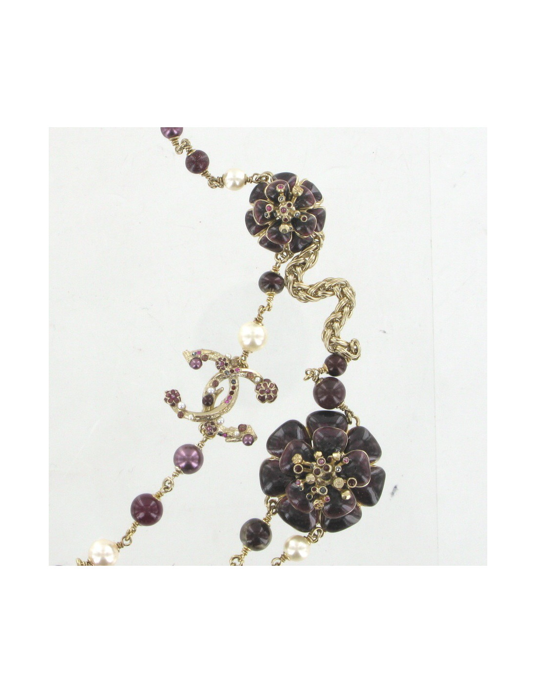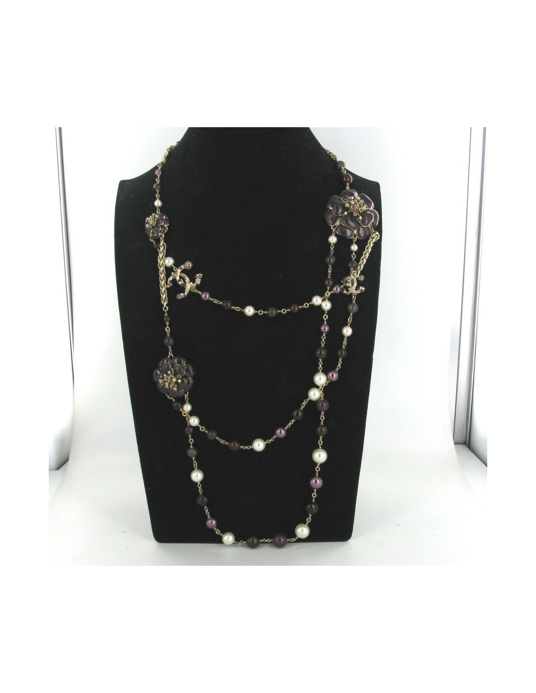 Sublime necklace triple ranks CHANEL. He composed of beads purple, purple and pearly, 3 camellias in different purple sizes set Rhinestones, and 2 CC metal pale gold set with Rhinestones.