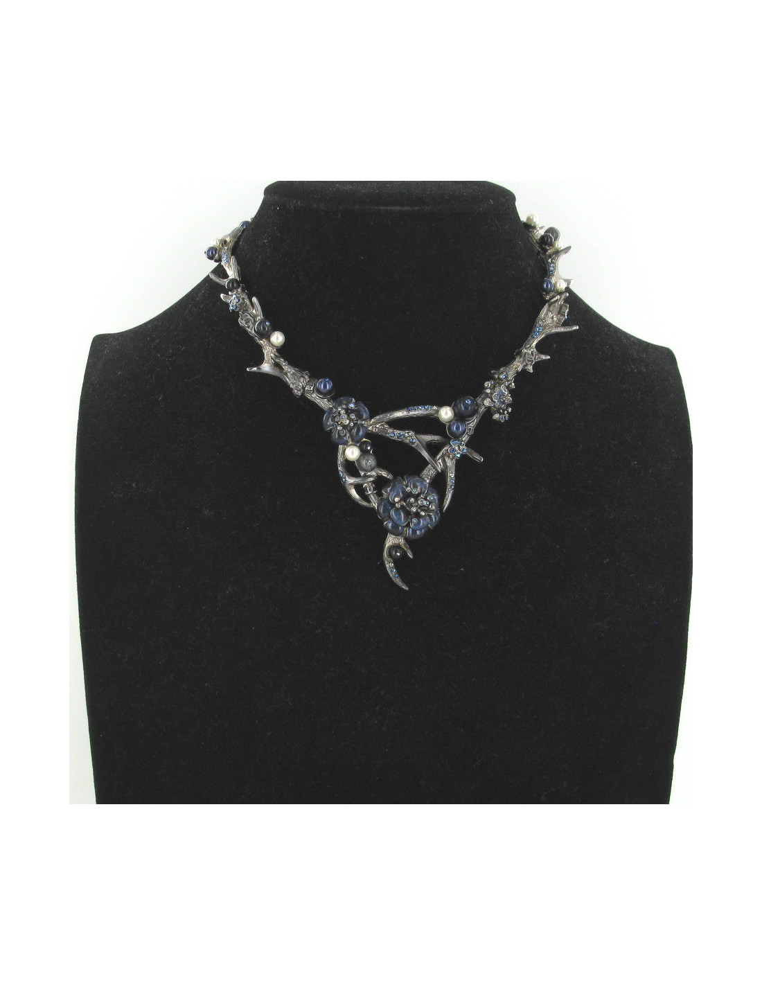 It is composed of deer metal ruthenium set with pearls, pearly, black and blue, blue and white Rhinestones, and two blue Camellia night set with Rhinestones.