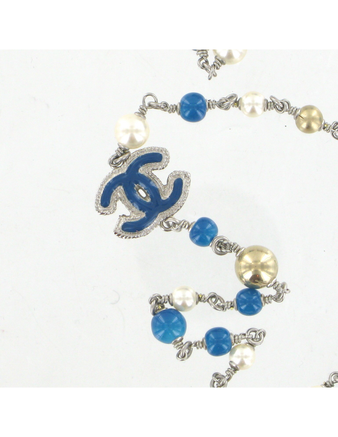 Beautiful necklace CHANEL multicolor pearls (blue, gold, pearly) and CC. The metal parts are silver Matt, pearls are pearly, overseas blue and pale gold. And there are two CC in Matt silver metal enamelled blue overseas. Can be worn in single or double tour.