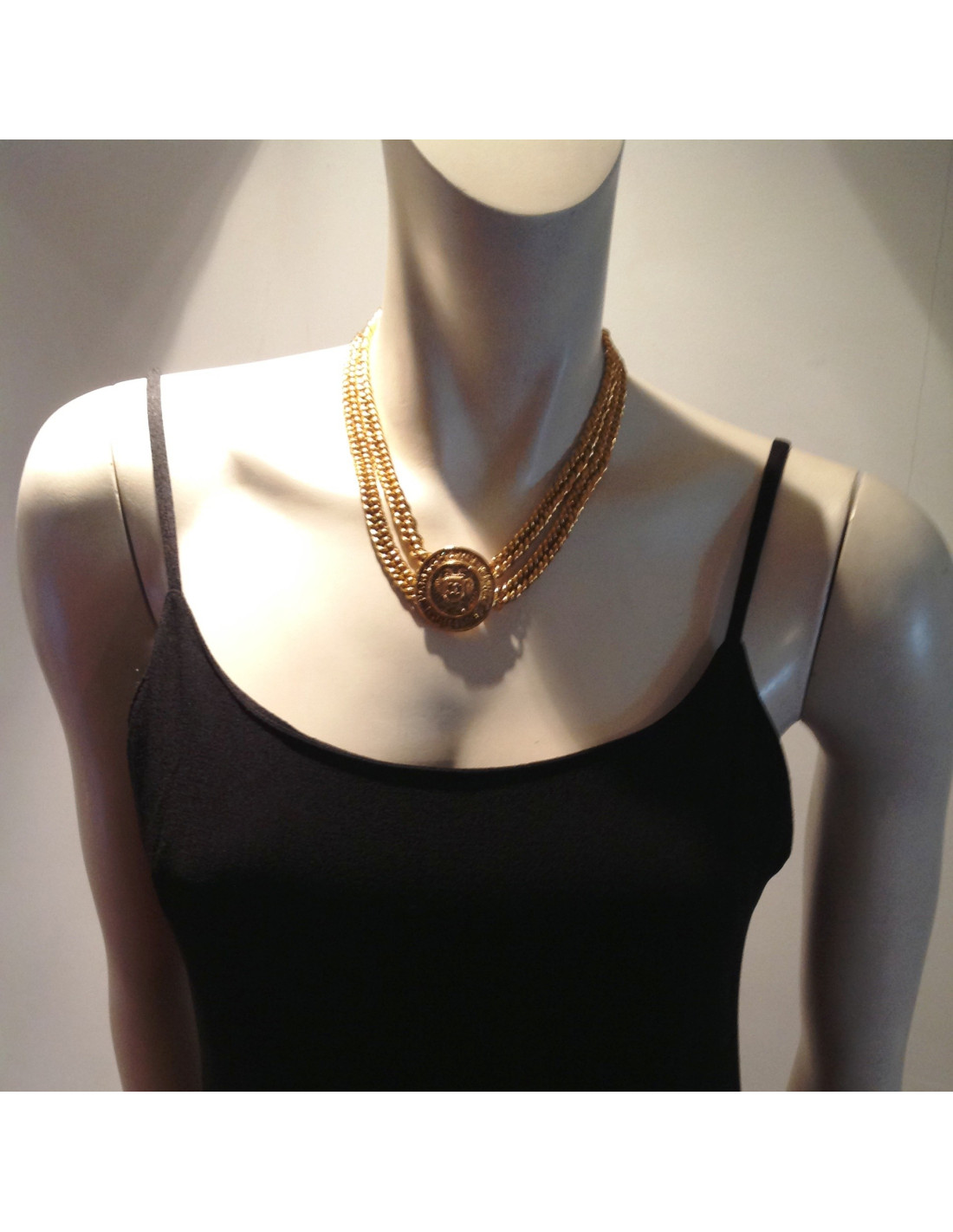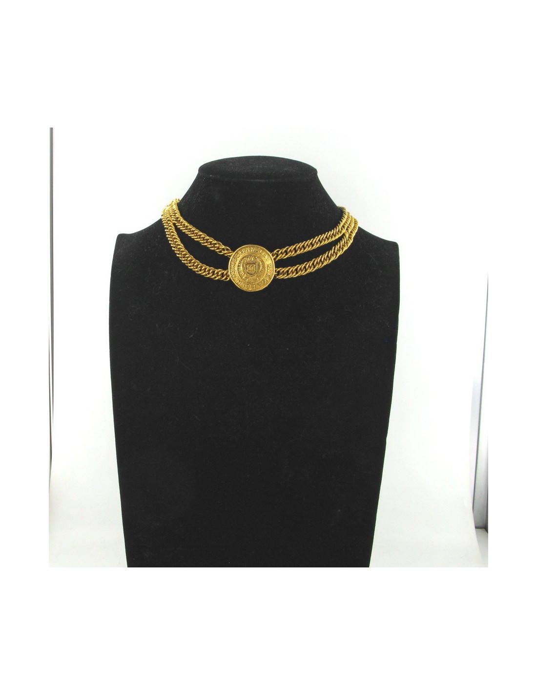 CHANEL vintage necklace composé d'une double chaine en métal doré et d'un médaillon au centre rue Cambon, siglé CC.