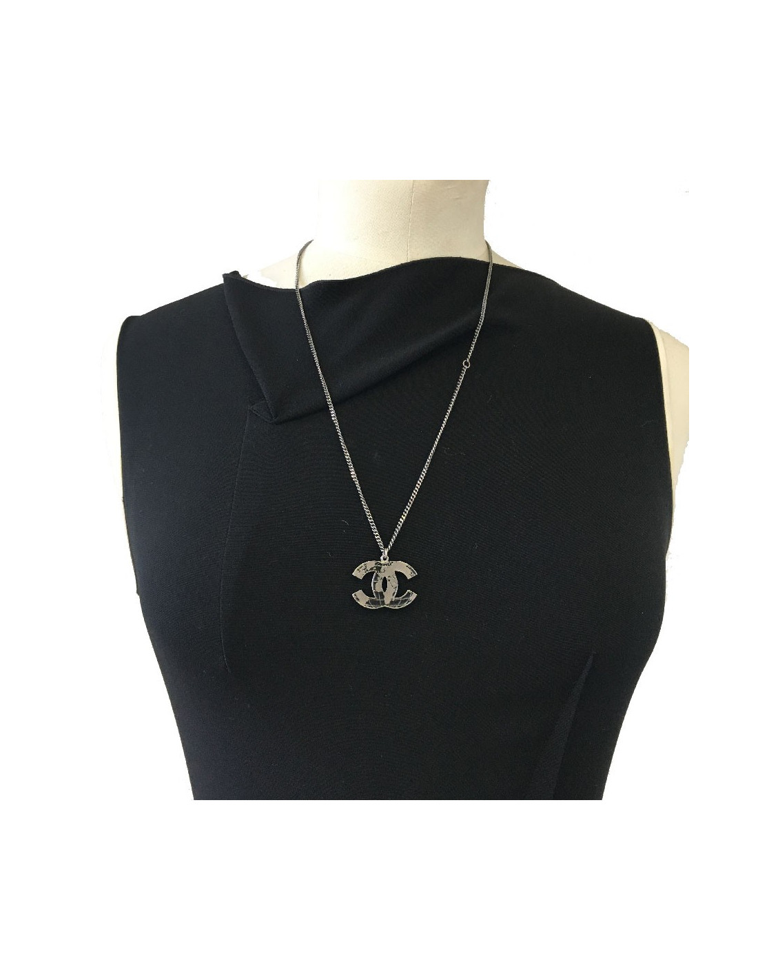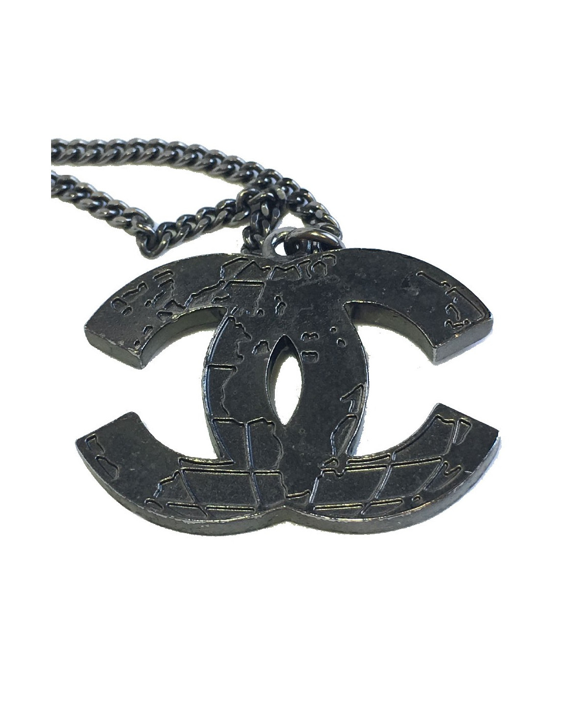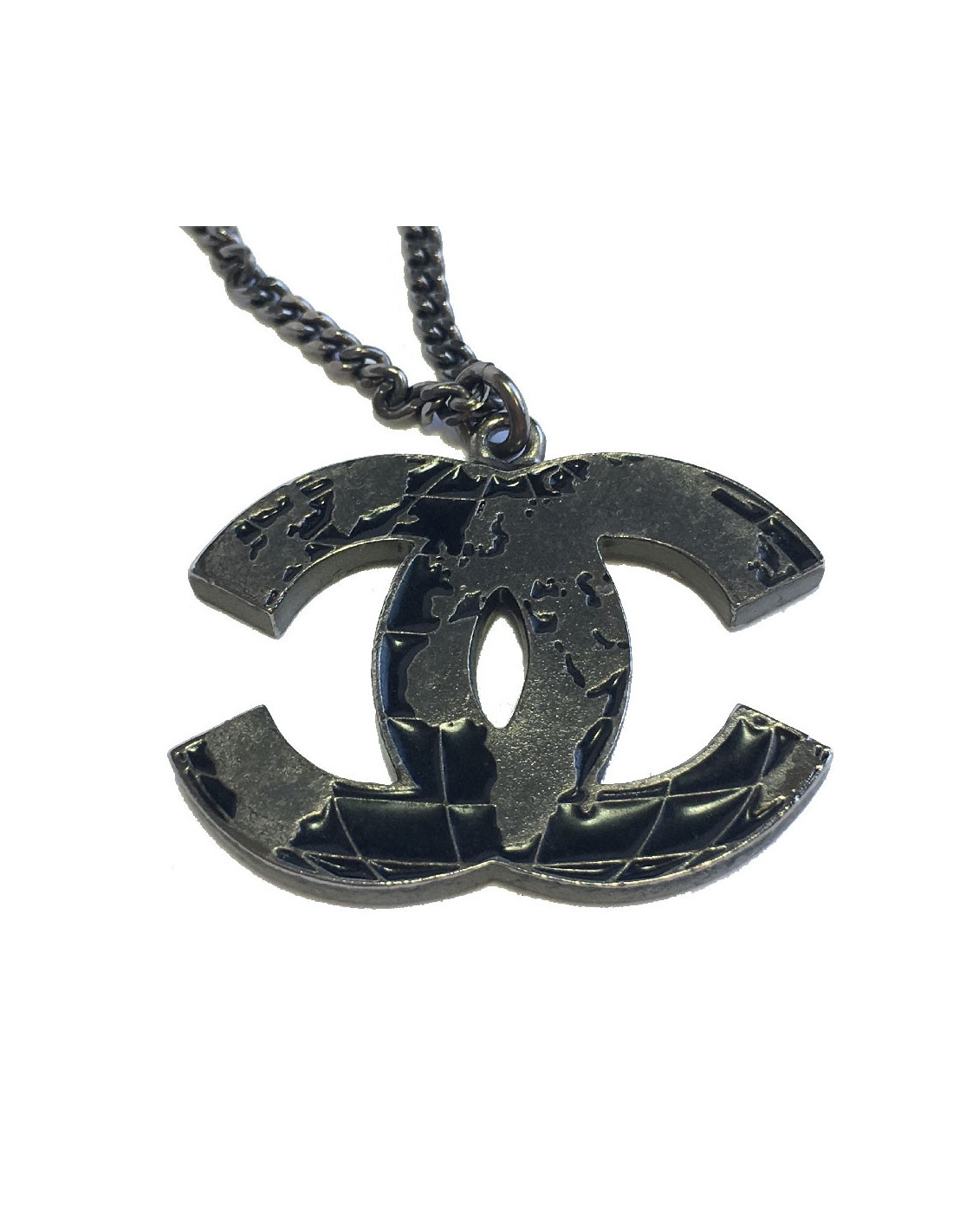 Chanel CC necklace in ruthenium metal. Pattern world map on the CC.
