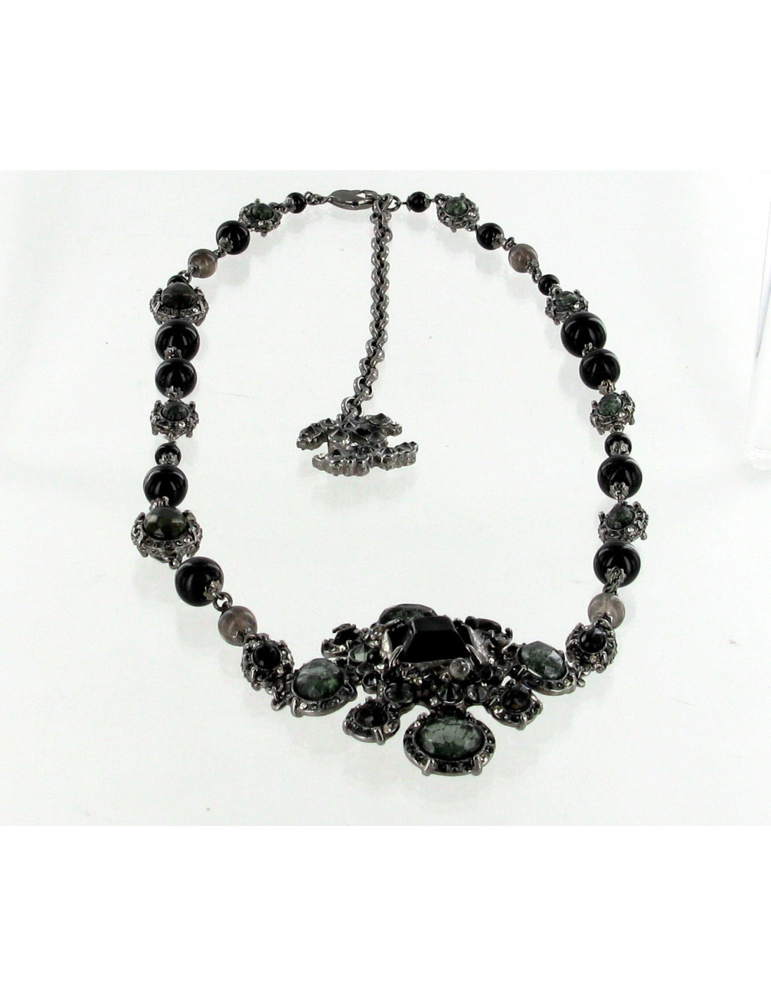 Elegant necklace beads and stones CHANEL. He is both the day and night. It consists of black pearls and smoked grey cabochons. Large jewel in the centre of the Saltire with the same beads and stones as the rest of the Saltire. CC logo at the end of the inscrustee silver metal chain small stones black and gray smoke.