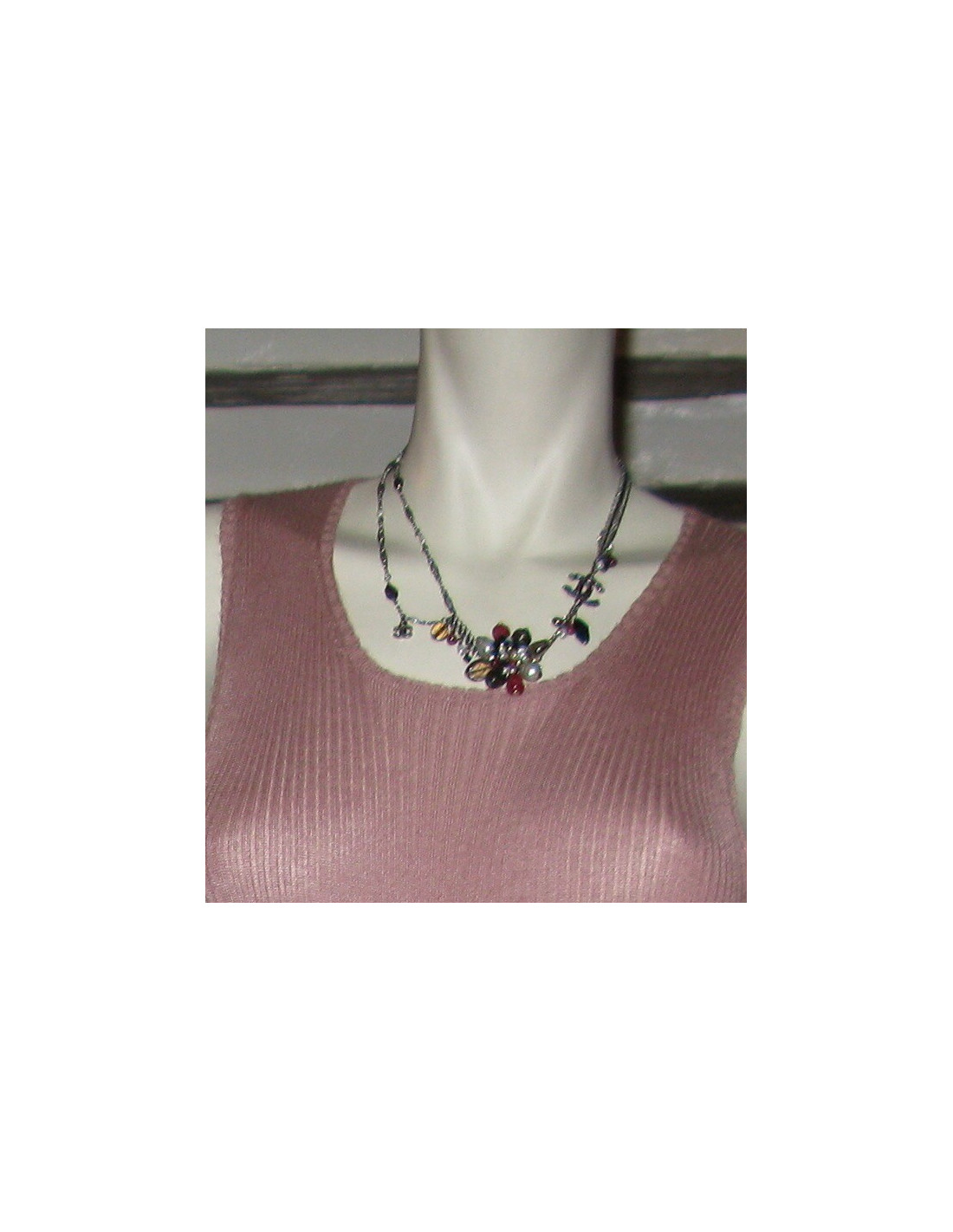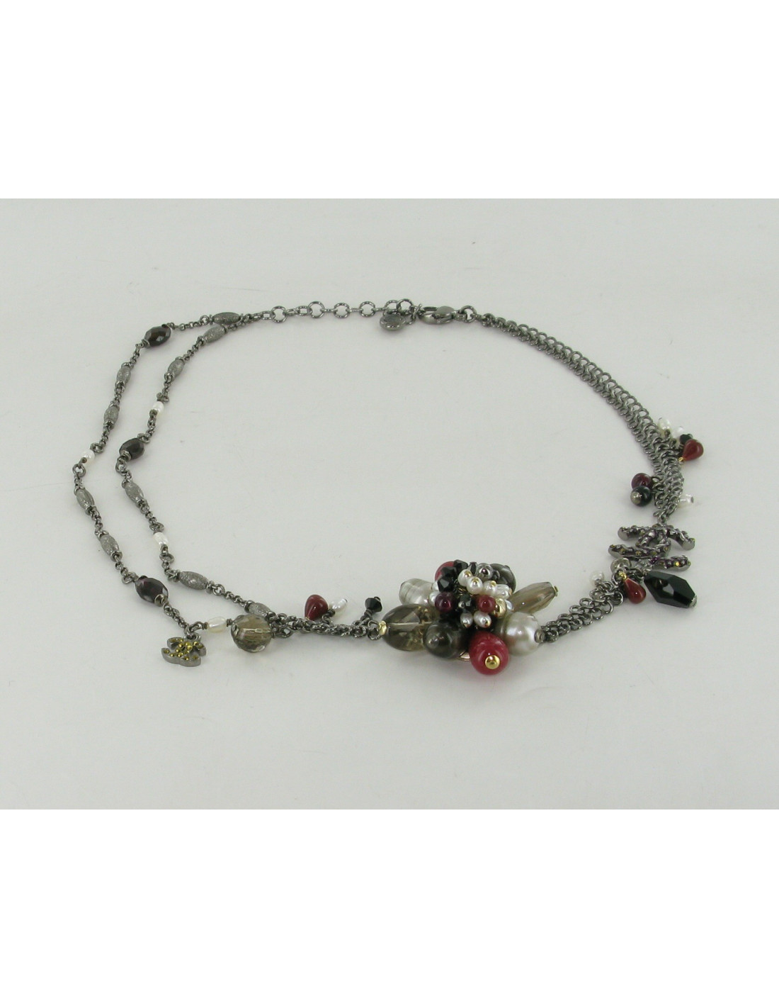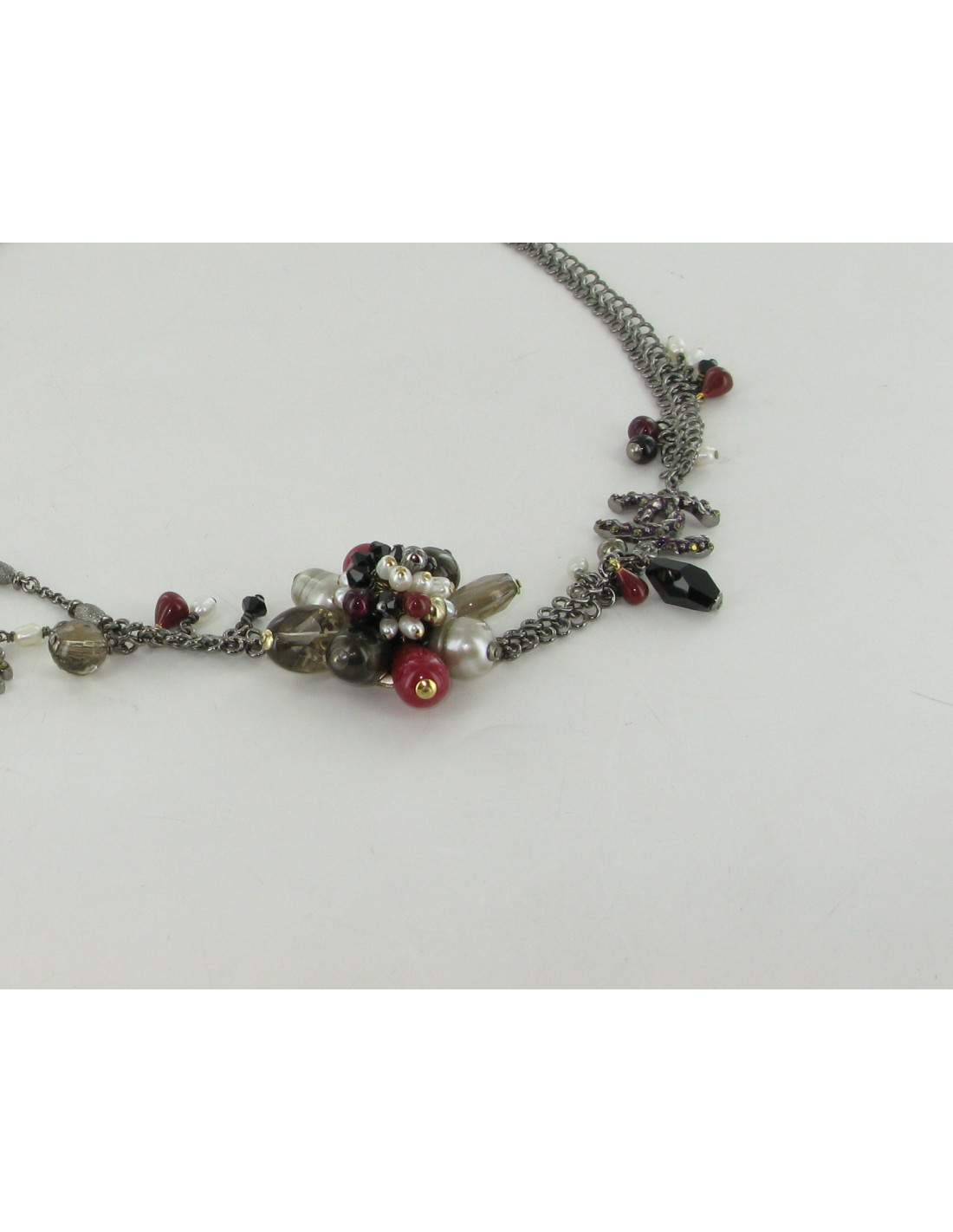 This short CHANEL necklace is decorated with a jewel flower. Metal chain silver with beads of color: red, white, silver and black. Each side of the chain is crimped acronym CC. The pendant is made of beads and joyful colors revealed: red, amber, white, Pearl Grey.