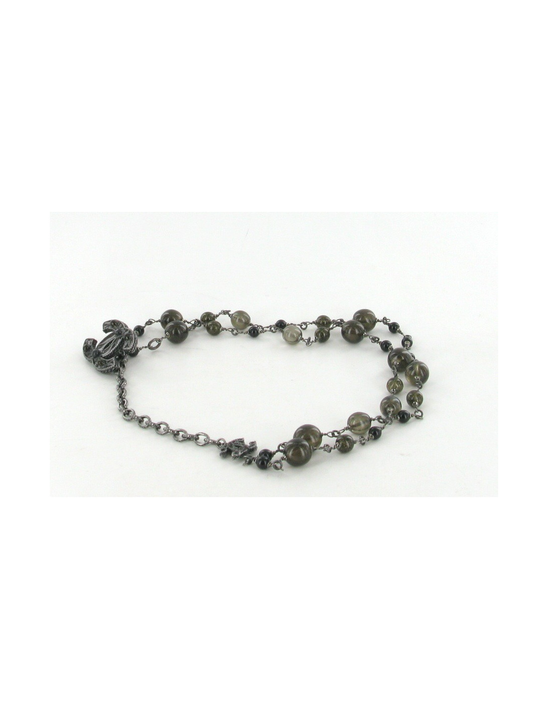 This lovely necklace CHANEL can also be worn as a belt. (Ruthenium) black silver metal chain is set with pearls tinted smoked. Each end of the chain is decorated with acronym cc silver black (ruthenium).