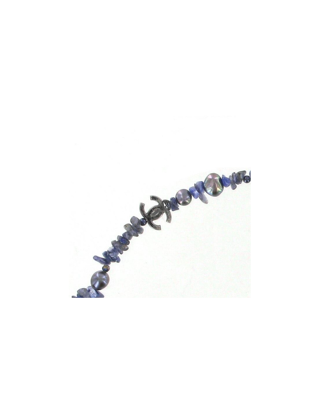 Classic grey blue CHANEL necklace of stones "lapis" and other, pearls and initials "CC" in silvery metal. Stones and pearls are of different sizes thus creating the charm of this necklace. Delivered in a nice Patil.