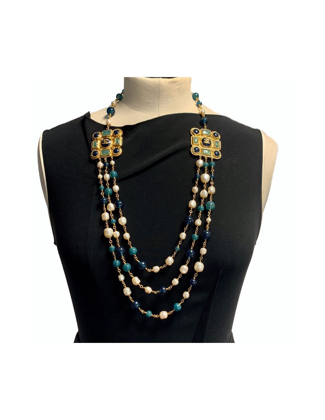 Last items in stock NECKLACES CHANEL grey pearly beads and Swarovski crystals imposing necklace CHANEL 36020 2,350.00 € CHANEL grey pearly beads and Swarovski crystals imposing necklace Condition : very goodMade in FranceMaterials : pearly beads, Swarovski crystalsColor : steel greyMeasurements : total length 117 cmHardware :ruthenium silver finish metalStamp : yesYear : Spring 2017Details :two strands of pearls, different shades of gray and alternating dark gray Swarovski... Add to cart