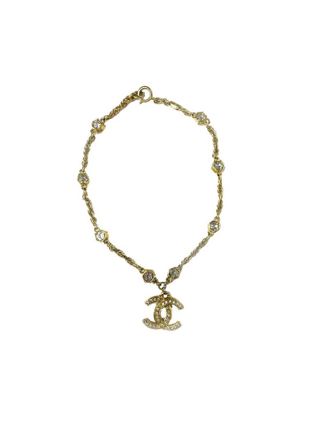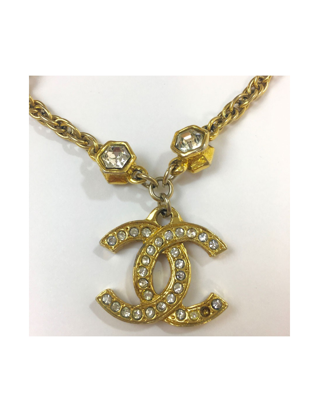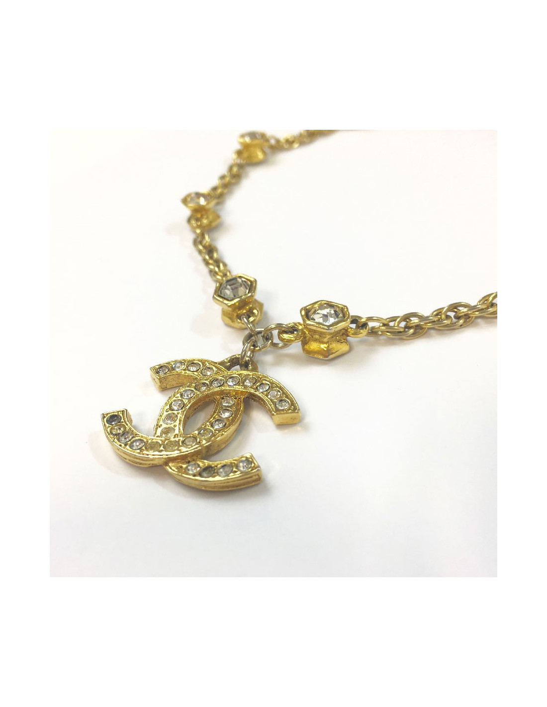 Chanel vintage chain necklace in gilt metal, CC pendant set with brilliants, hexagonal rhinestones.
