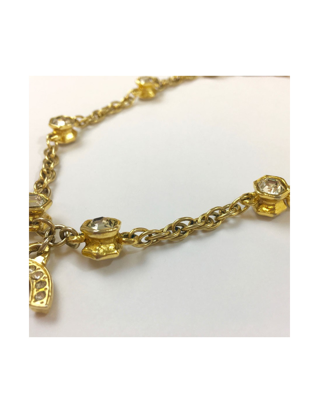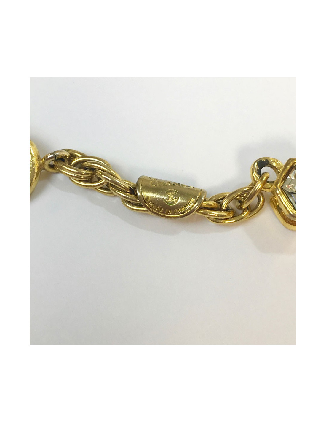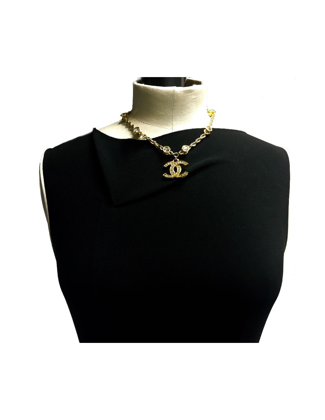 Chanel vintage chain necklace in gilt metal, CC pendant set with brilliants, hexagonal rhinestones.
