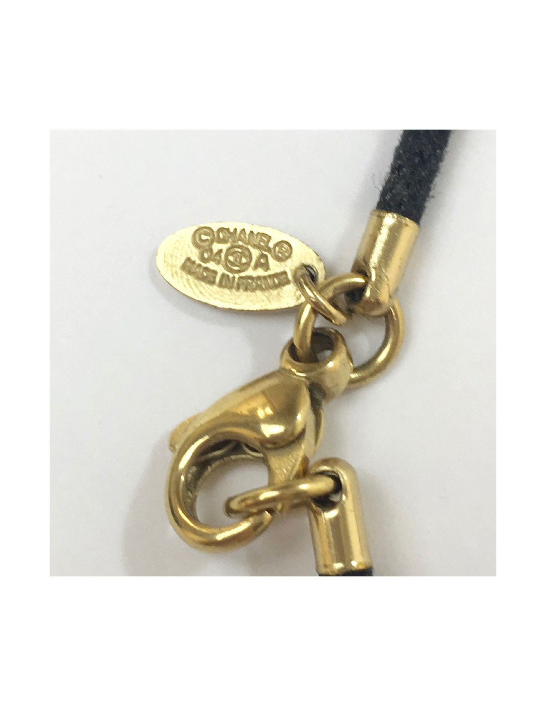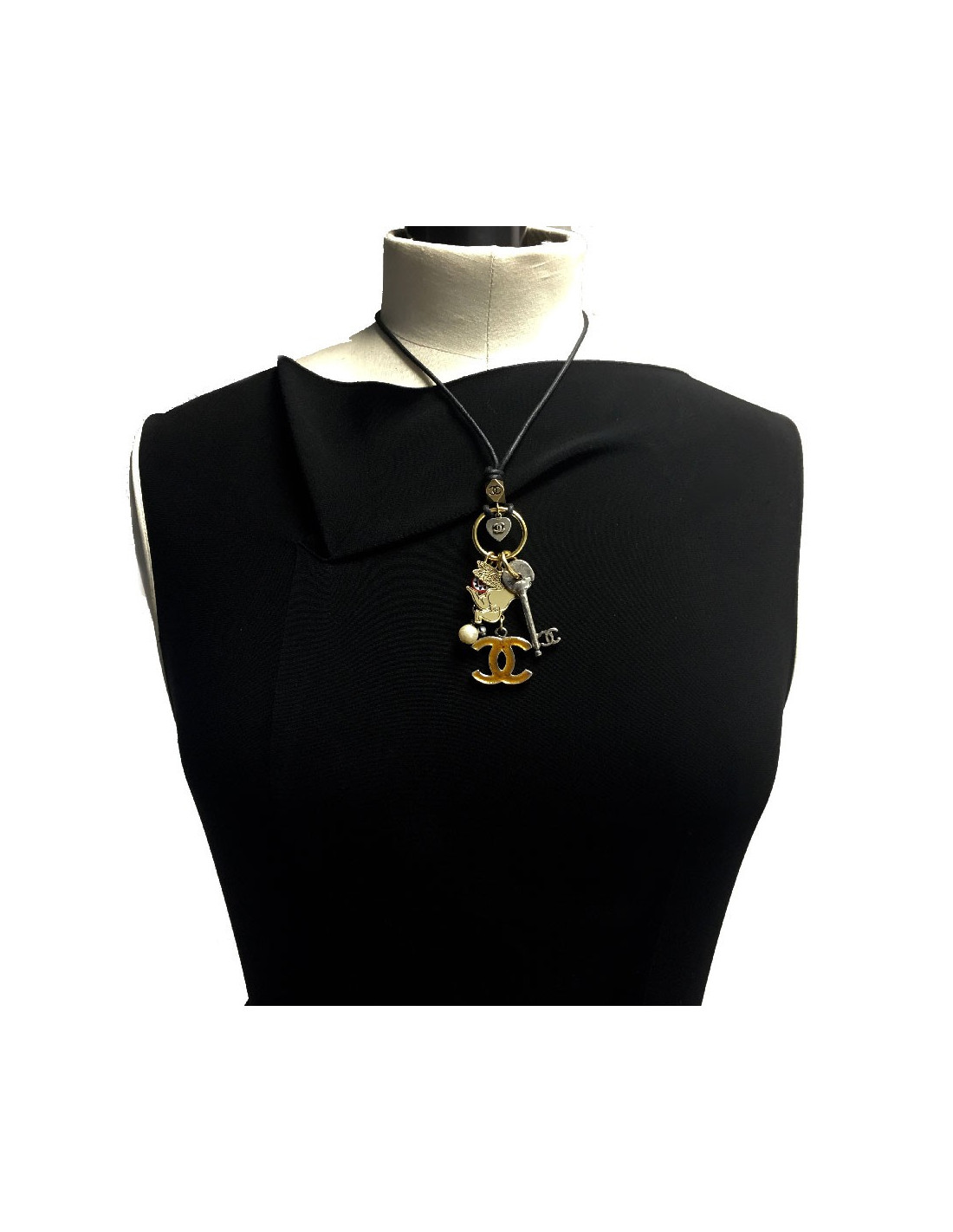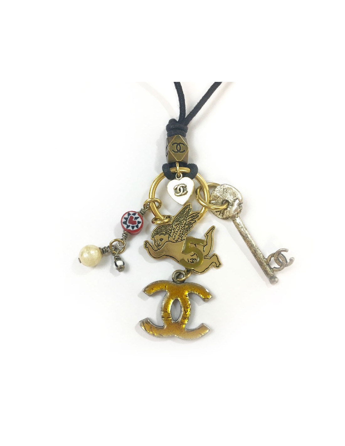 Chanel link necklace in black cord, charms (key, cc, angel, heart) in silver and gold metal.
